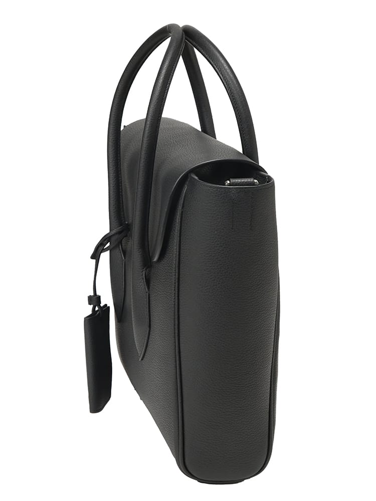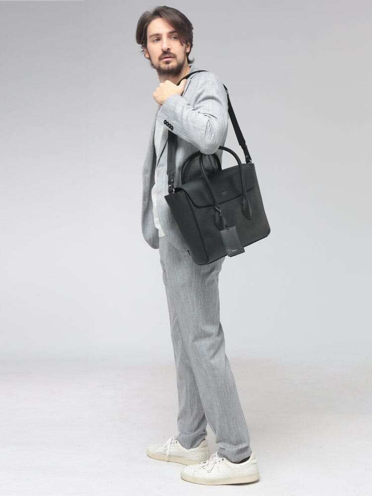 洗練されたミニマリズムを体現するメンズ2WAYトートバッグが登場。きめ細やかで上質なカーフレザーを贅沢に使用し、ビジネスシーンに不可欠な品格と都会的なモード感を両立させました。最大の特徴は、防犯性とデザイン性を兼ね備えたフラップ式のメイン収納口で、内部はジップ開閉により大切な書類や荷物を確実に保護。内装には小物の整理に便利なジップポケットを配した、無駄のない機能美が魅力です。付属のストラップでショルダーバッグとしても活用でき、忙しい通勤時や出張でも軽快なスタイルを演出。イタリアの職人技が息づくフラップデザインが、周囲と差をつける知的なビジネススタイルを完成させる逸品です。