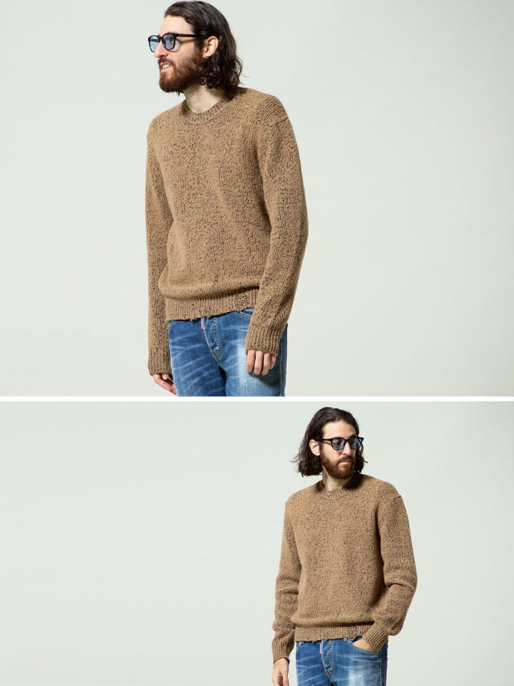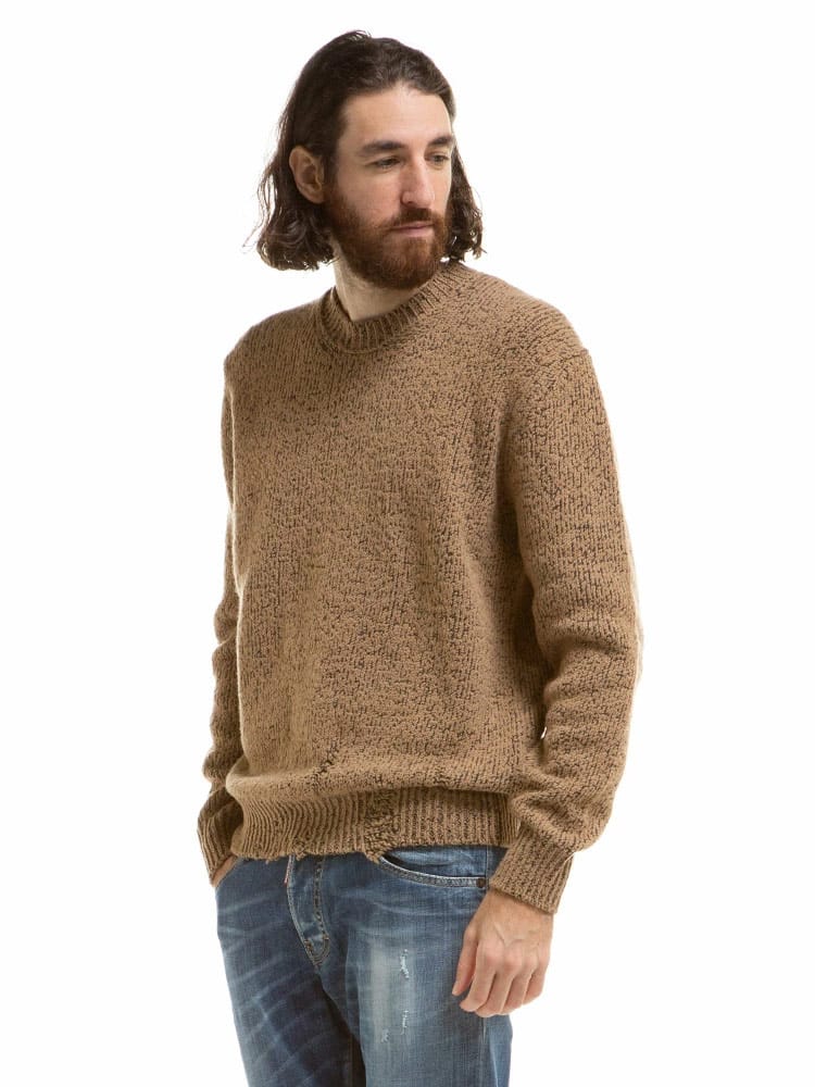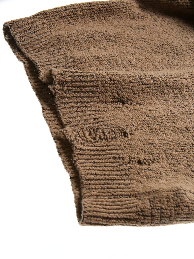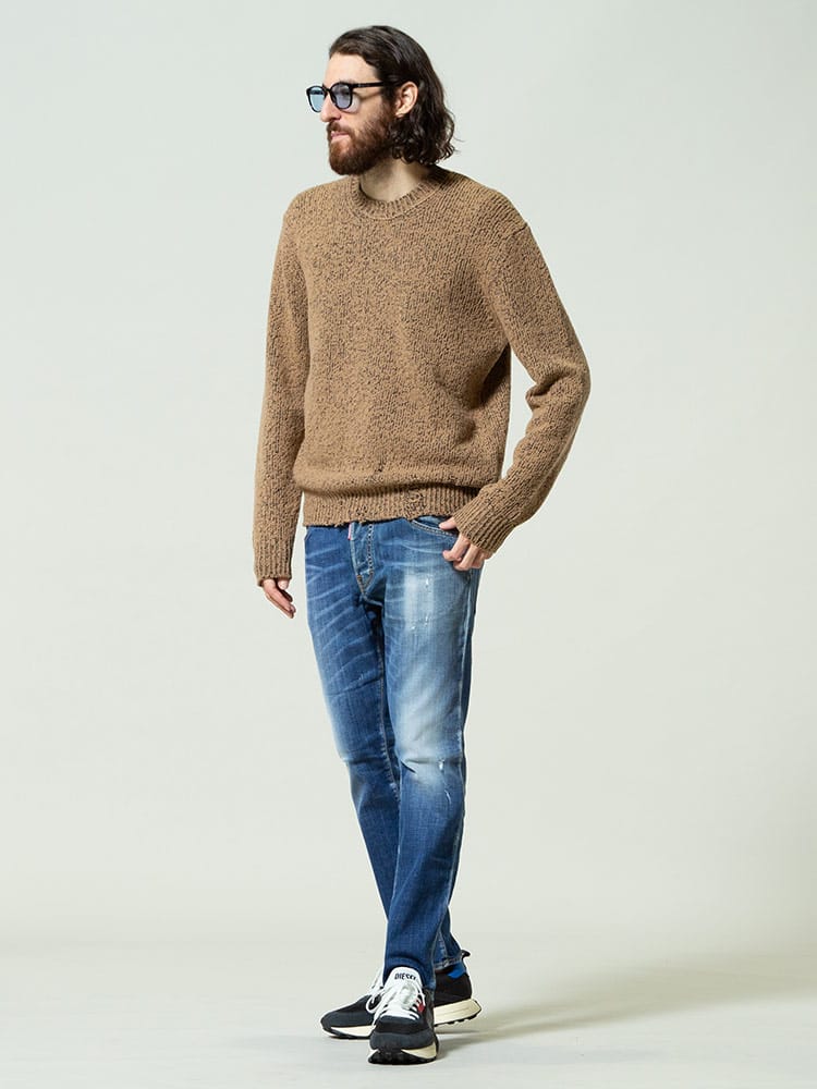 ダメージ加工加工がされた武骨なニットセーターです。ざっくりとしたローゲージ編みはカジュアルコーデにピッタリです。袖もしっかり長めで今っぽいですよね。ワンサイズ上げてゆったりでもかっこいいですよ。