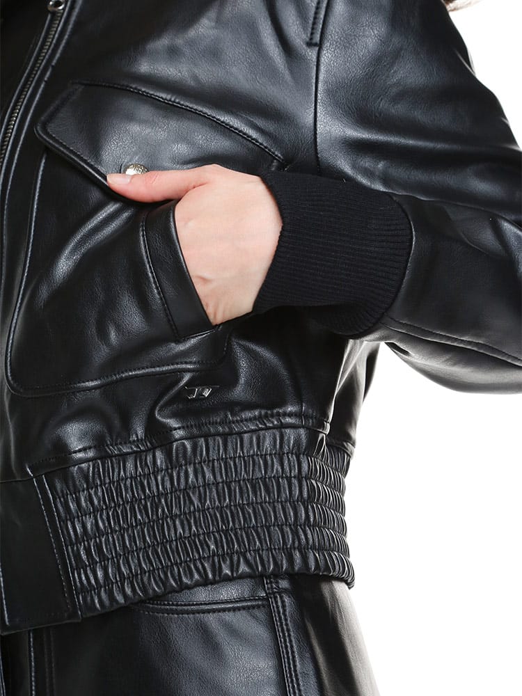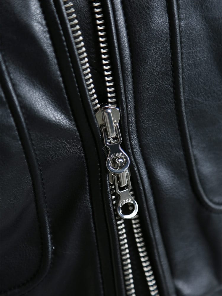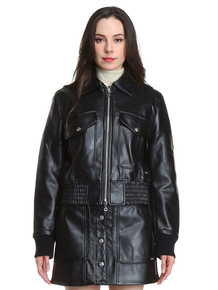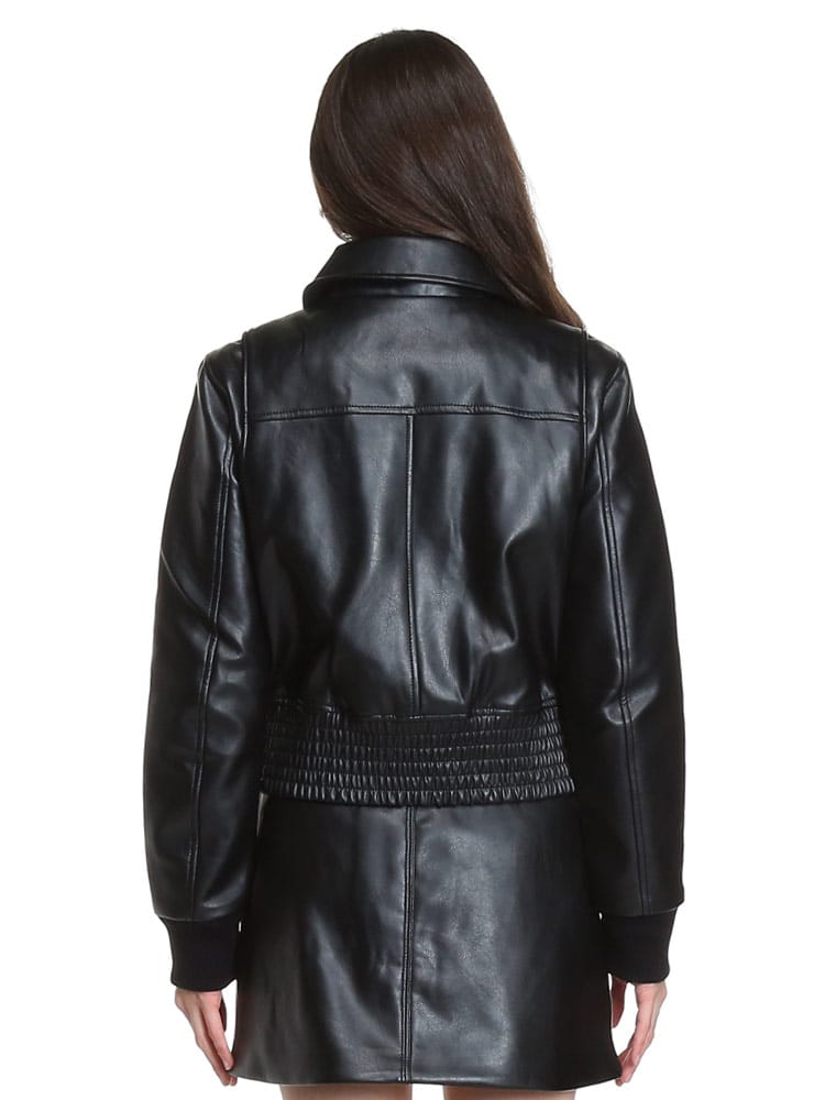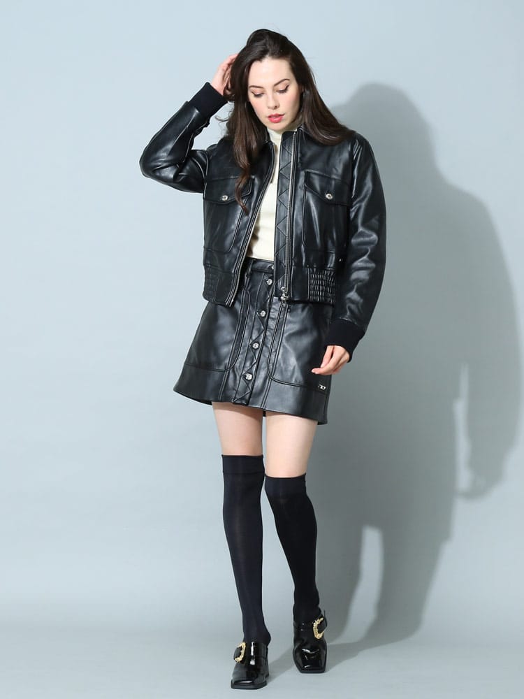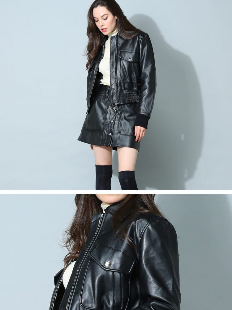 コンパクトなシルエットに大きな3Dポケットが印象的なフェイクレザージャケット。マットな素材でリッチ感のある落ち着いた印象のアウターはキルティングを裏地に施し、保温効果もあります。ブラックカラーのシンプルデザインで秋冬のアウターにマストな一着です。