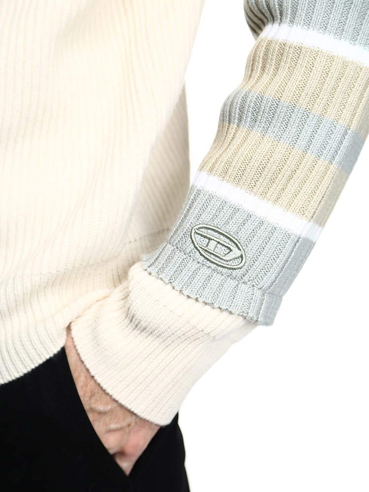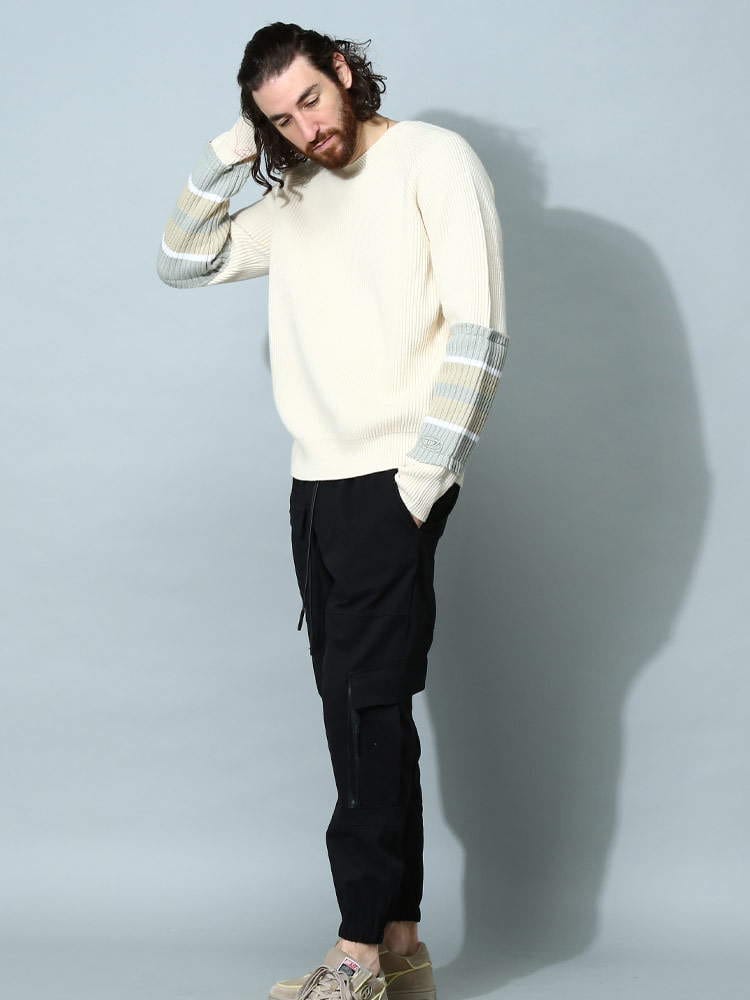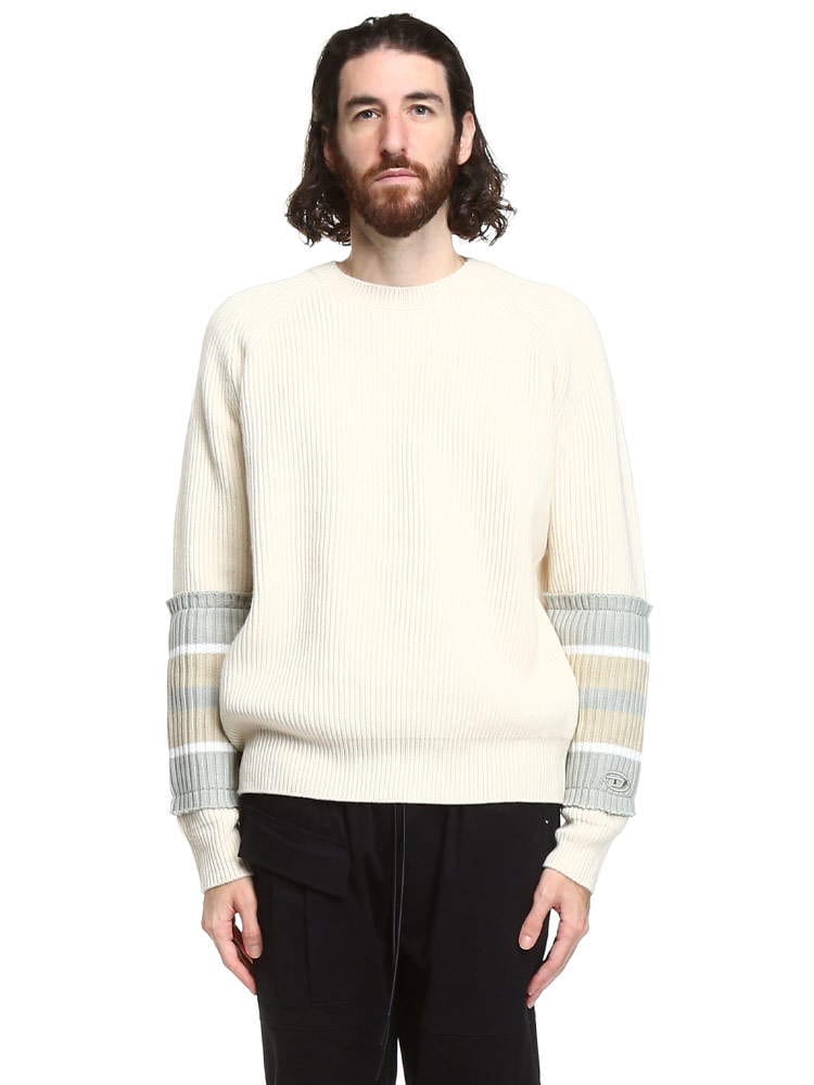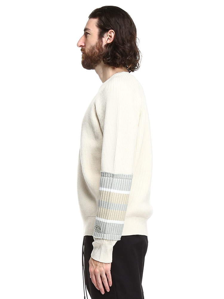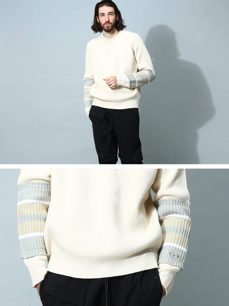 スリーブにボーダーのリブニットを大胆に施したシンプルながら特徴あるアイテムが登場。リブニットのエッジにはダメージトリートメントが施されたディーゼルならではのこだわりあるデザイン。ラグランスリーブのレギュラーフィットシルエットはこなれたリラックスムードを演出。すっきりとしたボトムでも、あえてルーズフィットのボトムと組み合わせてもマッチする万能デザインが◎。飽きのこないシンプルなデザインは女性でもオーバーサイズで着こなしてカップルでシェアするのもおススメです。