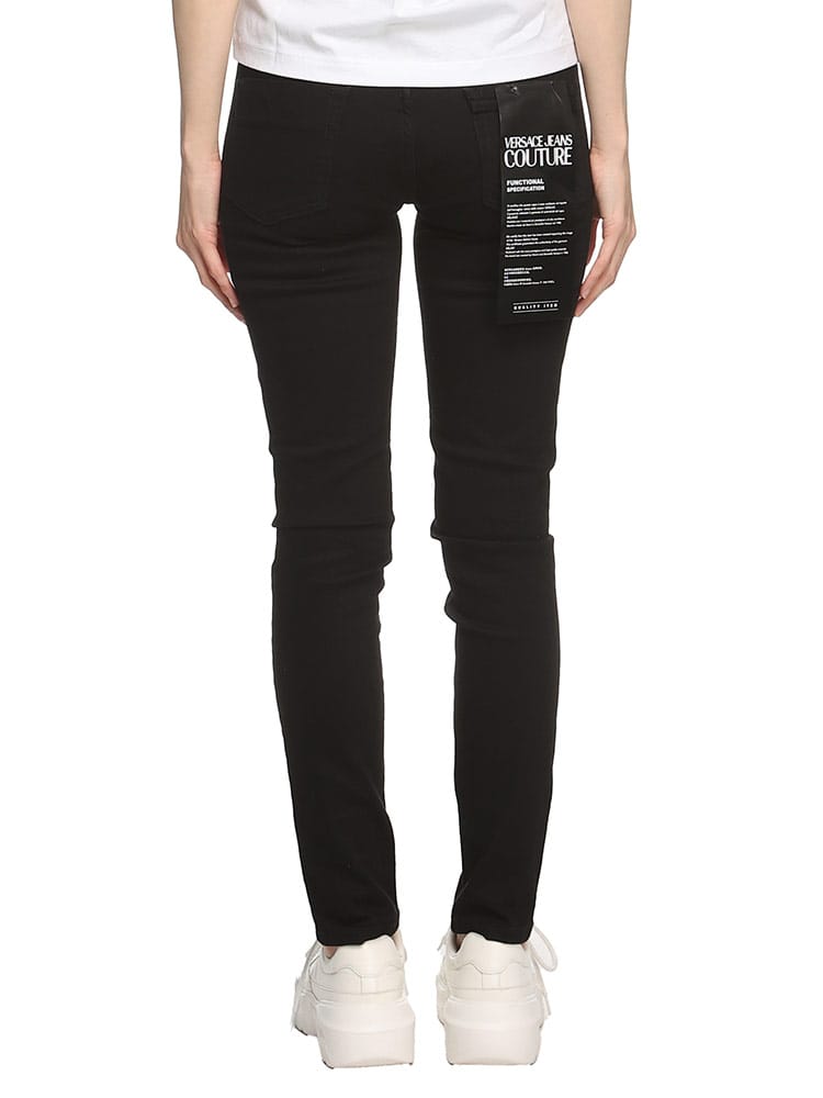 5 ポケットデザインのスキニー ジーンズ。フロント面サイドには、ピース ナンバー ロゴ パッチ付き。メドゥーサ ボタンのディテール、レザー ロゴ パッチ、バックのインスティトゥーショナル ロゴ ハードウェア仕上げ。