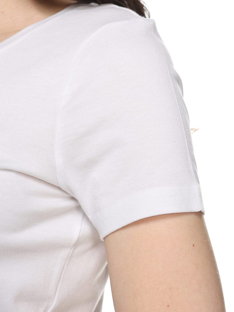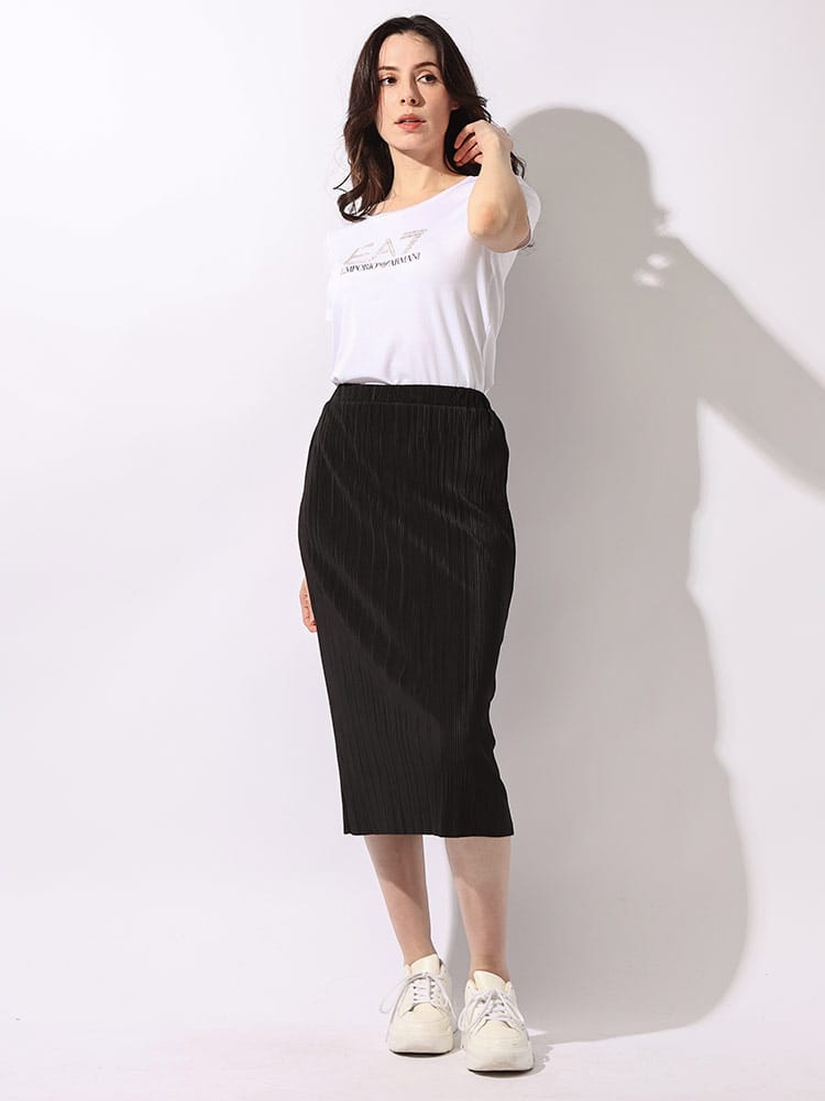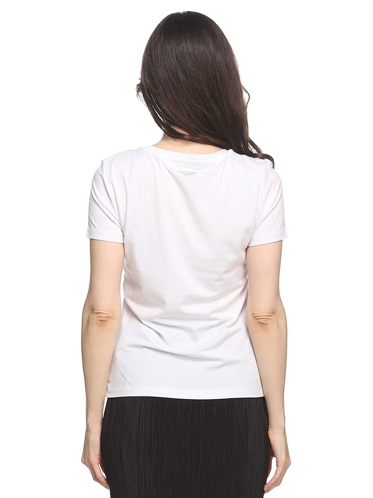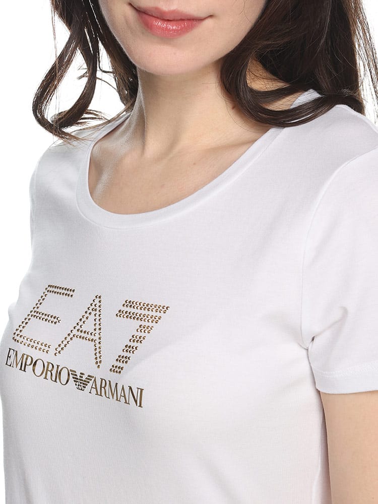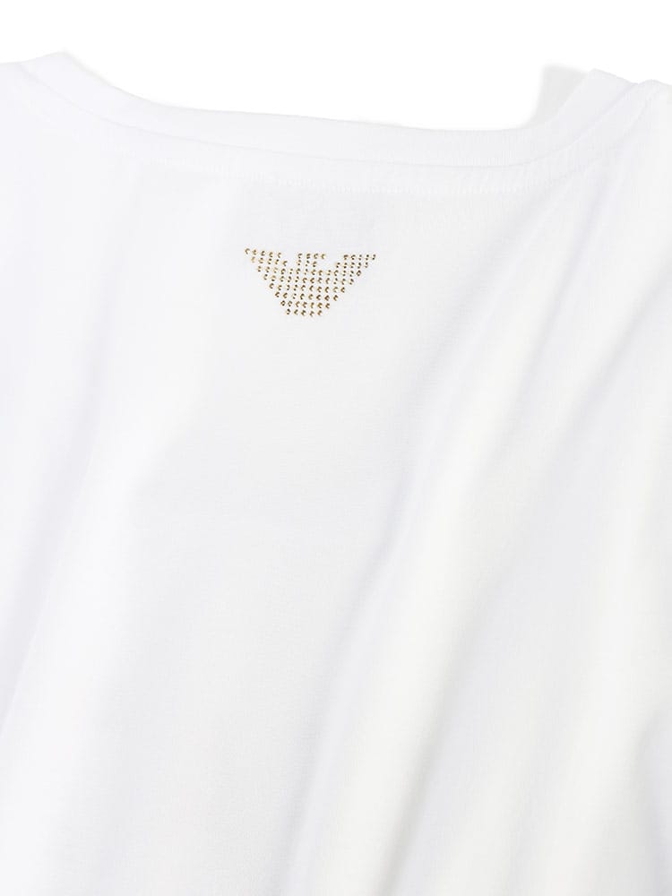 ストレッチ感のあるEA7半袖Tシャツ。シェイプされたラインが身体をスマートに見せるシルエットが魅力です。フロントにはラインストーンでEA7ロゴを象ったデザインとなっています。