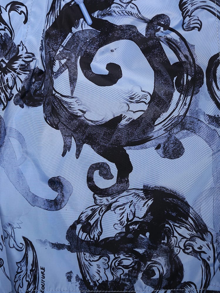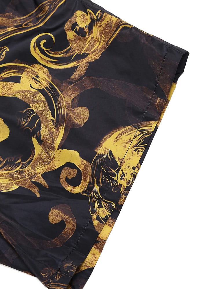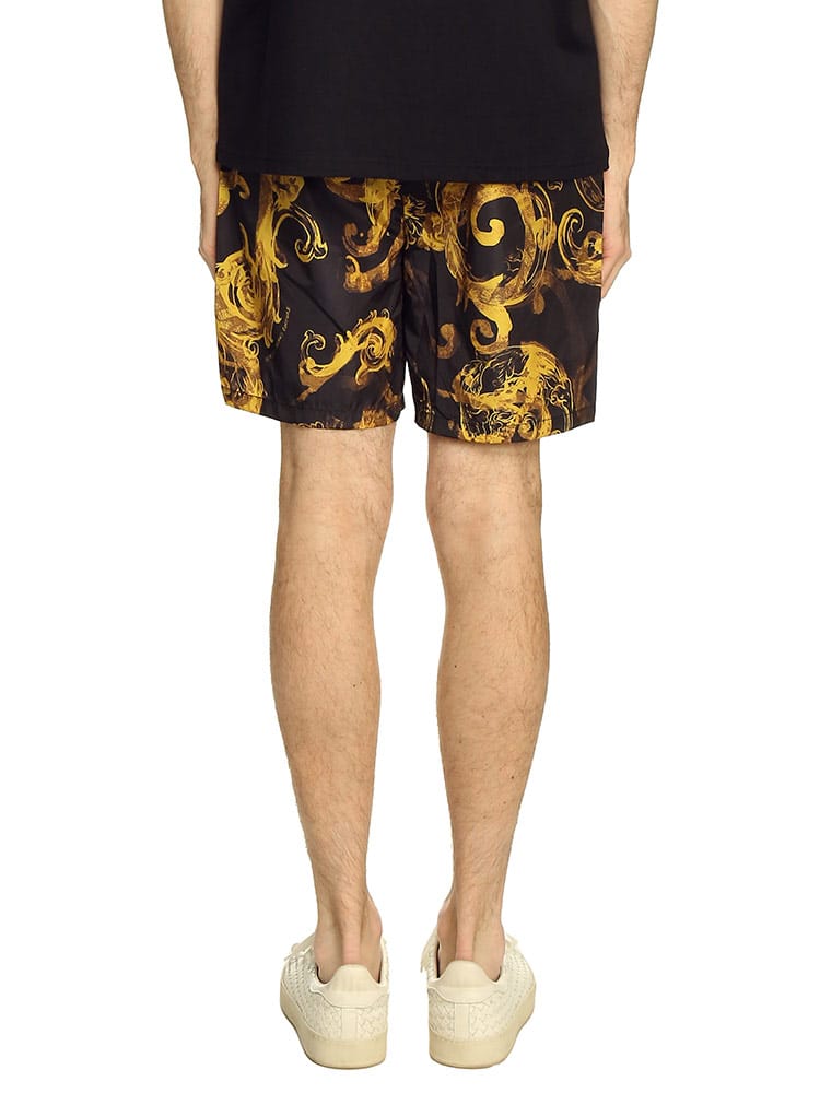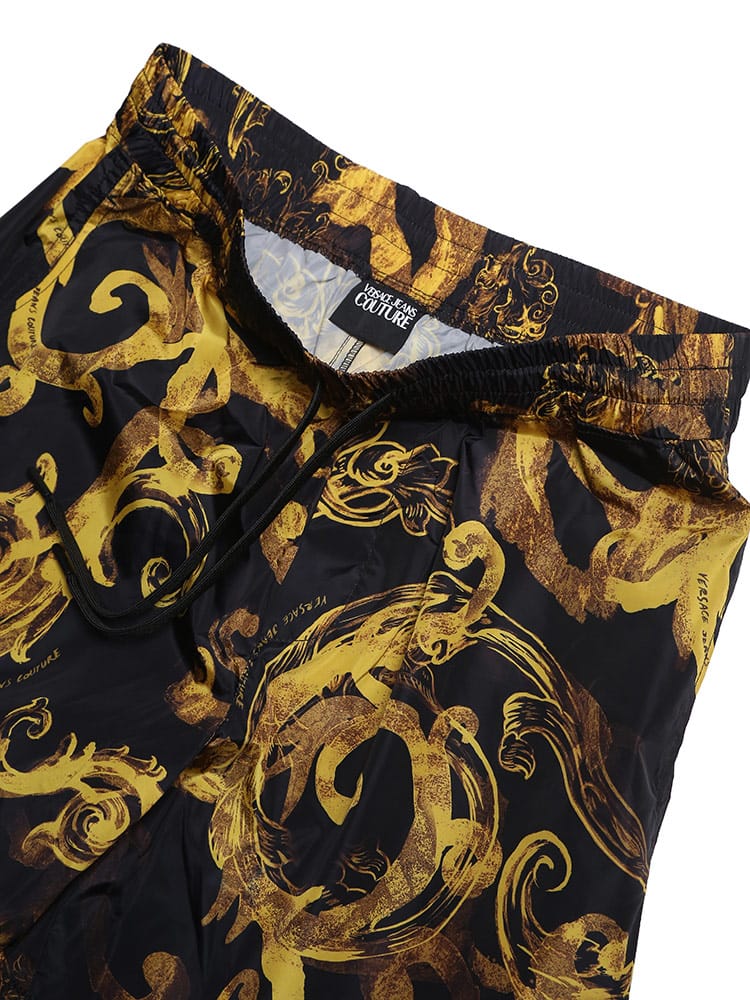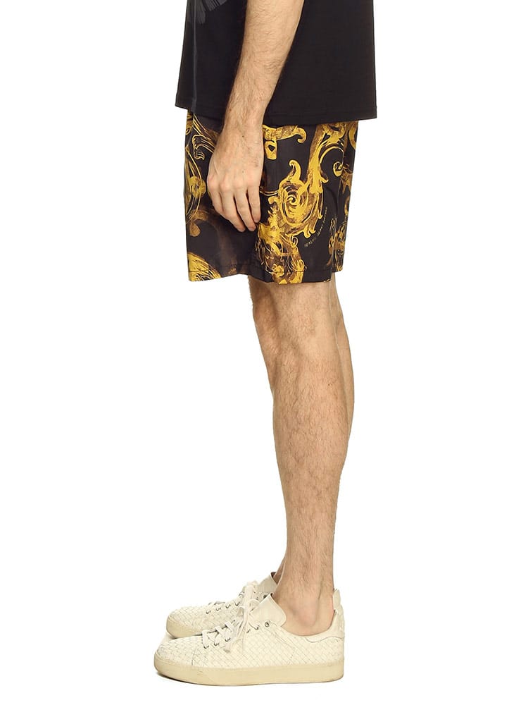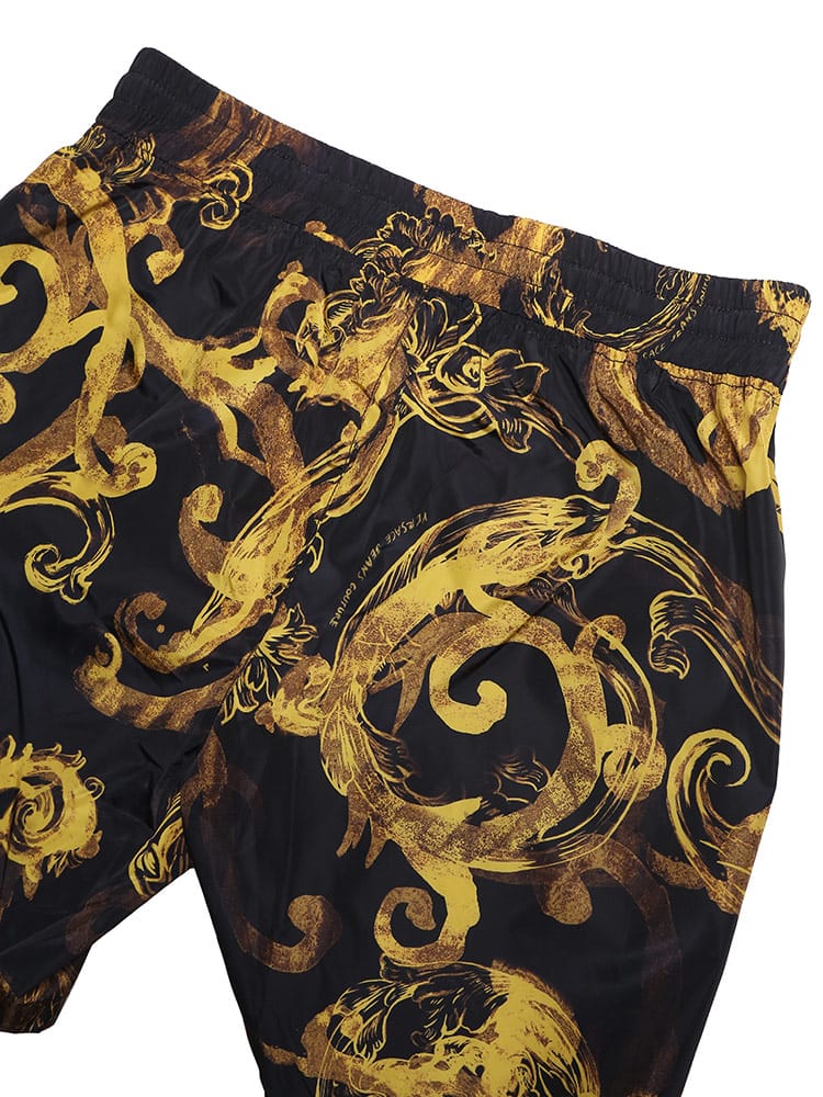 ブラックとゴールドのヴェルサーチェ ジーンズ クチュールの典型的なプリントが施されたショートパンツ。