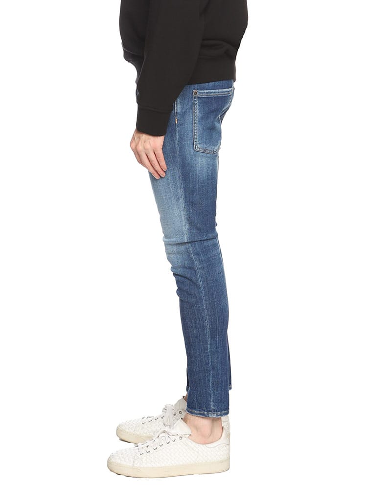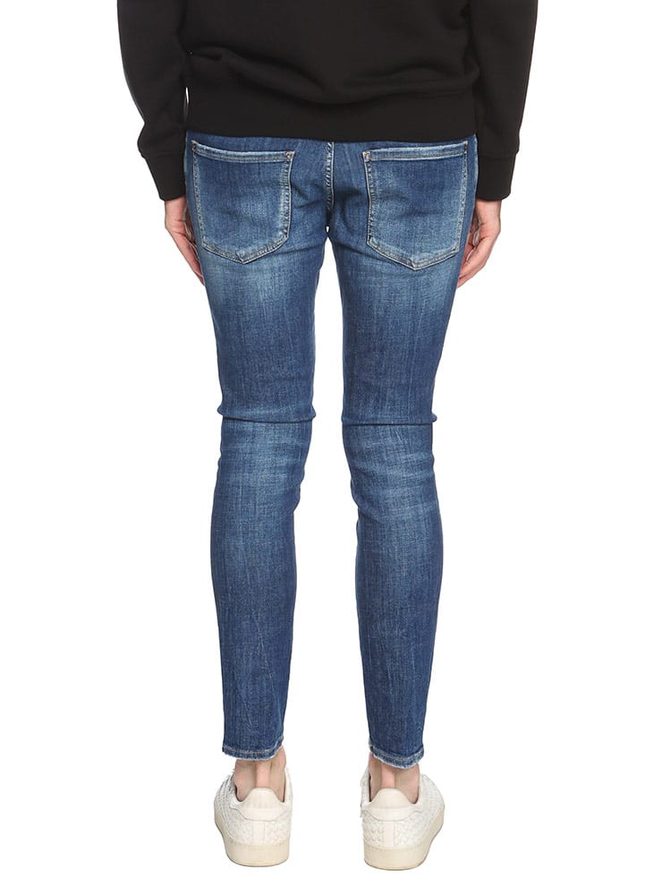 ダメージ加工の箇所までこだわった、スキニーフィットの「Super Twinky」ジーンズ。オリジナルのプリントをあしらったタイトフィットのTシャツ、タッセルジャケット、レザーのアンクルブーツなど、ロックなテイストの効いたコーディネートに