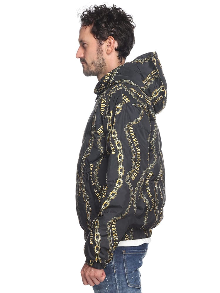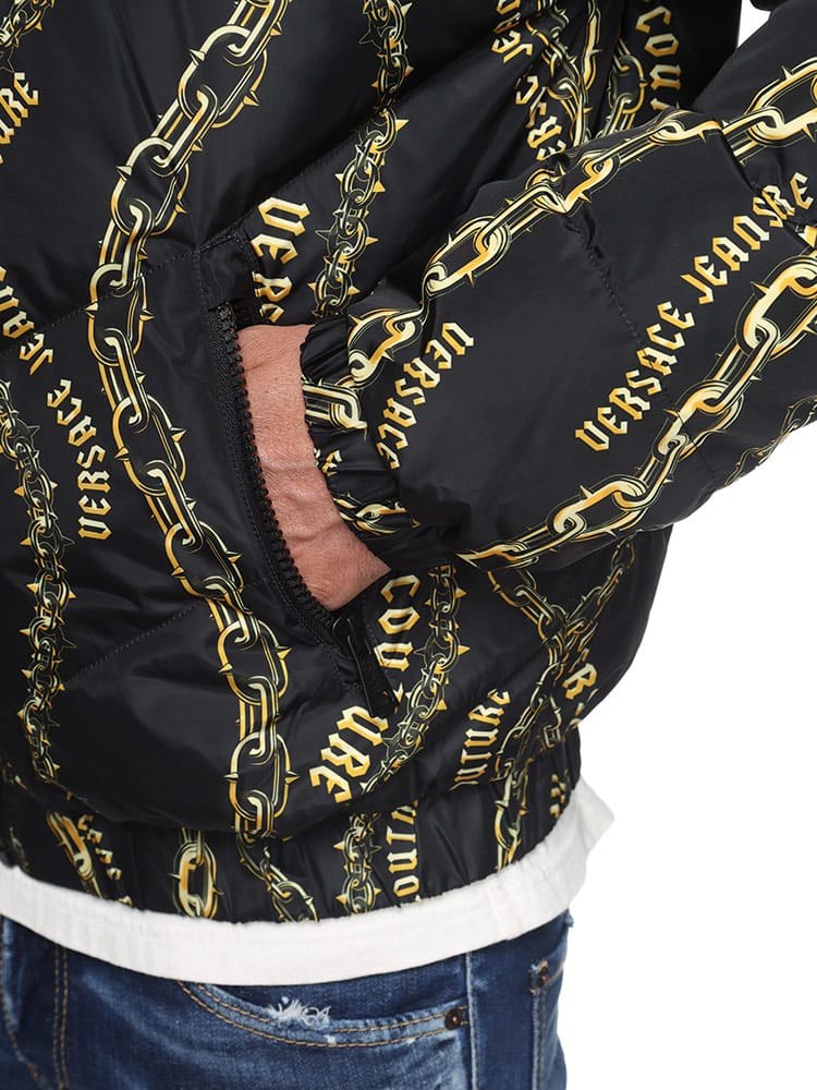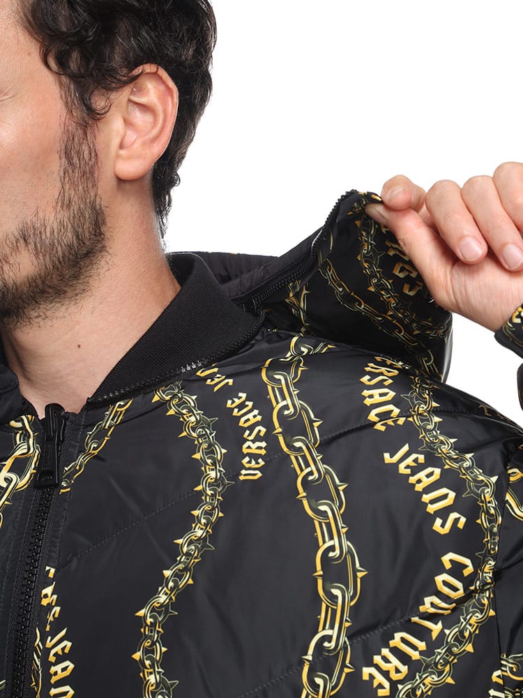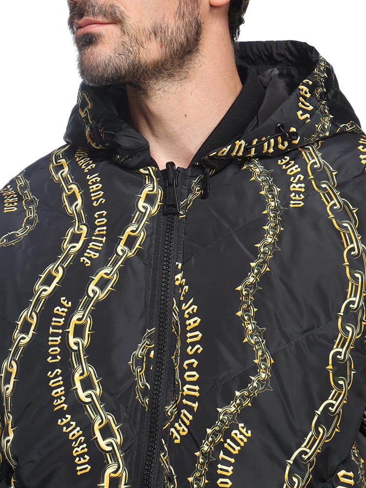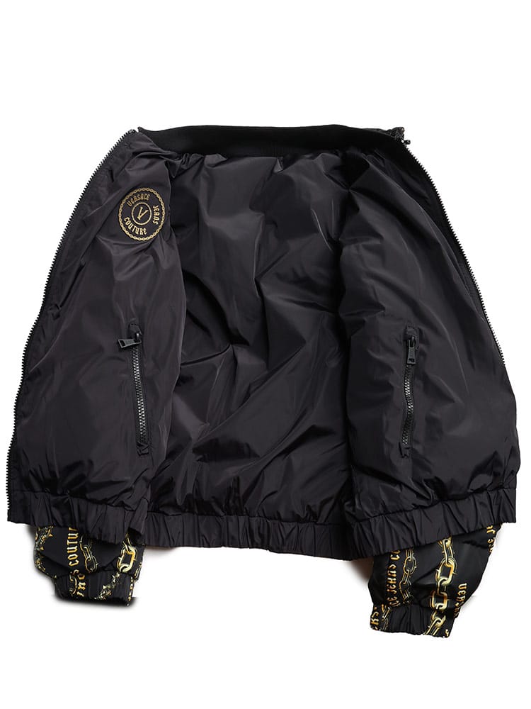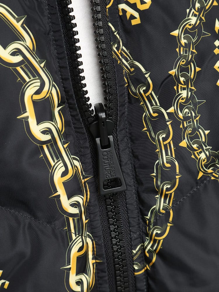 片面に チェーン クチュール プリント、もう片面にレターV エンブレム ロゴをあしらったリバーシブルな パデット パファージャケット。取り外し可能なジップフード付き。