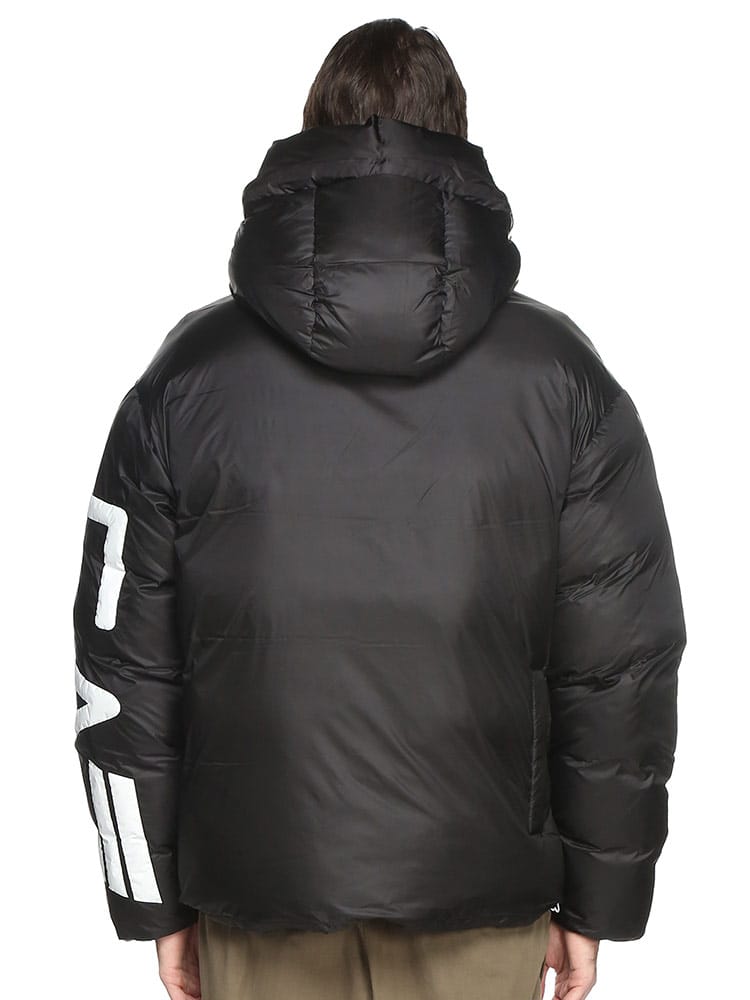 フードを備えたパディング入りジャケット。防風・耐水加工が施されたテクニカルファブリックで仕立てています。スタイリングのしやすい、すっきりとしたシルエットが魅力です。前あきにジップ、サイドにウェルトポケットを2つ、伸縮性のあるウエストにドローストリングを配しています。コントラストの効いたエンボスロゴ入りパッチをあしらい、左袖にコントラストの効いたオーバーサイズロゴを飾ってオリジナリティをプラスしました。レジャータイムに理想的な一着です。