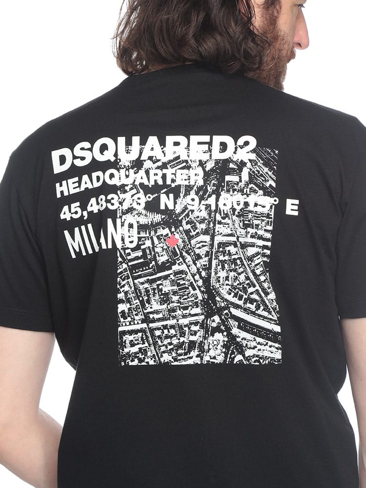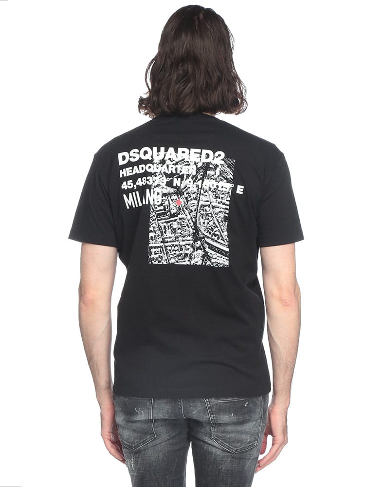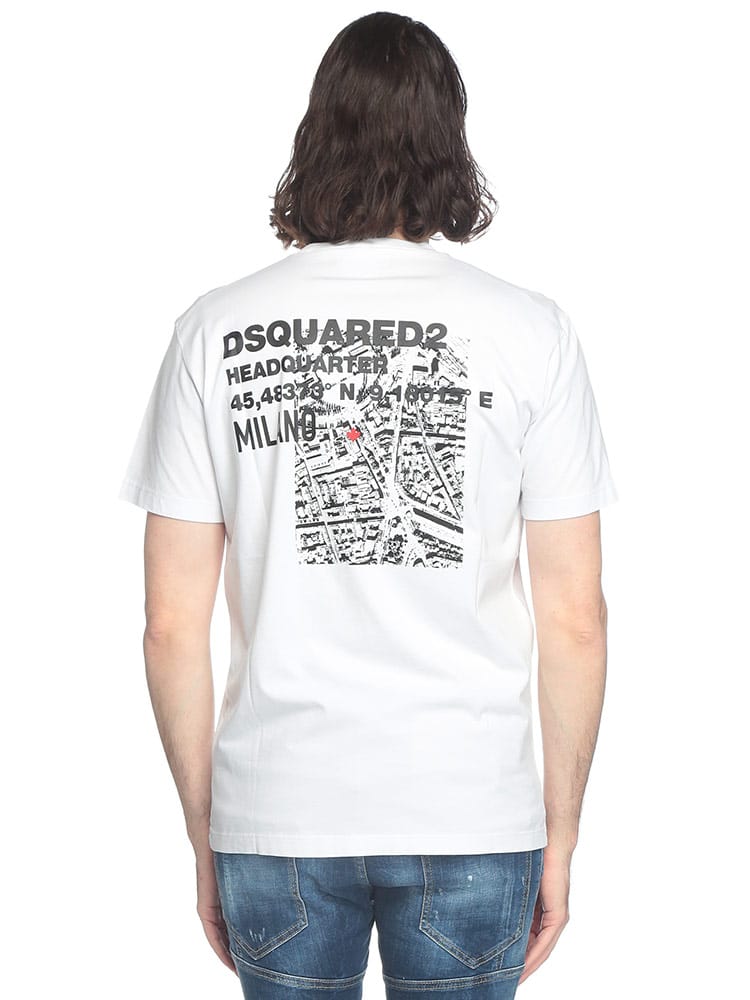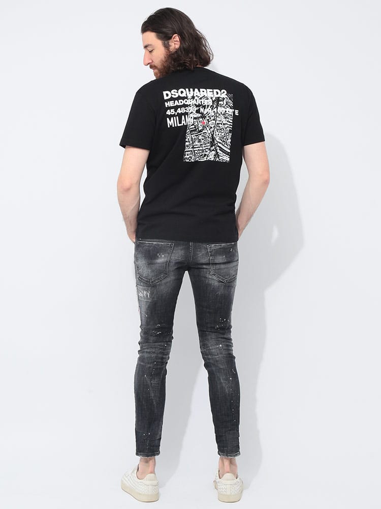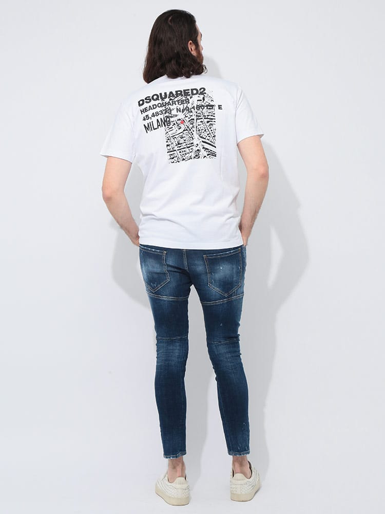 コットンジャージー製のTシャツ。ミラノにあるDsquared2本社の見取り図が、バックにプリントされています。ジーンズやコットン製のチノパンツと合わせやすい、スリムフィットのモデル。
