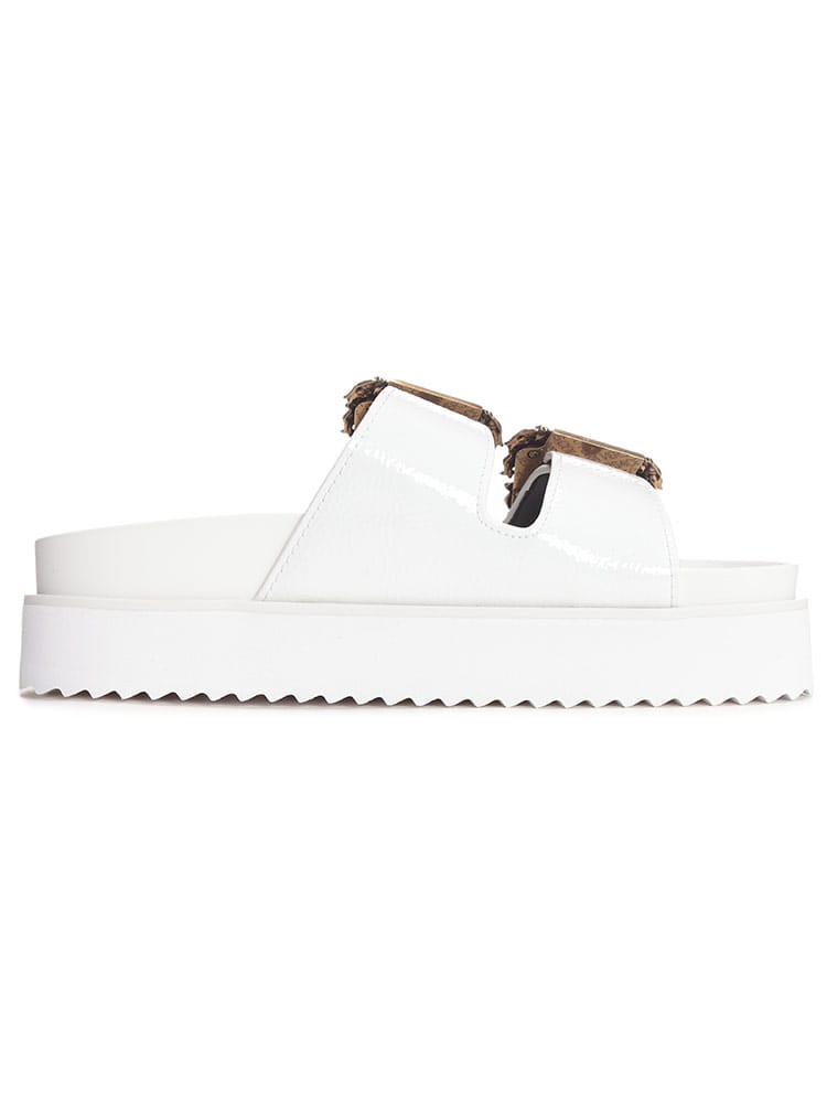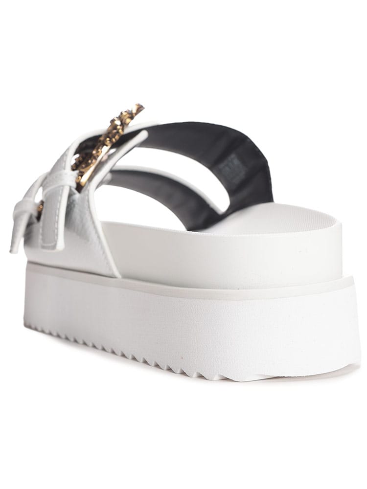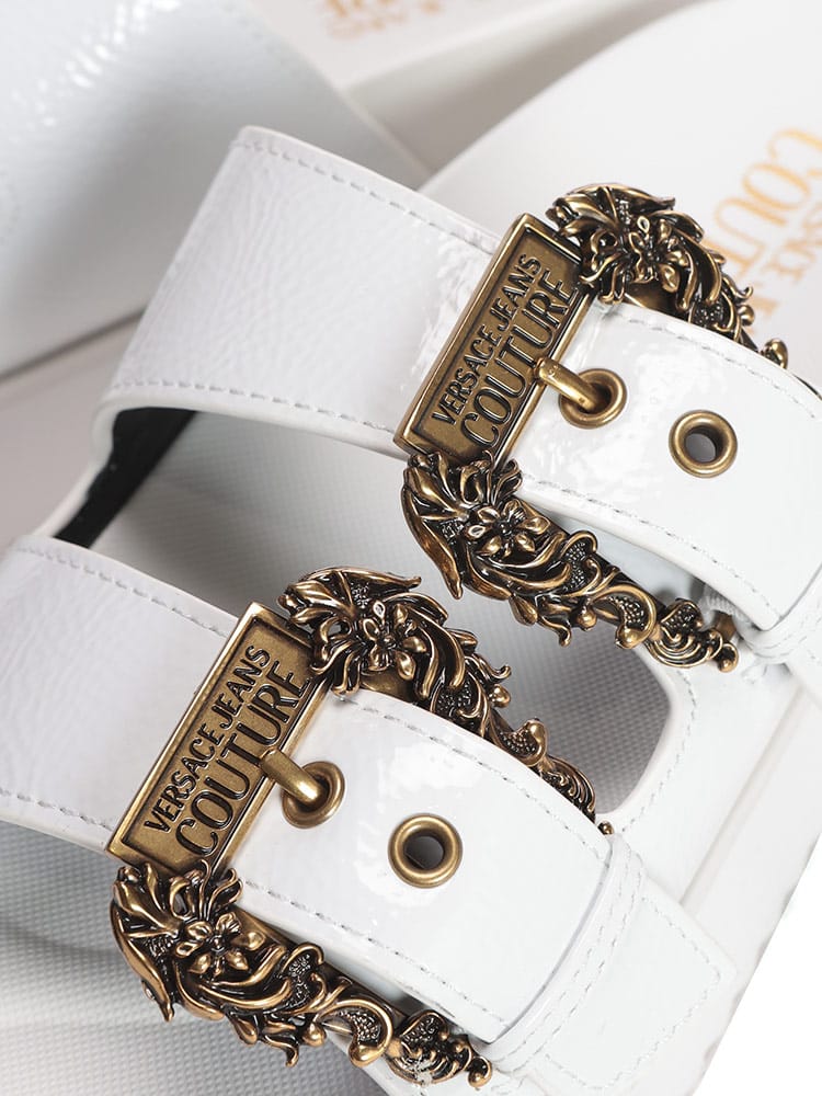 足元に咲き誇るバロック様式。ヴェルサーチェ ジーンズ クチュールの厚底サンダル。ヴェルサーチェ ジーンズ クチュールから、アイコニックなバロック様式をモダンに昇華させた厚底サンダルが登場。アッパーに大胆にあしらわれたバロックバックルは、ヴェルサーチェならではの圧倒的な存在感を放ち、足元をラグジュアリーに演出します。程よいボリューム感の厚底ソールは、スタイルアップ効果はもちろん、安定感のある快適な履き心地を提供。素材には、耐久性に優れたポリウレタンを採用。デイリーユースはもちろん、リゾートシーンにも最適です。