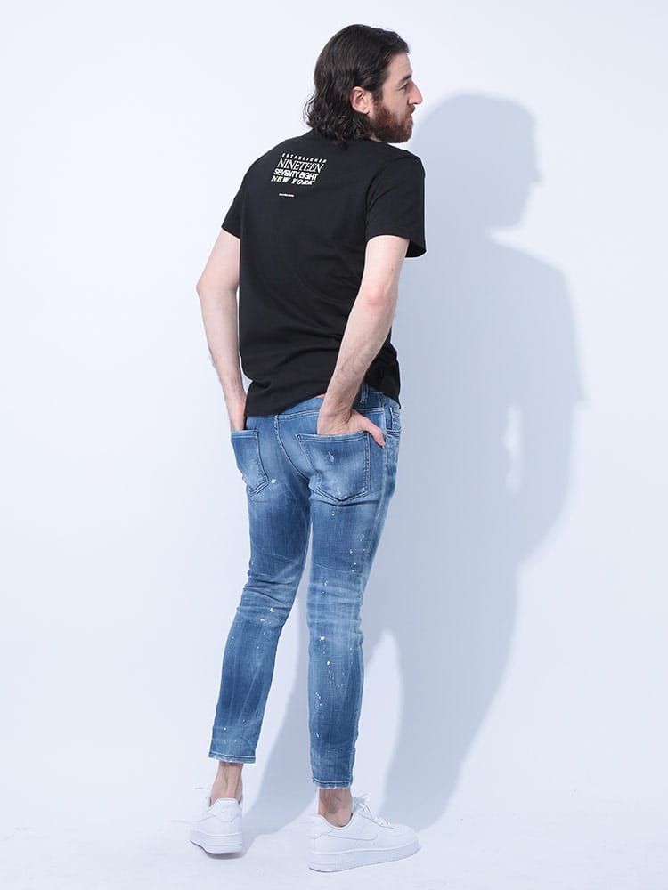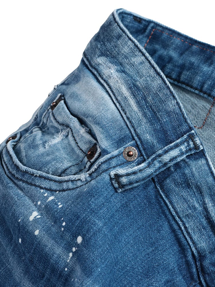 脚がすらりと見えるスリムフィットのミッドウォッシュジーンズ。誰が穿いてもサマになる絶妙なバランス感に仕上げています。穿き込んだような表情をプラスする破れ加工とペイントスプラッターを施したデザイン。プレーンなホワイトTシャツとスニーカーを合わせるだけで、気楽な外出にぴったりのエフォートレスな着こなしが完成します。