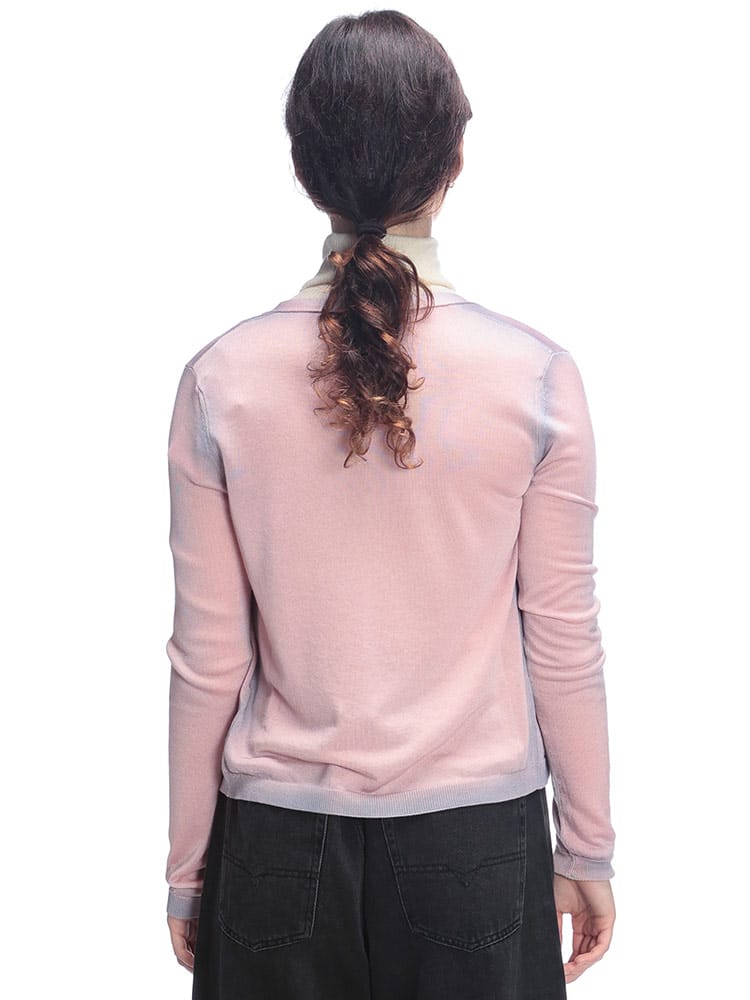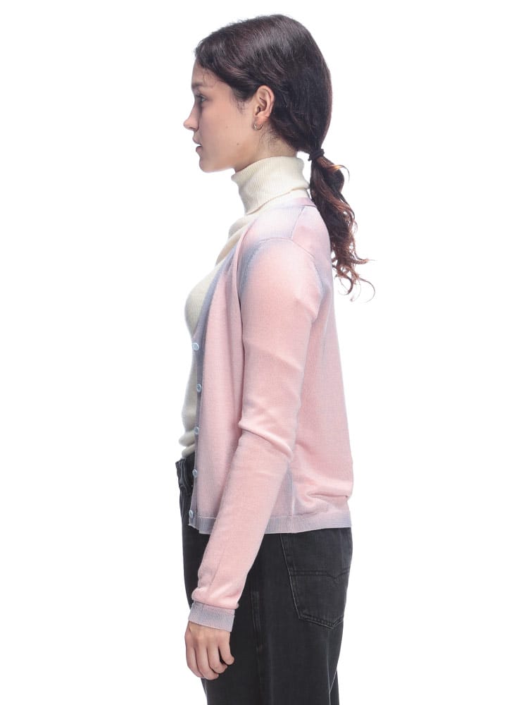 ダブルダイカラー加工を施したフェード感が印象的なレギュラーフィットのカーディガン「M-VITTA」。淡い色使いとほんのりと透け感のあるやさしい表情がポイントです。ビスコースとコットンをブレントした糸で編み込んだ、軽くてソフトな仕上がり。バックネックにはオーバルDロゴのチャームを添えて、シャープなアクセントにしました。前を閉じてVネックニットとして着用するのもおすすめです。