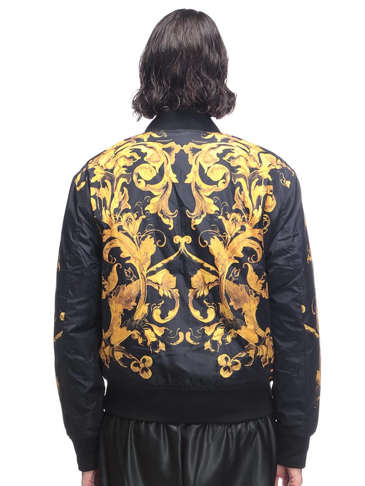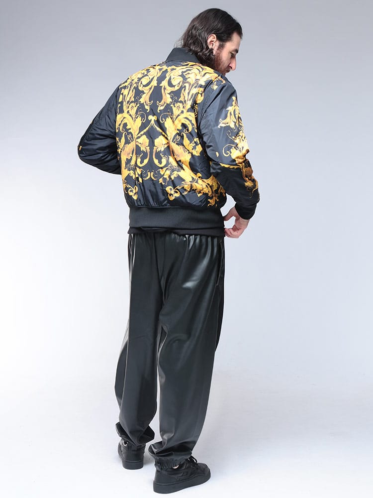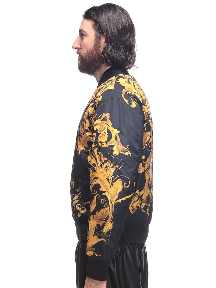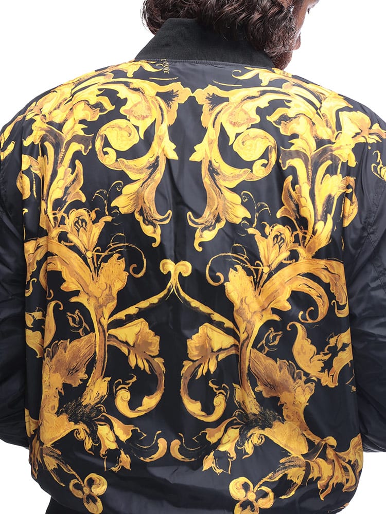 ブランドの象徴であるバロッコプリントを大胆にあしらった総柄デザインが特徴。シックな色合いながらも、ラグジュアリーな雰囲気を醸し出します。クラシックなフライトジャケットを思わせるシルエットは、カジュアルな装いにモードなエッセンスを加え、一枚羽織るだけで圧倒的な存在感を放ちます。