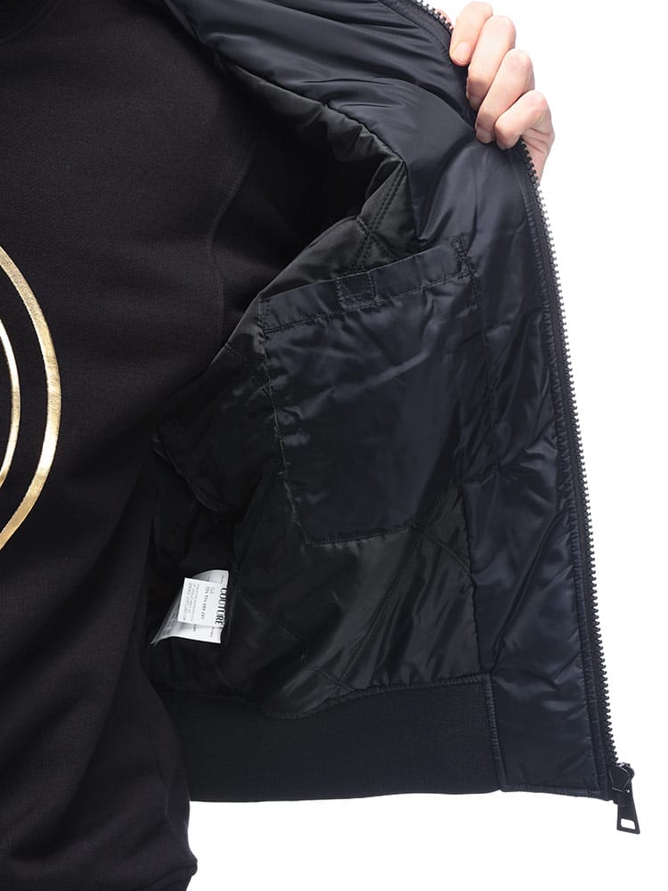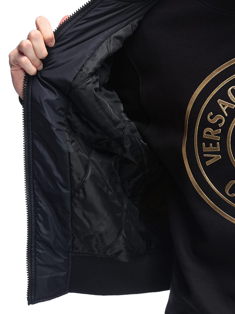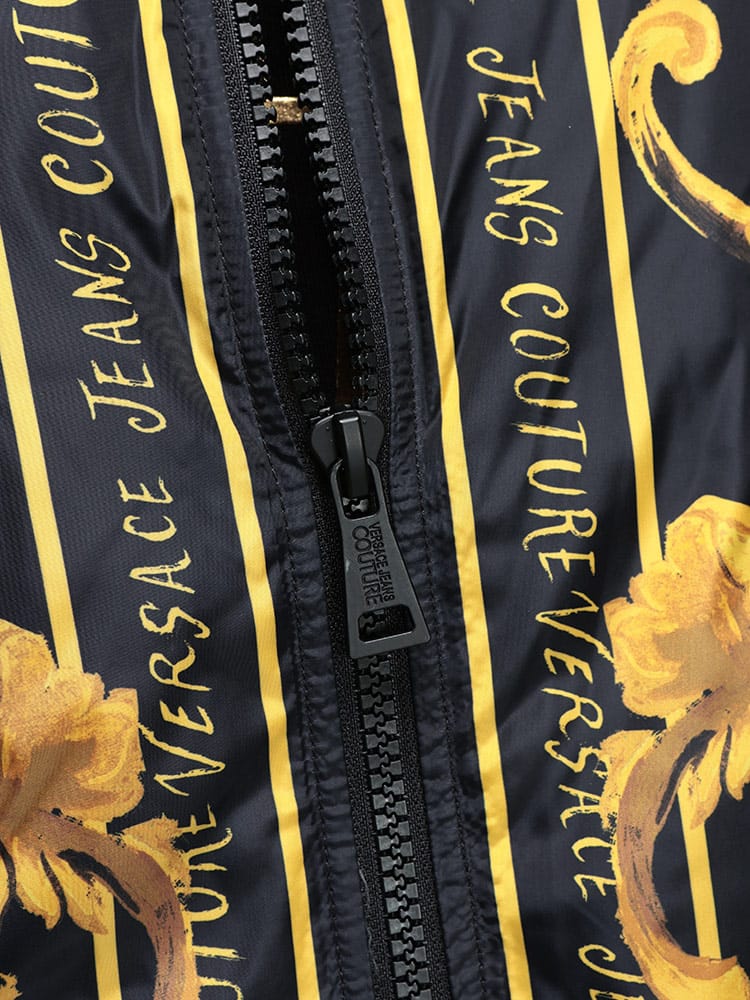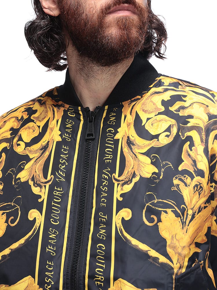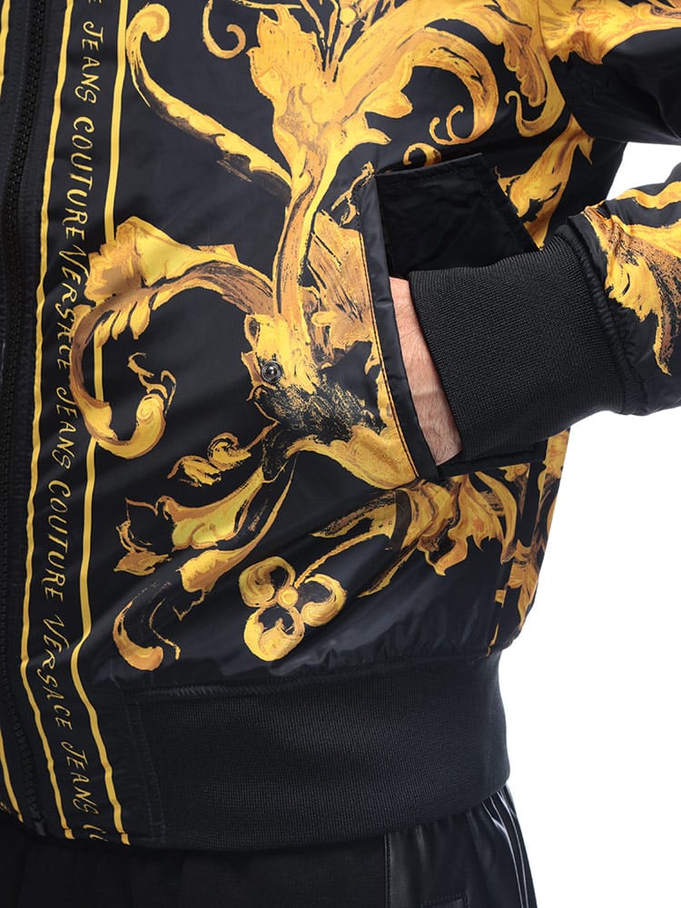 ブランドの象徴であるバロッコプリントを大胆にあしらった総柄デザインが特徴。シックな色合いながらも、ラグジュアリーな雰囲気を醸し出します。クラシックなフライトジャケットを思わせるシルエットは、カジュアルな装いにモードなエッセンスを加え、一枚羽織るだけで圧倒的な存在感を放ちます。