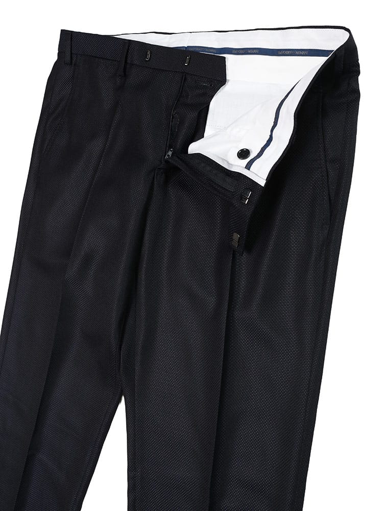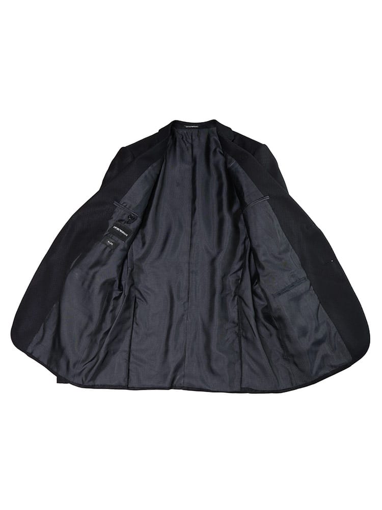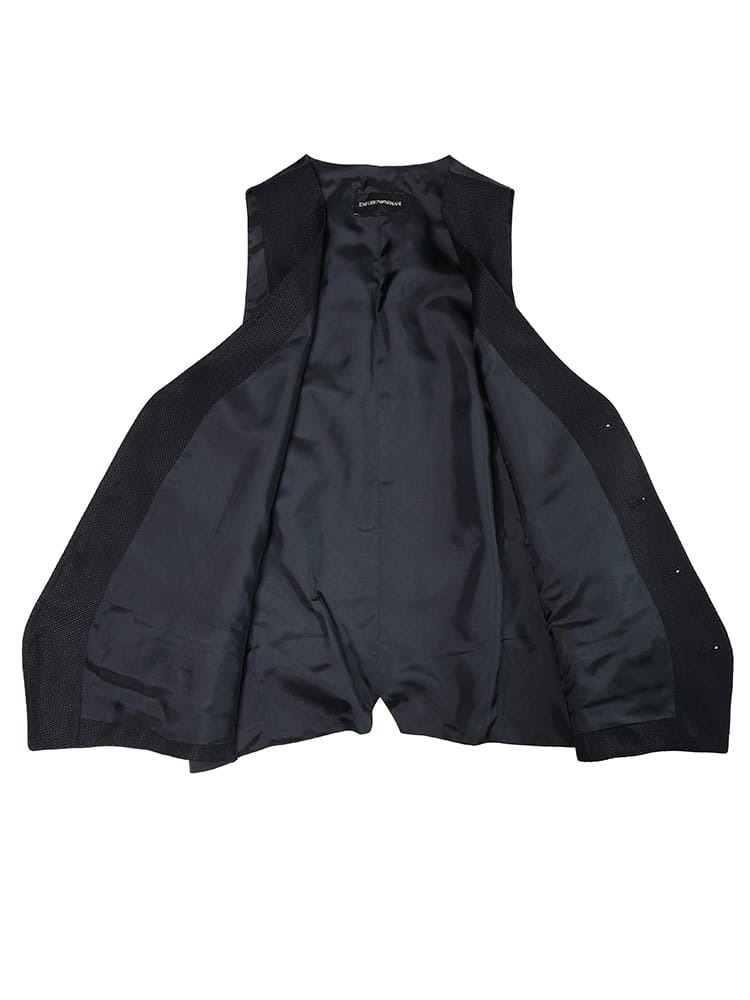シルク混のジャガード素材が放つ上品な光沢と、洗練された柄が特徴。シングルジャケット、ベスト、ノータックパンツの組み合わせが、どんな場面でも完璧な着こなしを約束します。エンポリオアルマーニらしいモダンなシルエットは、ビジネスシーンはもちろん、フォーマルな場でも周囲と差をつける一着です。