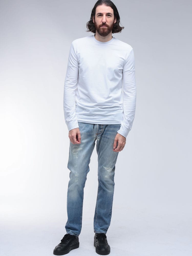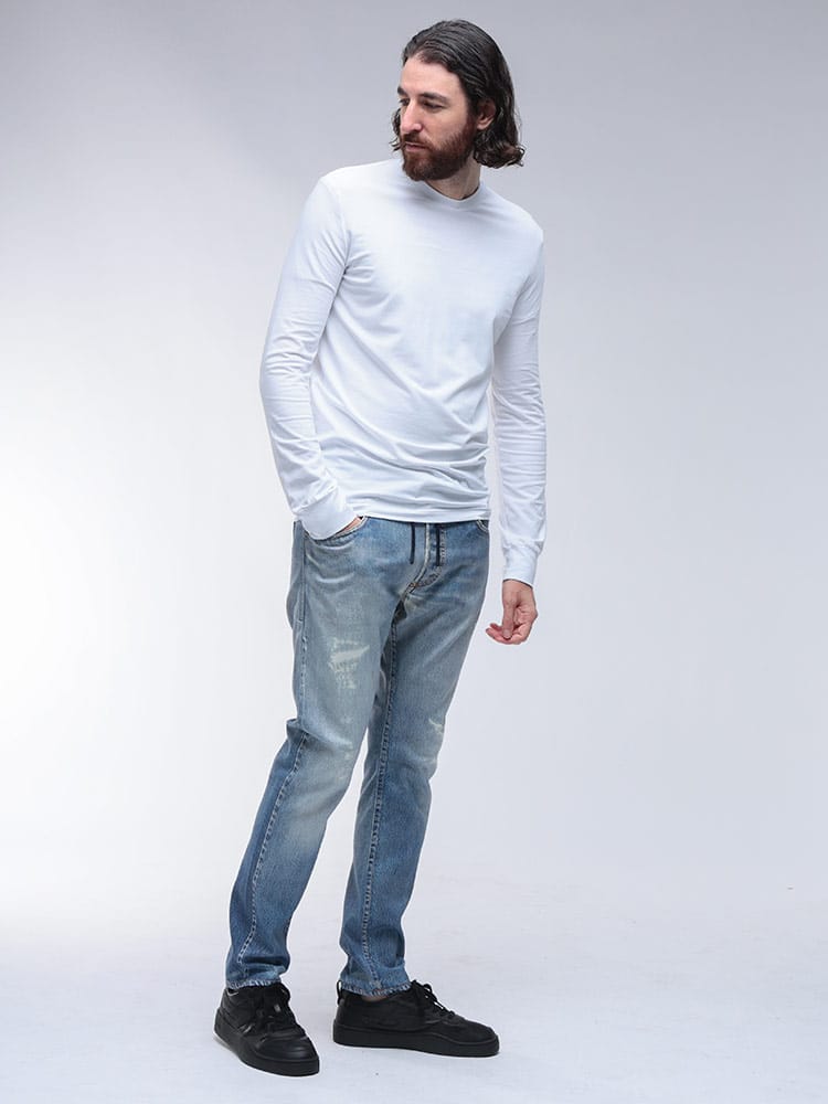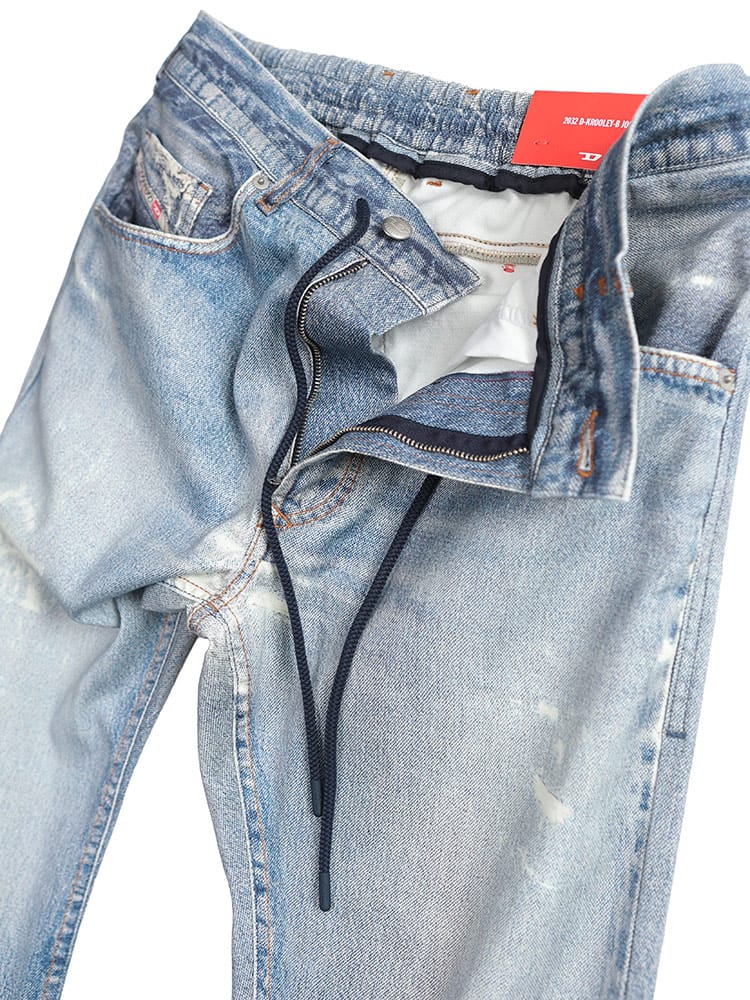 定番ジョグジーンズ「KROOLEY-B」は、デニムの見た目とスウェットの快適さを両立させたハイブリッド素材が魅力。ウエストはドローコードとゴムで調整可能で、リラックスした穿き心地を実現します。ジップフライ仕様で、着脱もスムーズ。美しいテーパードシルエットは、どんなコーディネートにも合わせやすく、大人のカジュアルスタイルを格上げします。デザイン性と機能性を兼ね備えた、DIESELを象徴する一本です。