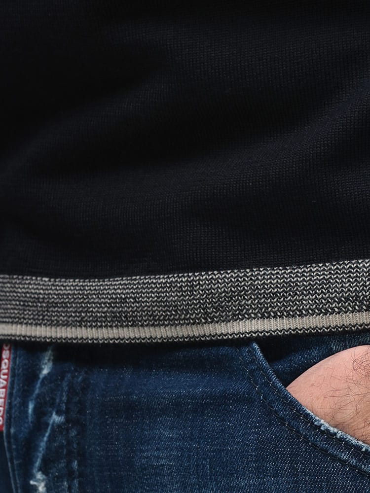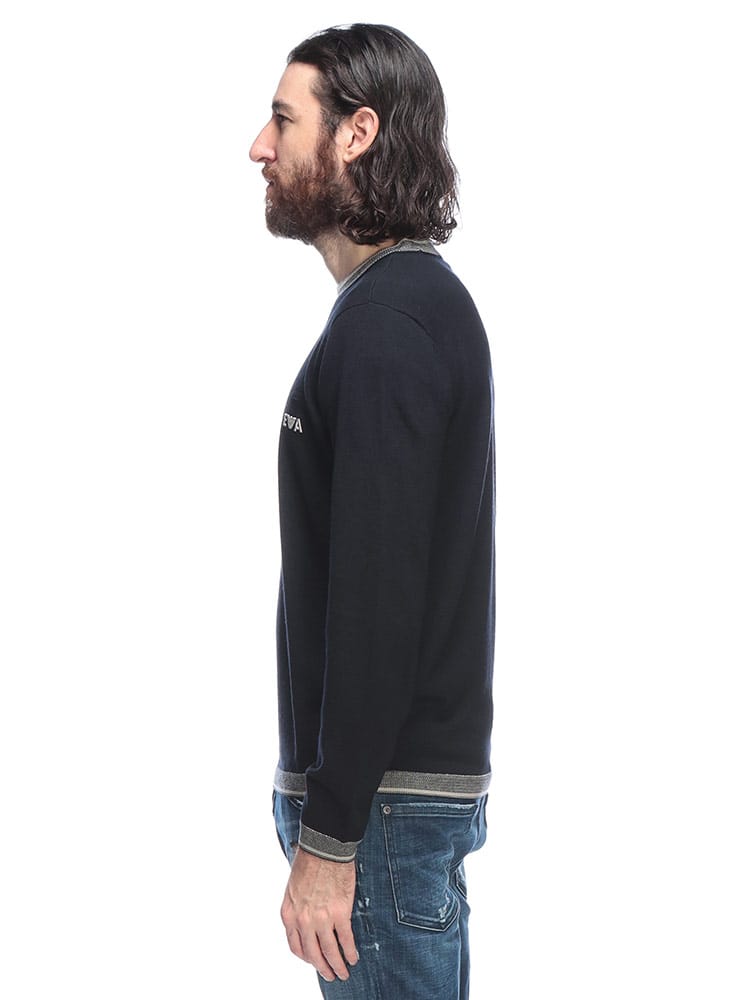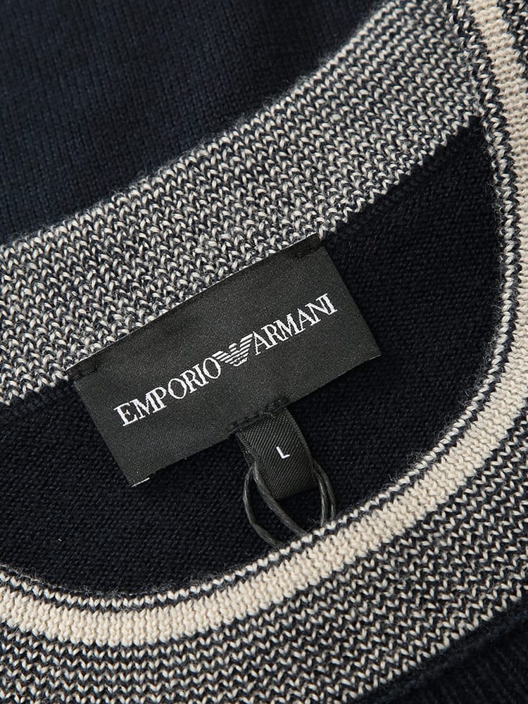 ネックラインに別色やリブを配したリンガーネックデザインが特徴のモダンな一着です。上質な素材が生み出す滑らかな肌触りと、ミニマルながらも洗練されたシルエットが魅力。襟元の配色がさりげないアクセントとなり、カジュアルにもきれいめにも着こなせる、ユーティリティに富んだエンポリオアルマーニらしいニットウェアです。