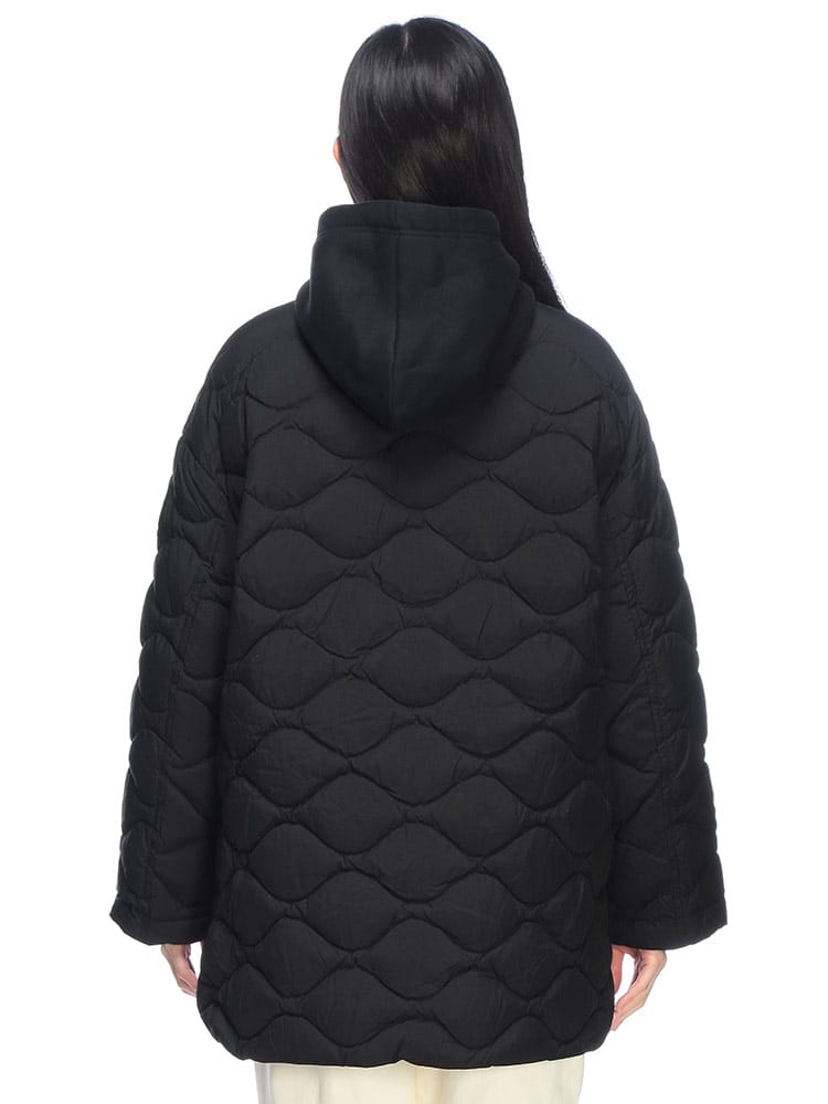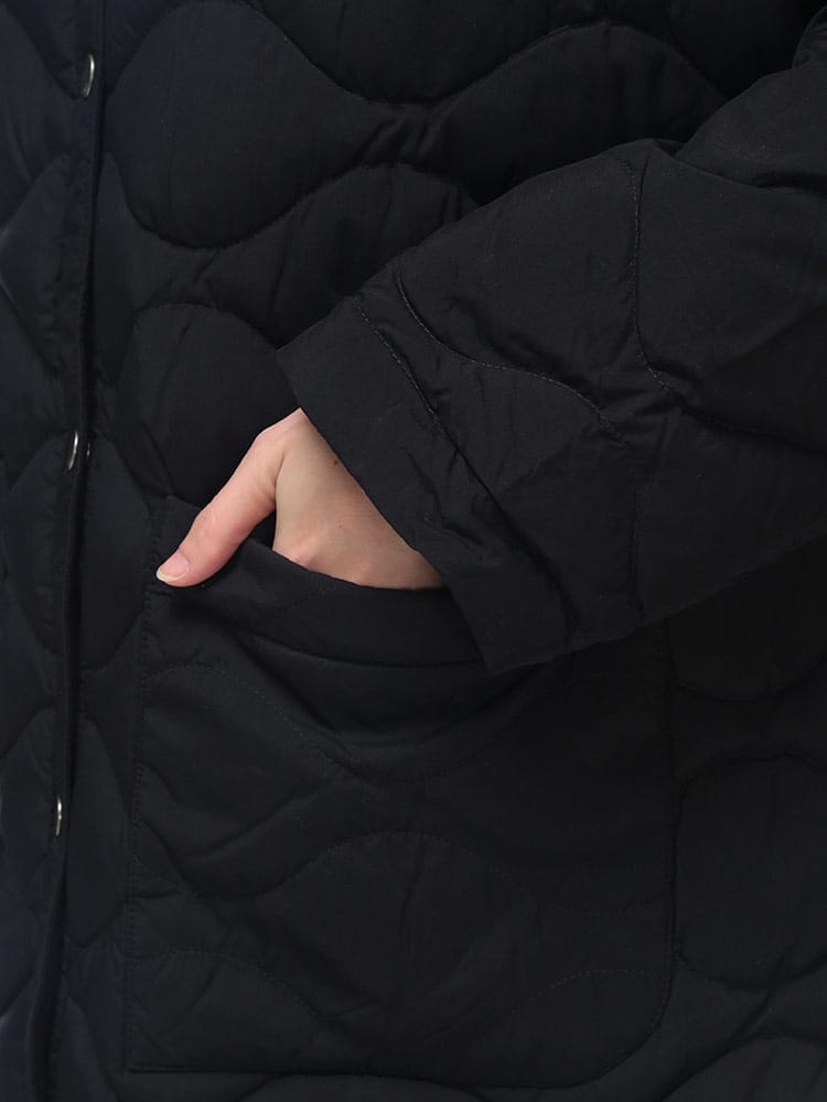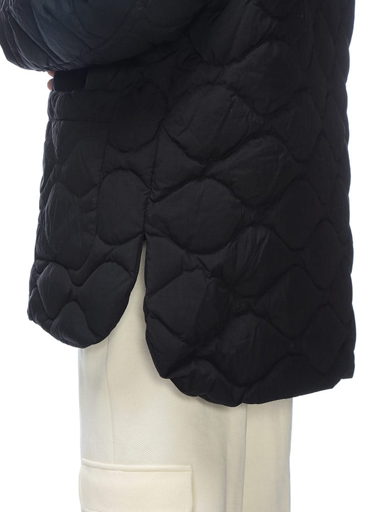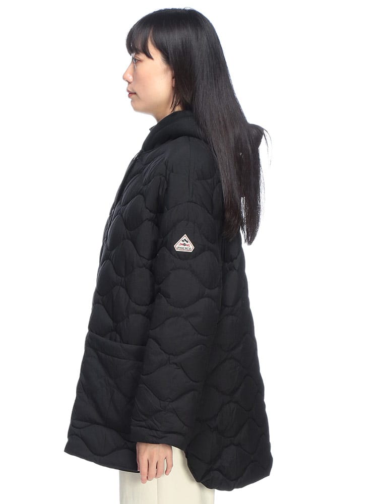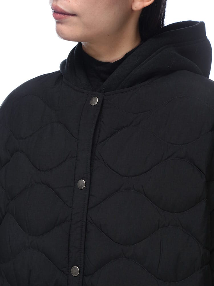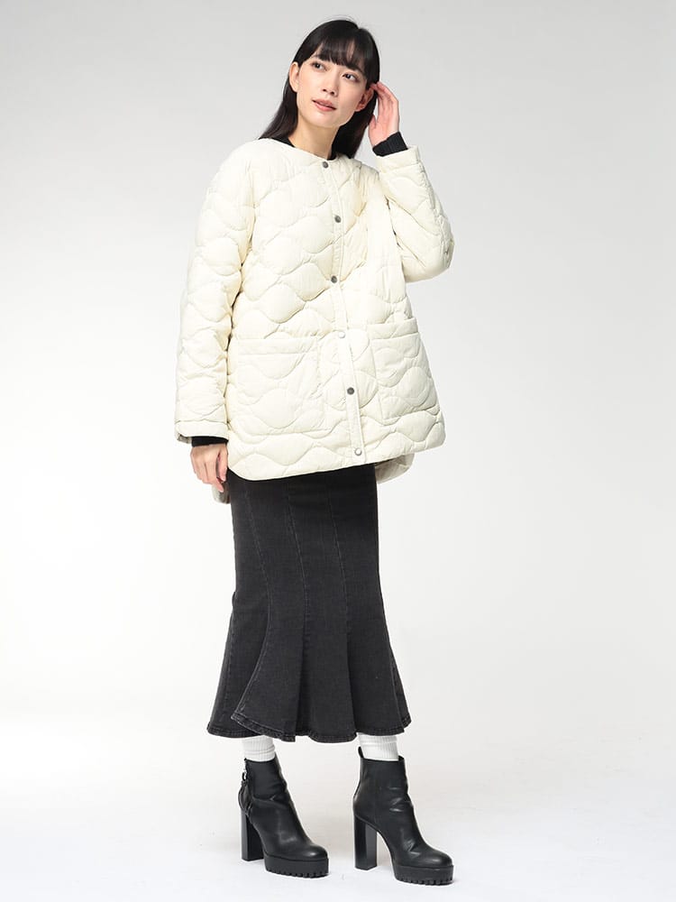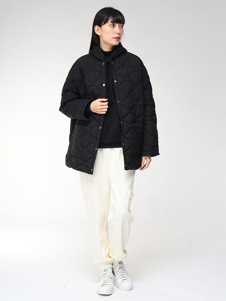 「SIENNA(シエナ)」は、コットンライクな軽やかでしなやかなナイロン素材を使用。横キルティングとパッチポケットがカジュアルな印象です。ドロップショルダーのワイドシルエットでインナーを選ばず、ノーカラーと前後差のある着丈で多様なスタイリングに活躍します。(105文字)