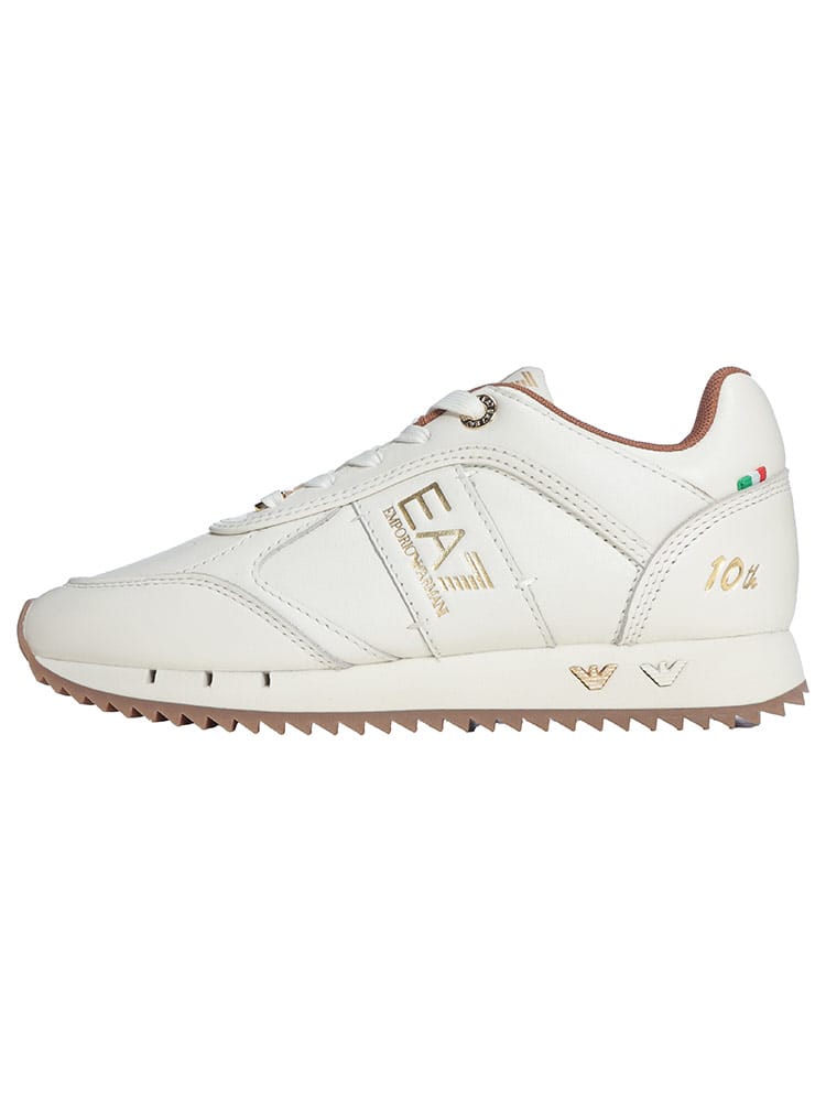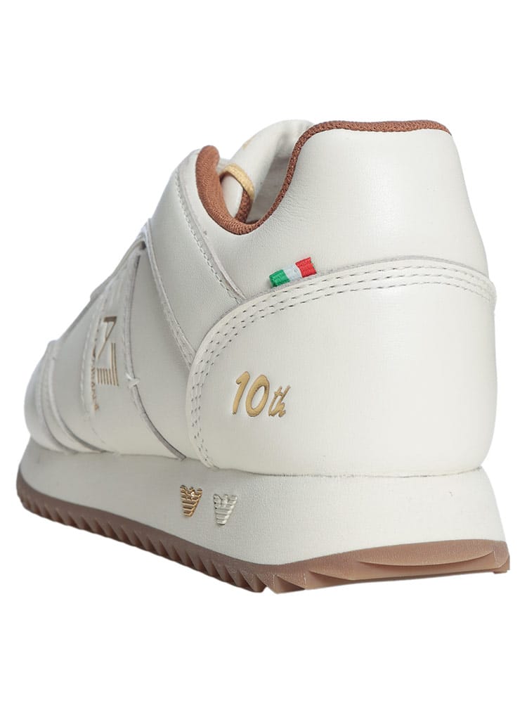 EA7の誕生10周年を記念したアニバーサリーエディションのローカットスニーカーです。アッパーには上質な牛革を使用し、スポーティーなシルエットの中にアルマーニらしい気品と高級感を漂わせます。記念モデルならではの特別なディテールが随所に散りばめられ、足元からプレミアムな存在感を放ちます。耐久性に優れたゴムソールと快適な裏地により、デザイン性だけでなく実用性も兼備した特別な一足です。