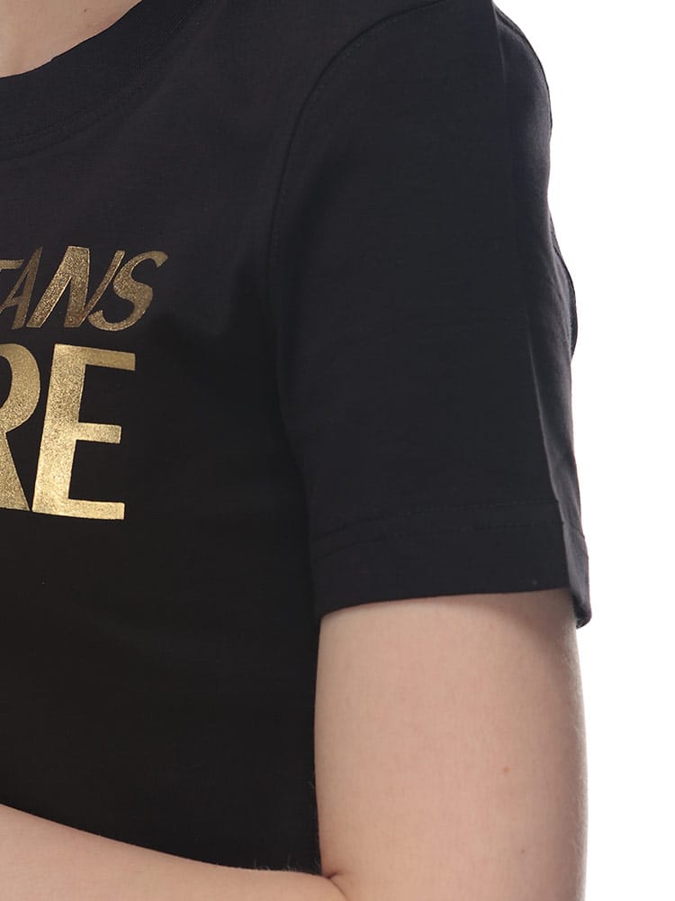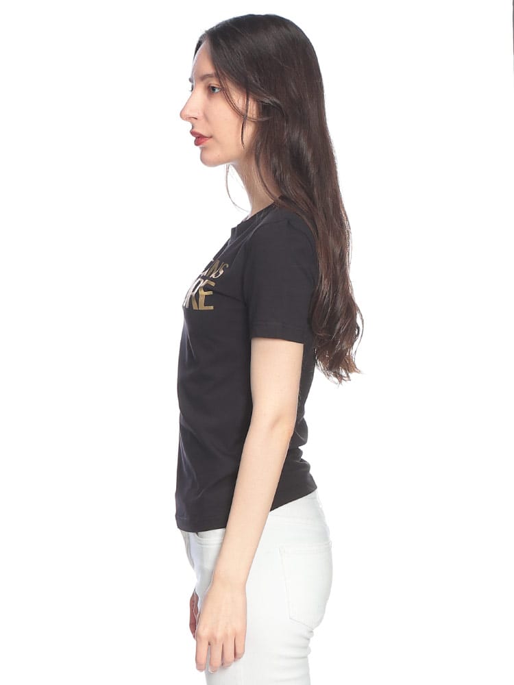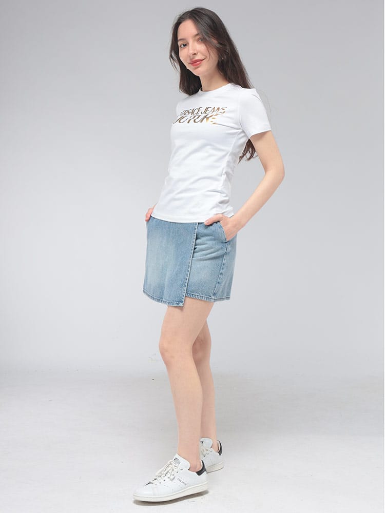 フロントに施された華やかなゴールドロゴプリントが、ブランドらしいラグジュアリーな存在感を放つ半袖Tシャツです。身体のラインを美しく見せるスリムなシルエットと、トレンド感のあるショート丈を組み合わせることで、都会的で洗練されたスタイルを演出します。柔らかなコットン素材が肌に心地よく、春夏シーズンのカジュアルな装いに品格のあるアクセントをプラス。デニムからスカートまで幅広くマッチする一着です。