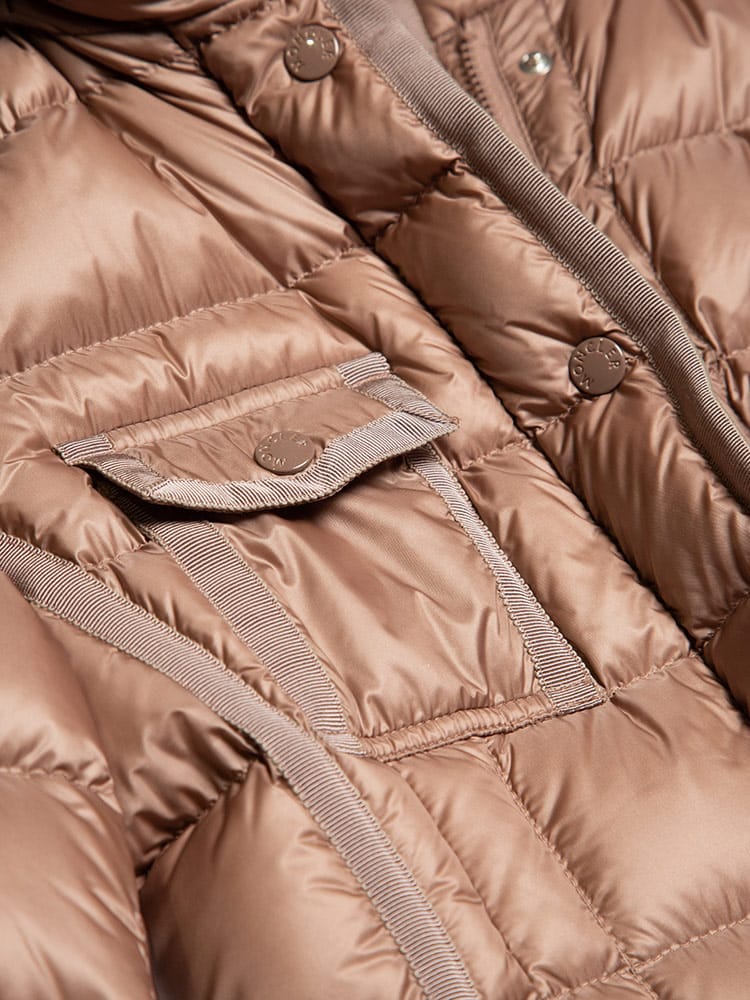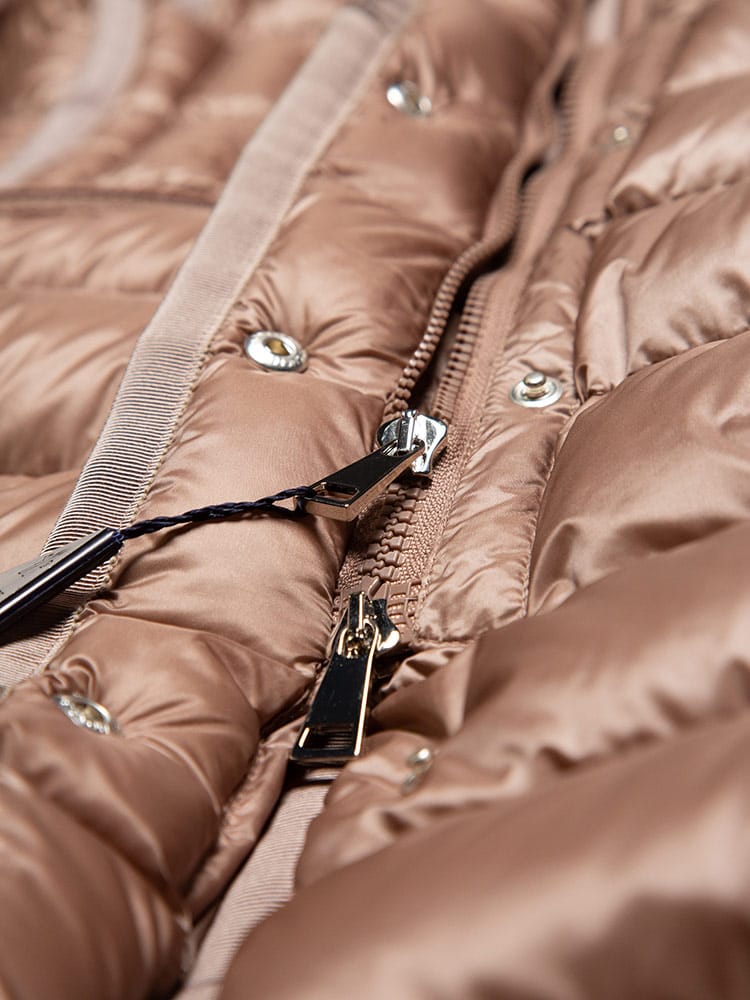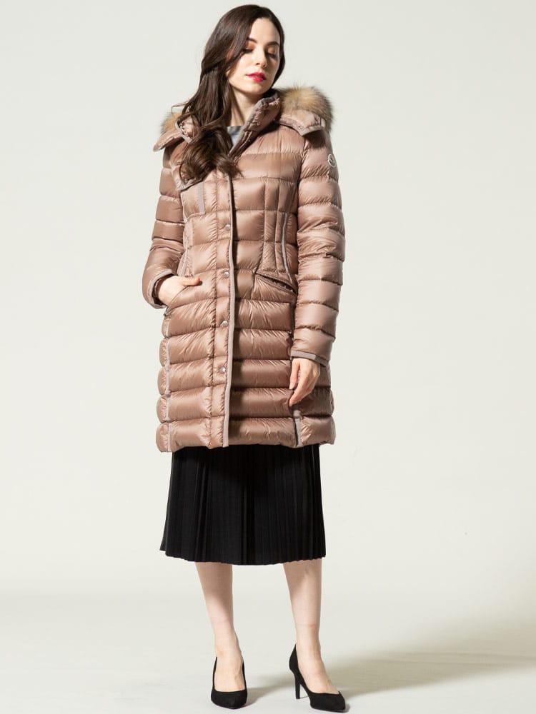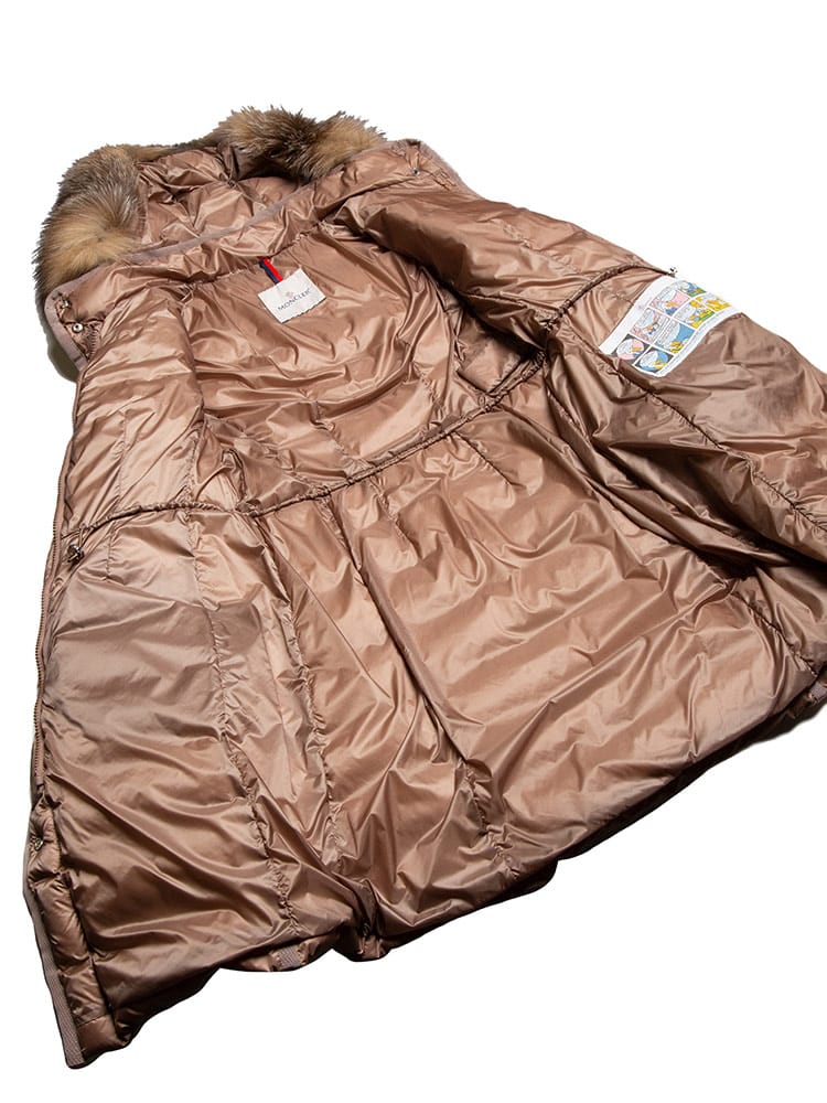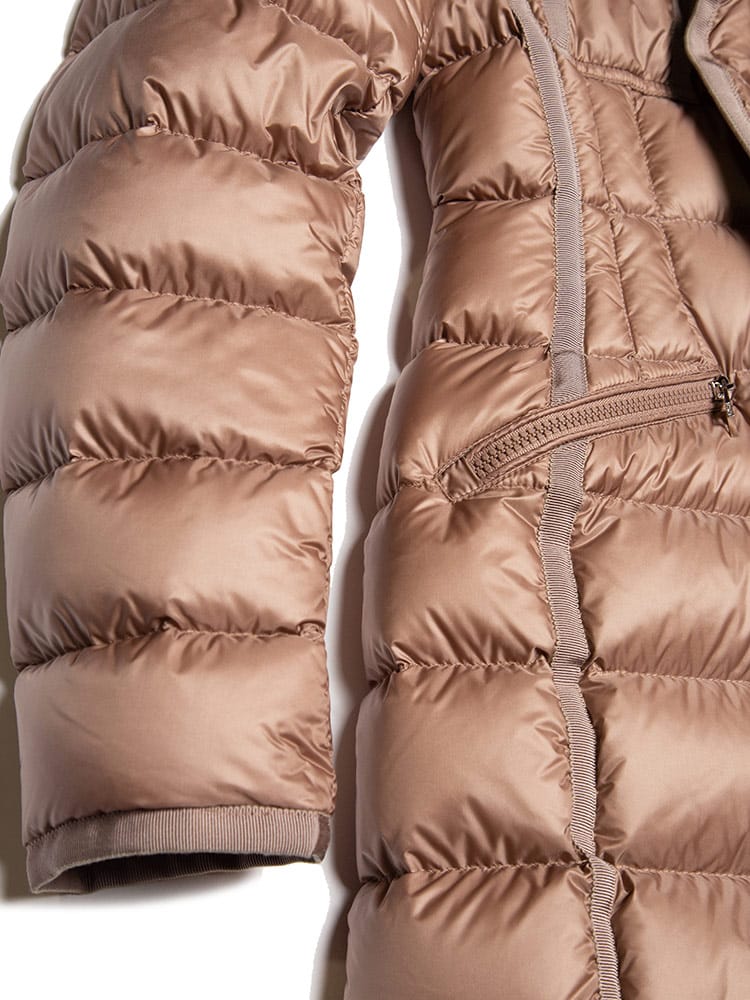 7年代調とアバンギャルドなハイテクディテールが、テイラーメイドなアウターの中で呼応するかのようです。ウエストをドローストリングで絞り、女性らしい曲線を強調し、ゴージャスなファー使いがソフトで優美なタッチを加えています。都会のセクシーなゴージャスさや、山荘のバカンスをイメージさせます。極うす手オペークナイロンにグログランパイピングでダウンパディングのパーカー。フードはフロストフォックスファーのトリミング。スナップボタンで取り外せ、エンドループとエラスティックドロー付のフード。フロントはラッカー塗りスナップボタンとトーンオントーンのダイカスト製ジッパークローズ。下部にダイカスト製ジッパー付ダブルポケットと胸にフラップとラッカー塗りスナップボタン付小ポケット。ウエスト内面にエンドループ付エラスティックストリング。左袖にはフェルトロゴ。ひざ丈。