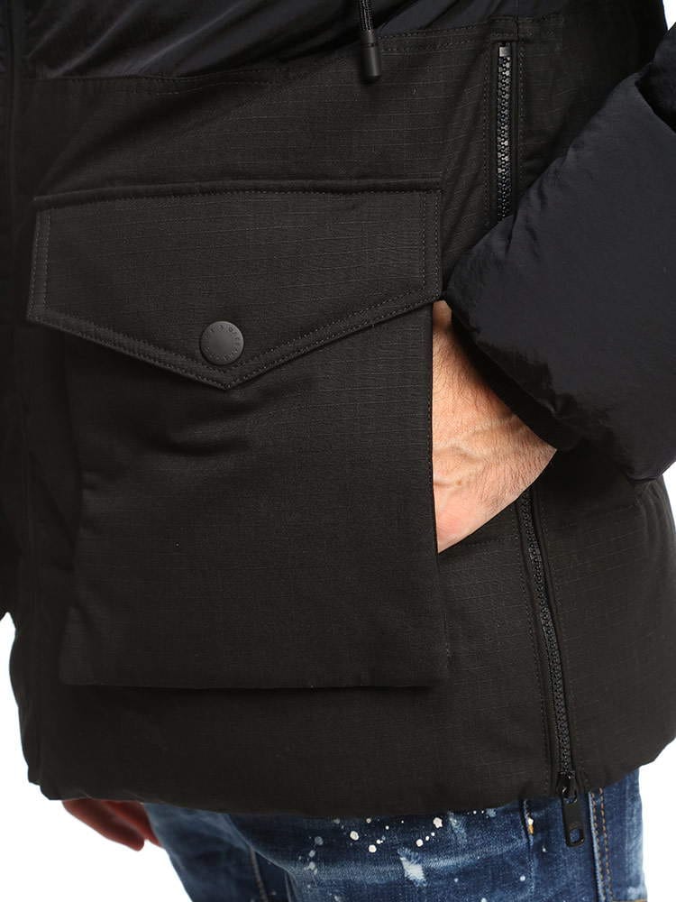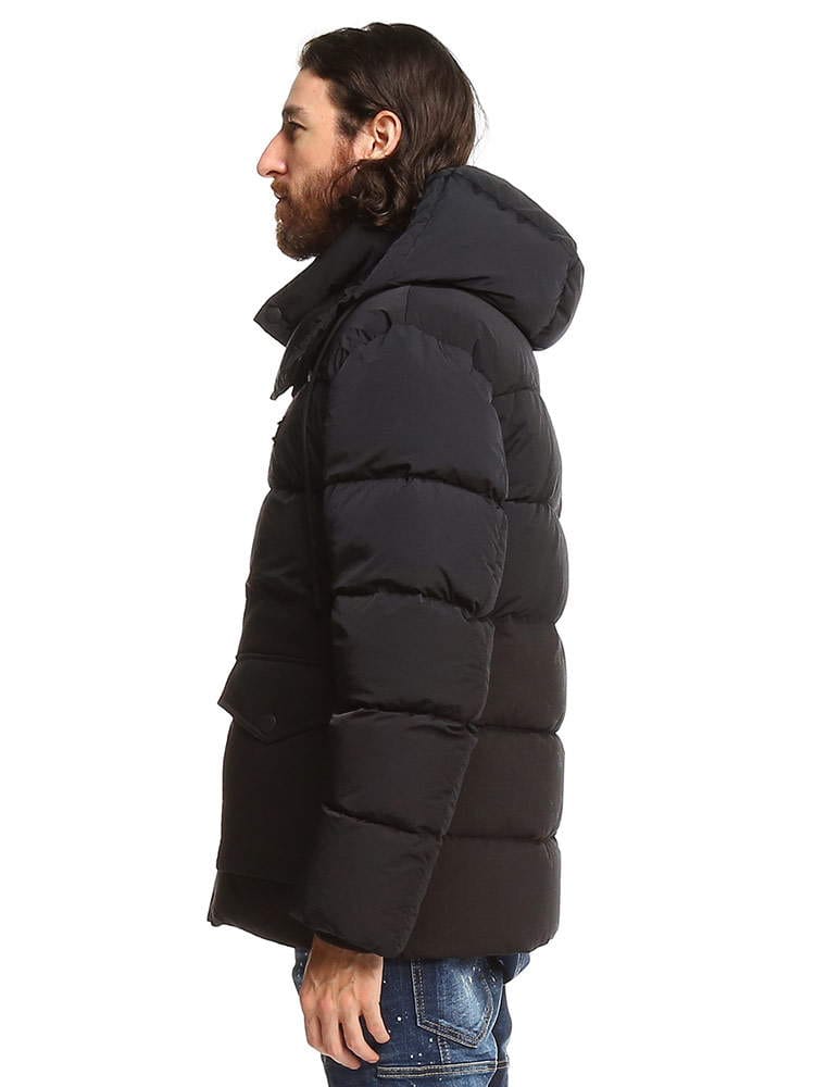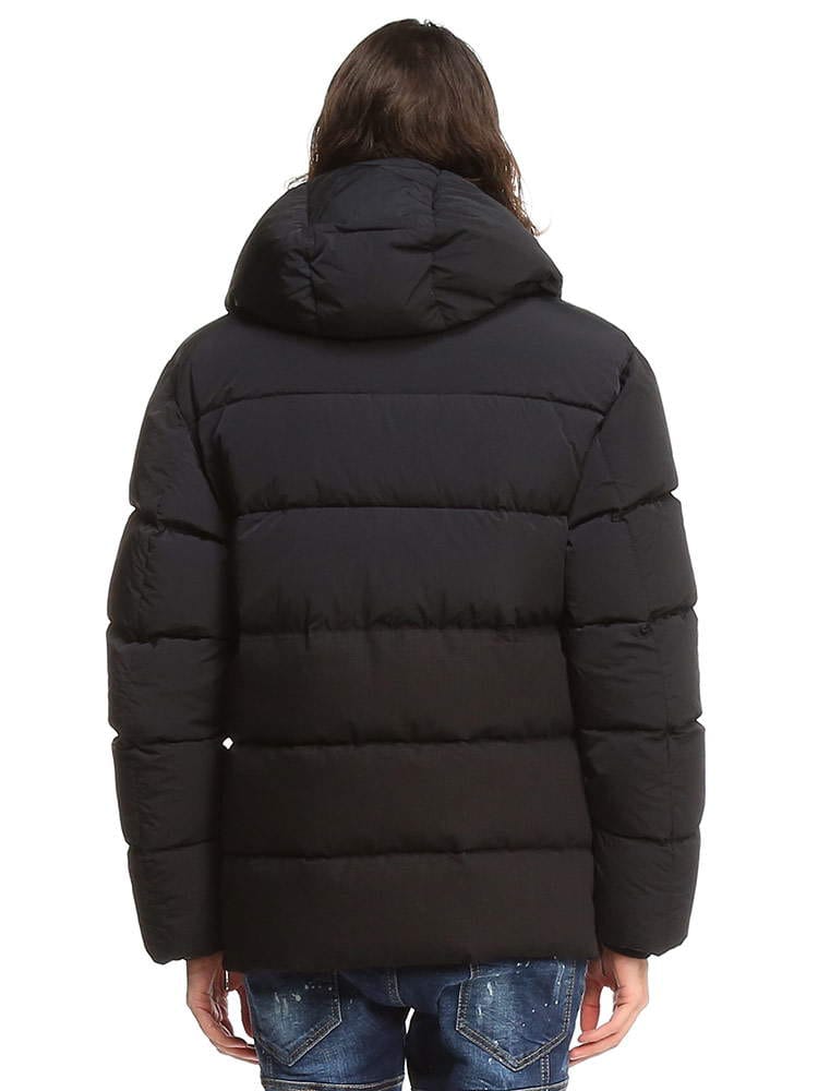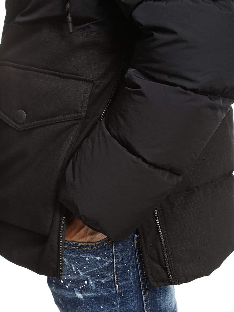 ・グースダウンの軽いフィリング入り・レギュラーフィット・取り外し可能なフード付き、金属製のロゴ入りアグレット付きのドローストリング・前身頃のジッパーで開閉・スナップボタン付きのフラップパッチポケット・身頃すそにドローストリング入り・裏地付き