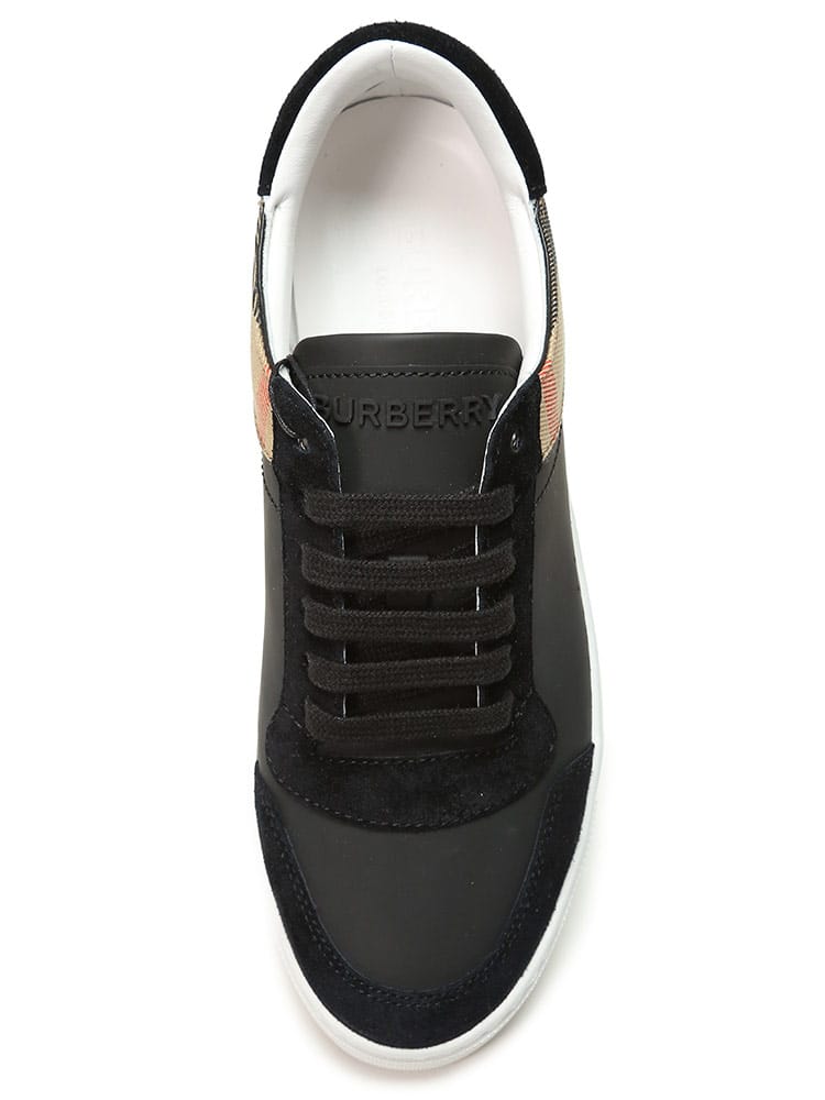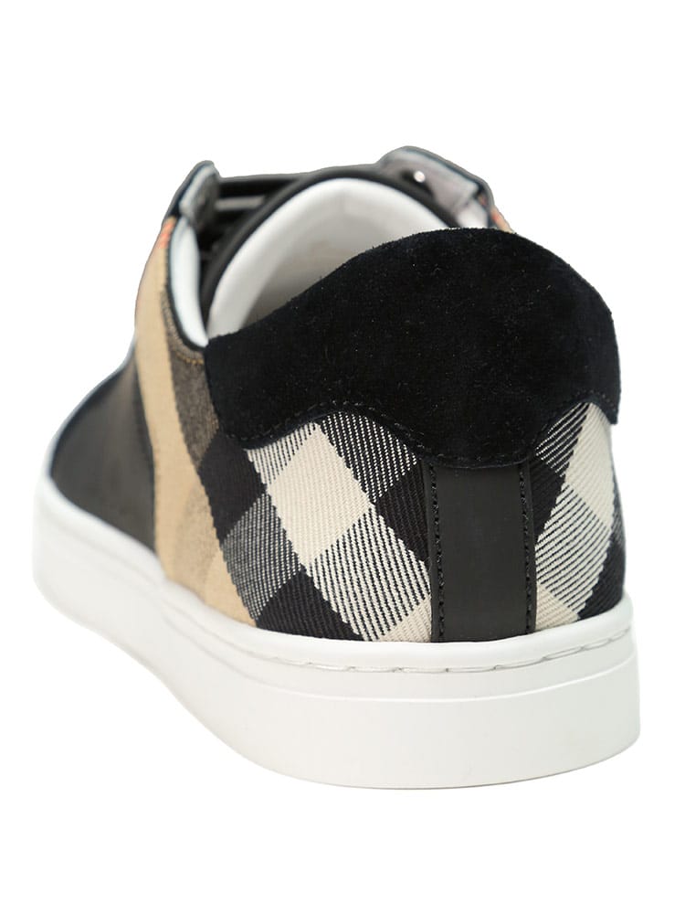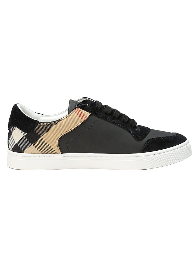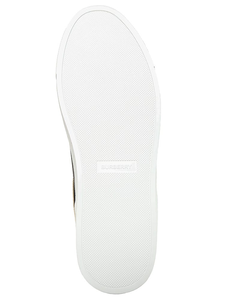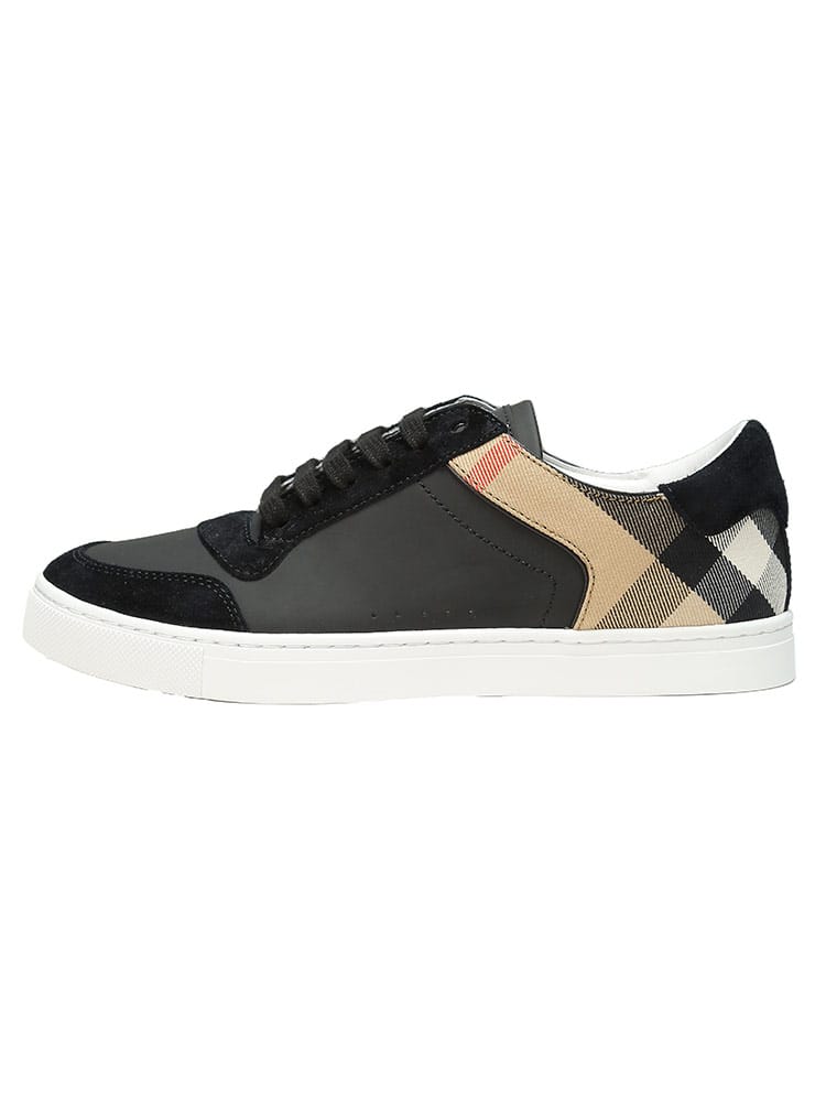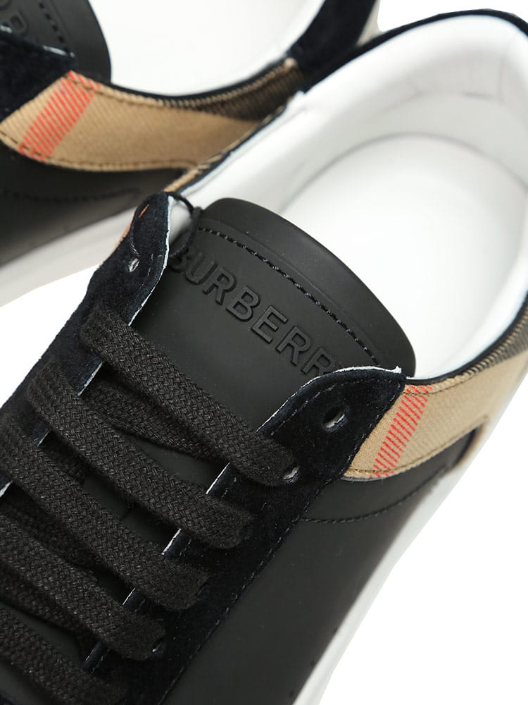 レザーとスエードのスニーカー。英国で織り上げたコットンツイルのハウスチェックパネルを配しました。レースアップで開閉。タンのレザーパッチに立体的なバーバリーのロゴ。