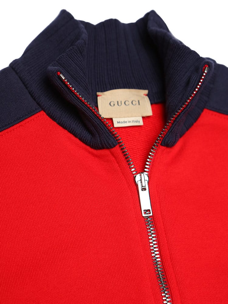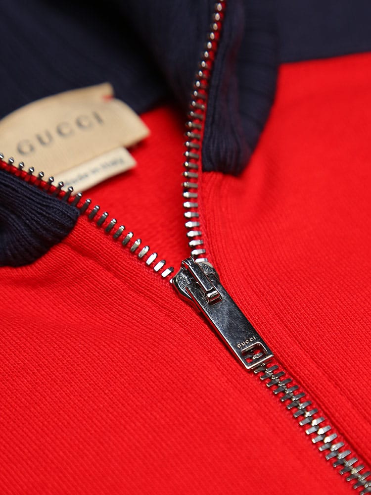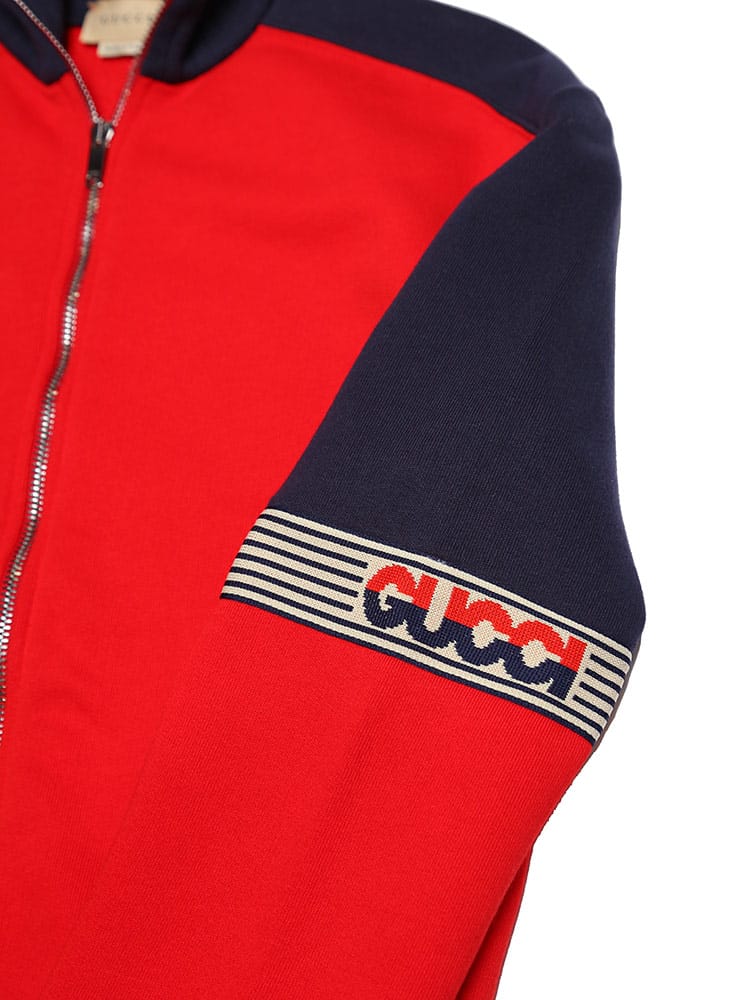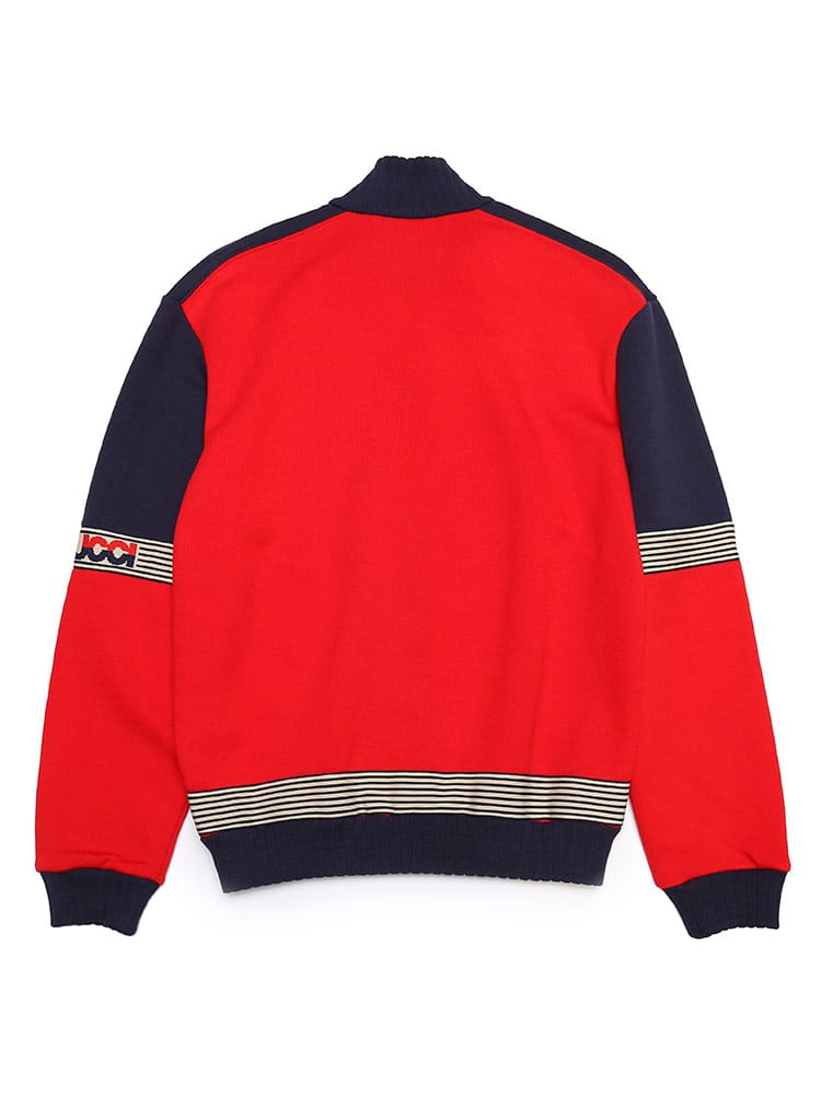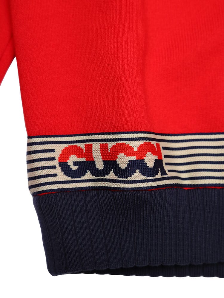 裾と袖口にストライプ トリムを施し、GUCCI ロゴをニット ディテールとして配しています。