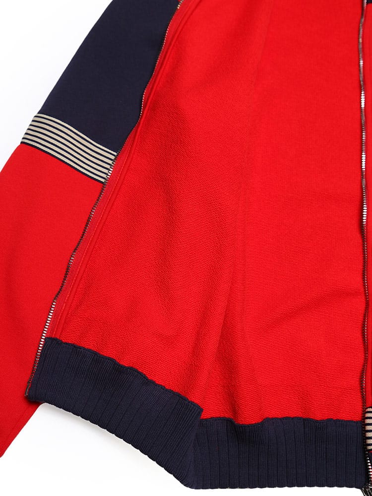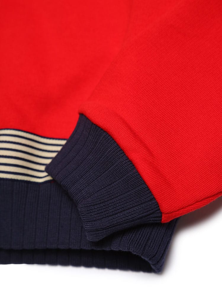 ブルーとレッドのフェルトコットンジャージーで仕立てた着心地抜群の一着。