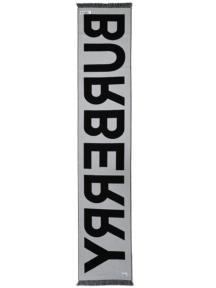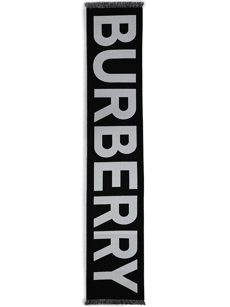 バーバリーのロゴがジャカード織りされた、イタリア製のウールツートンカラーのマフラーです。