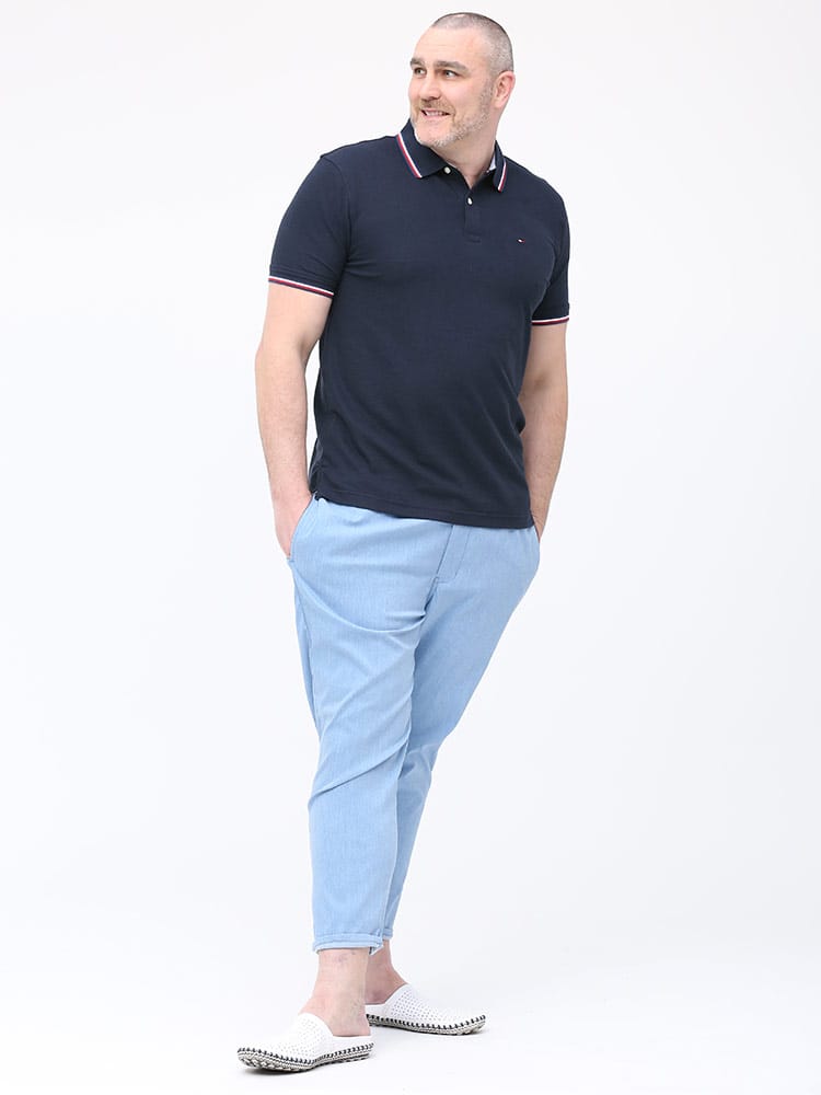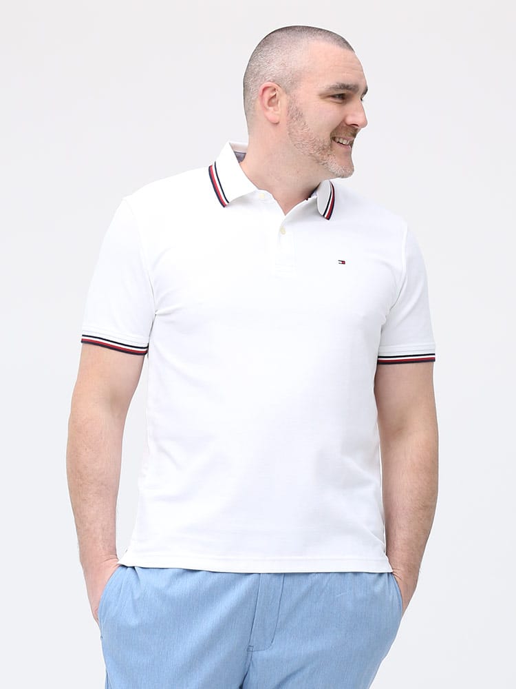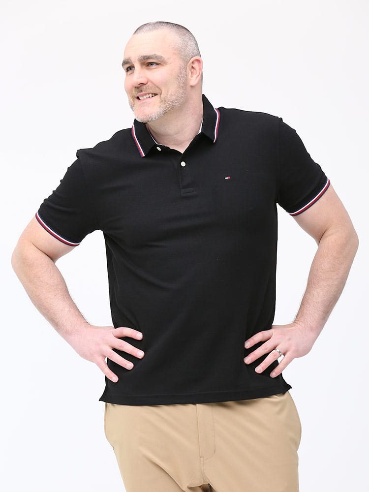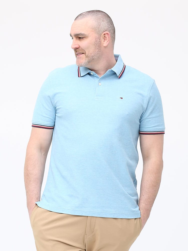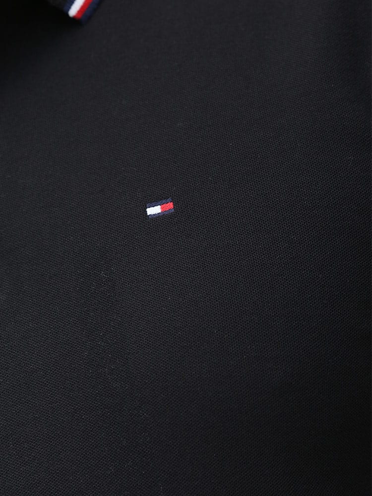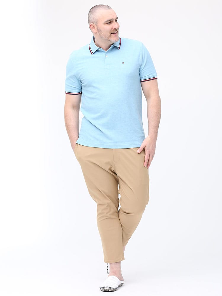 ドライとストレッチで快適な着心地のTOMMY HILFIGERのライン ワンポイント 半袖 ポロシャツです。襟と袖のラインデザインがアクセントをプラス。左胸にさりげないロゴ刺繍。裾サイドにスリット入り。カジュアルスタイルにおすすめの一枚です。