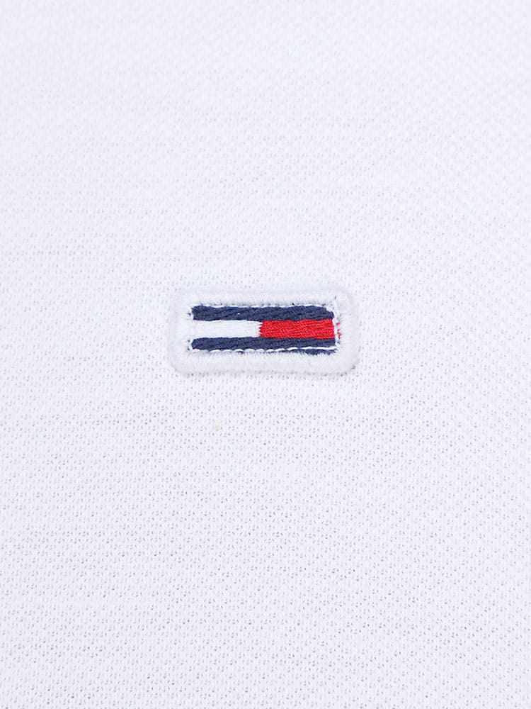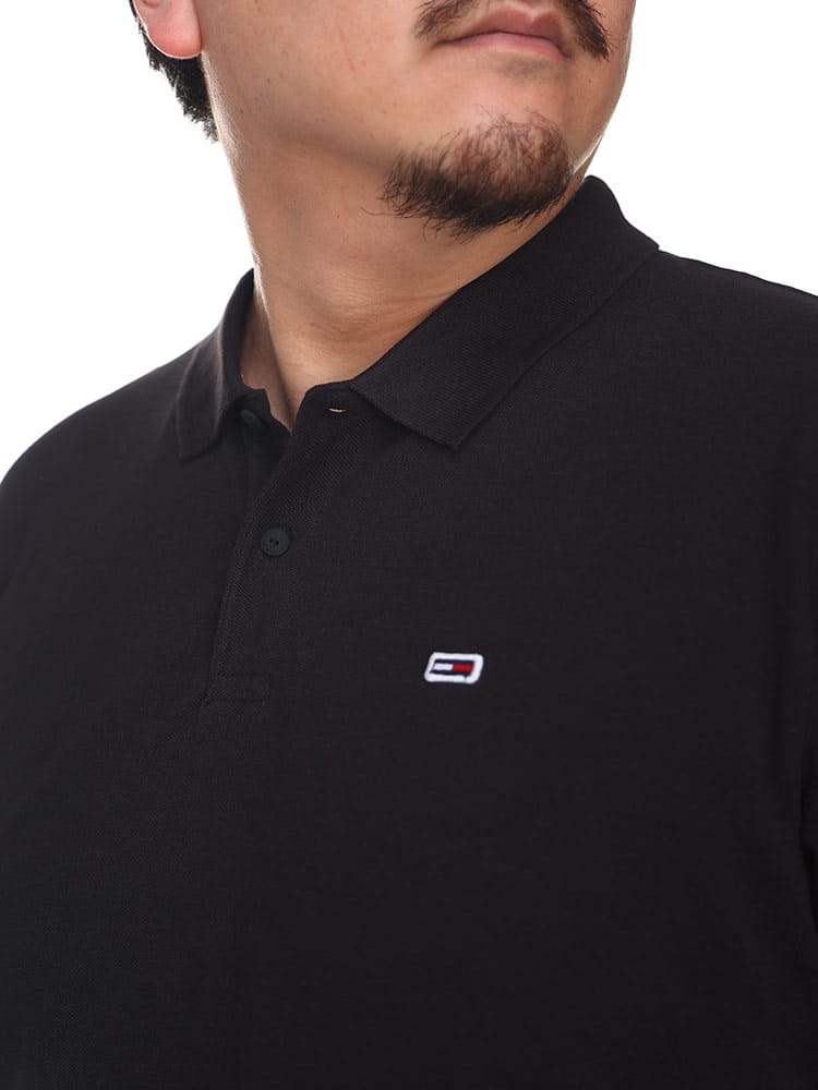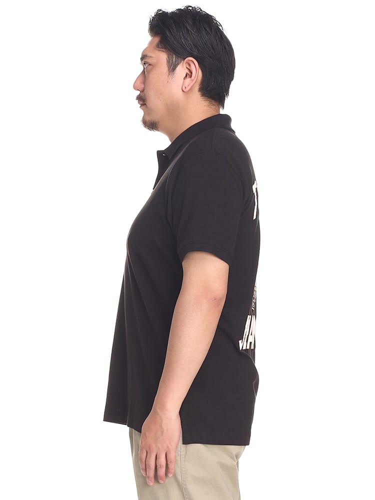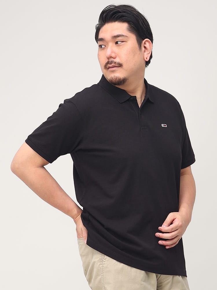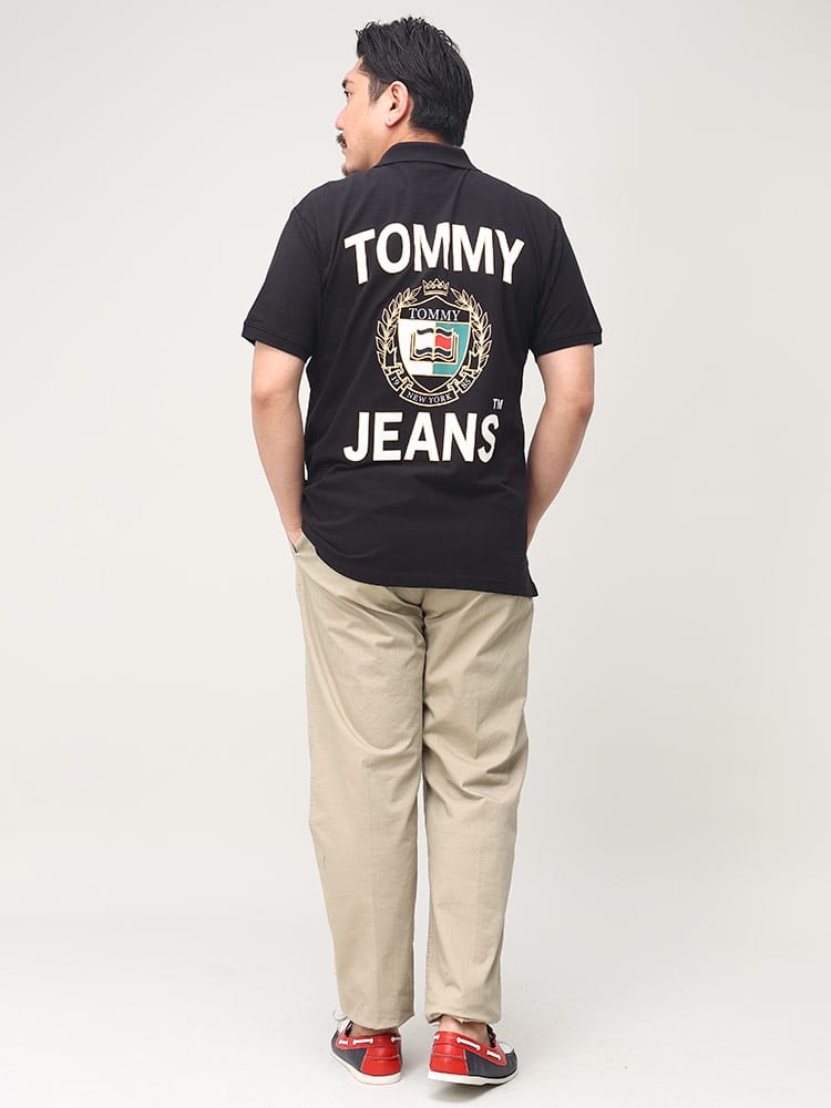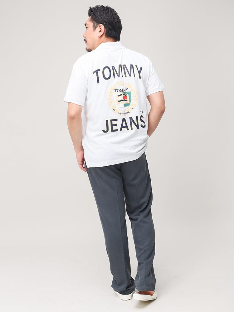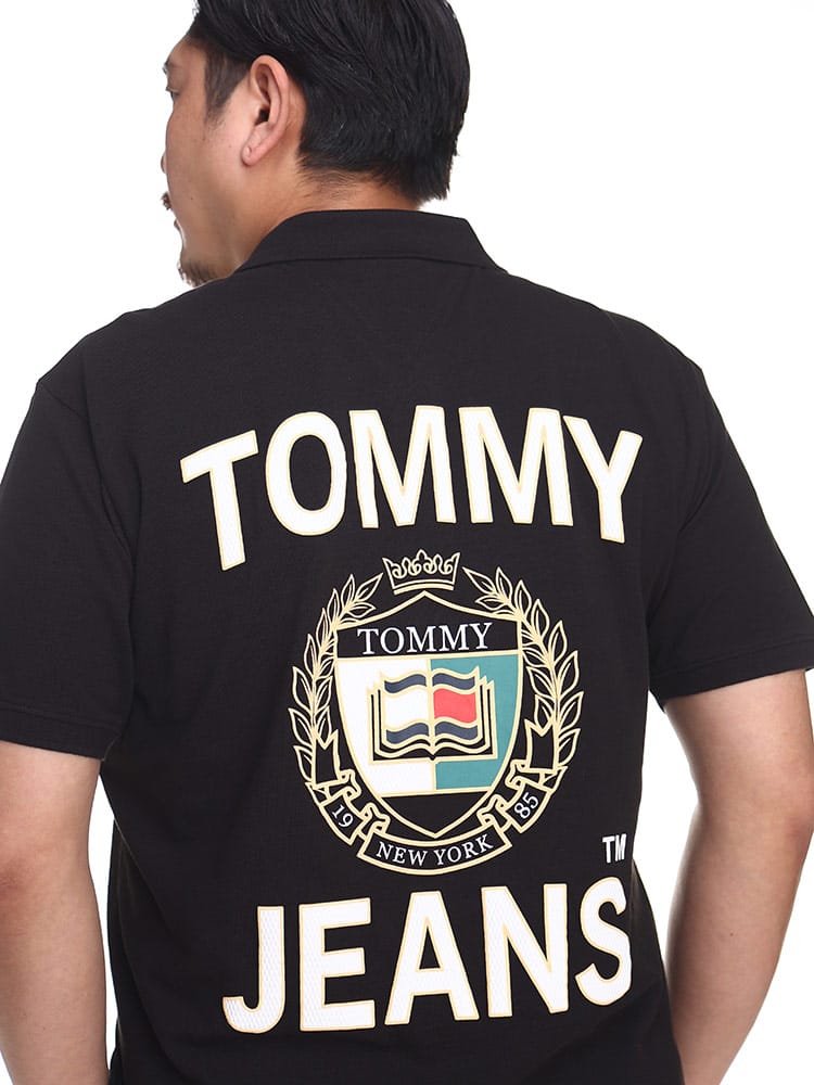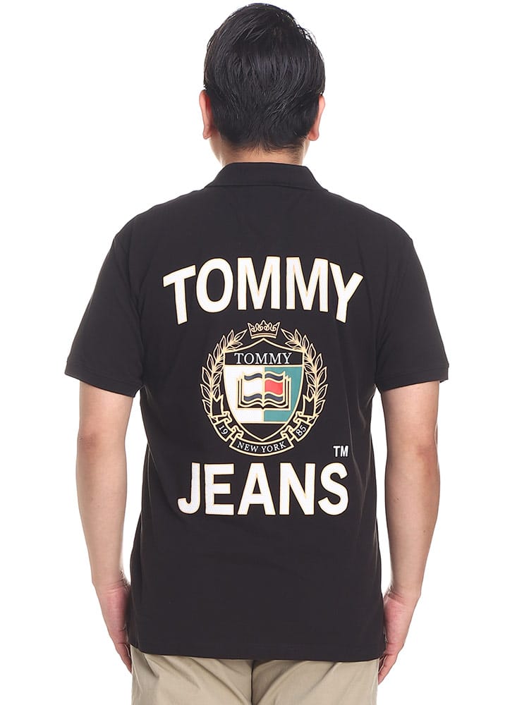 TOMMY JEANSのバックプリント 半袖 ポロシャツ。背面のほぼすべてを使ってプリントされたインパクトのあるデザイン。フロッキープリントを織り交ぜて立体的なプリントとなっているのがポイントです。フロントはシンプルなロゴ刺繍がワンポイントとして。