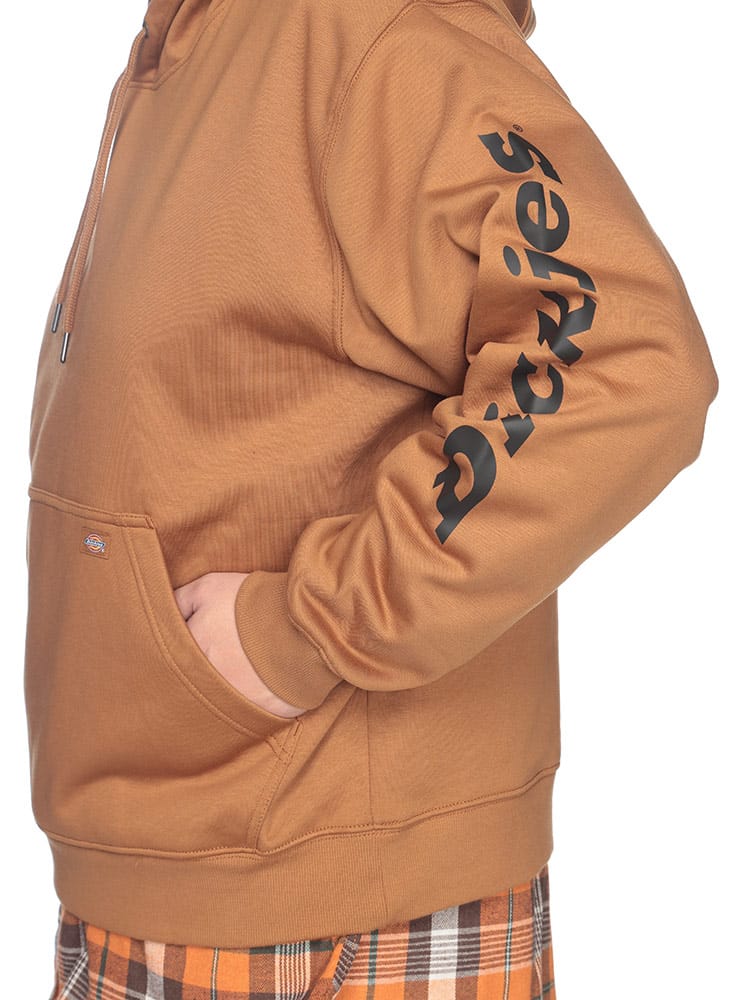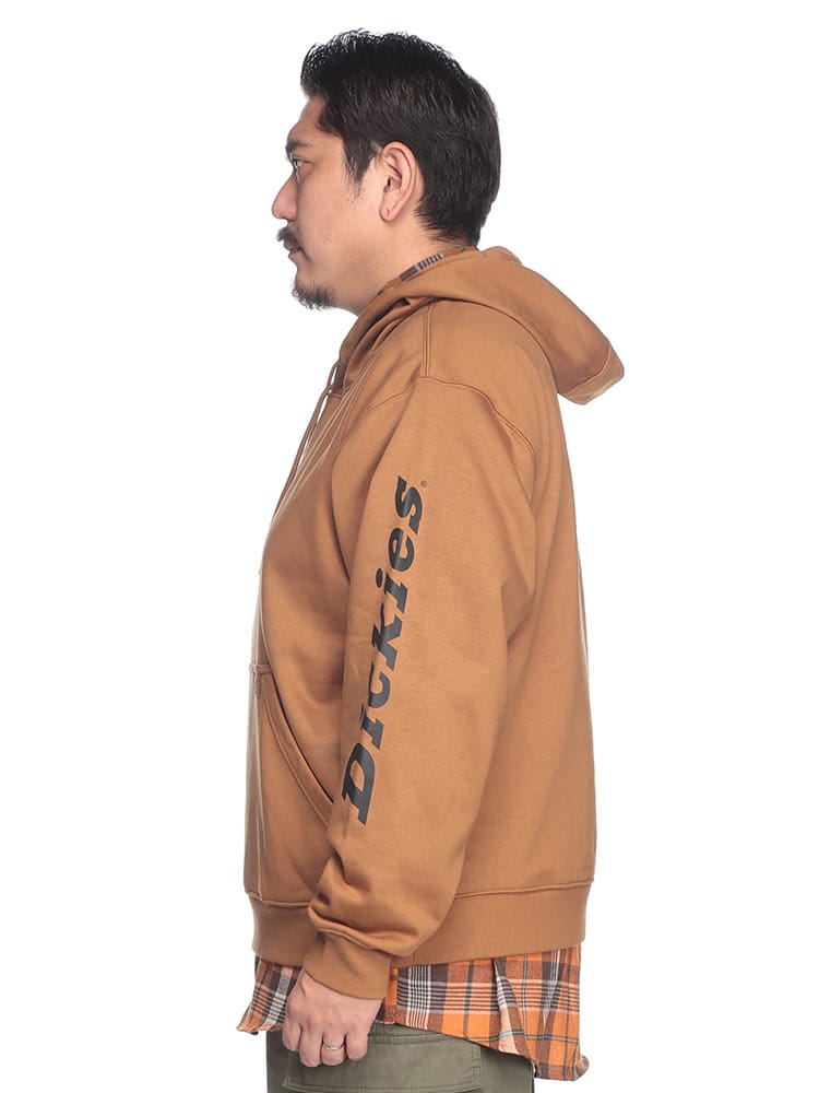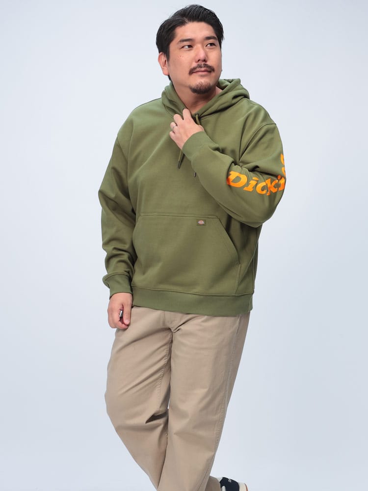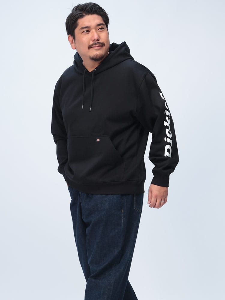 左袖にロゴプリントが施されたスタイリッシュなプルオーバーパーカーです。DWR加工により撥水性があり、軽い雨や汚れに強いのが特徴。裏起毛素材で暖かく秋冬シーズンにぴったりのアイテムです。