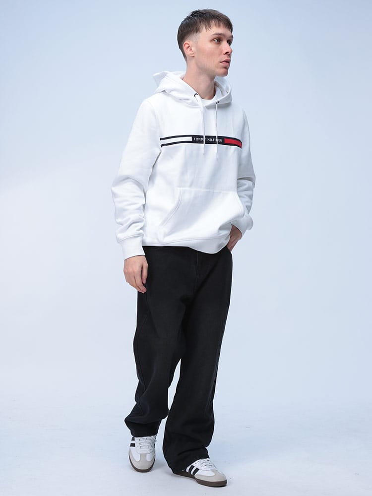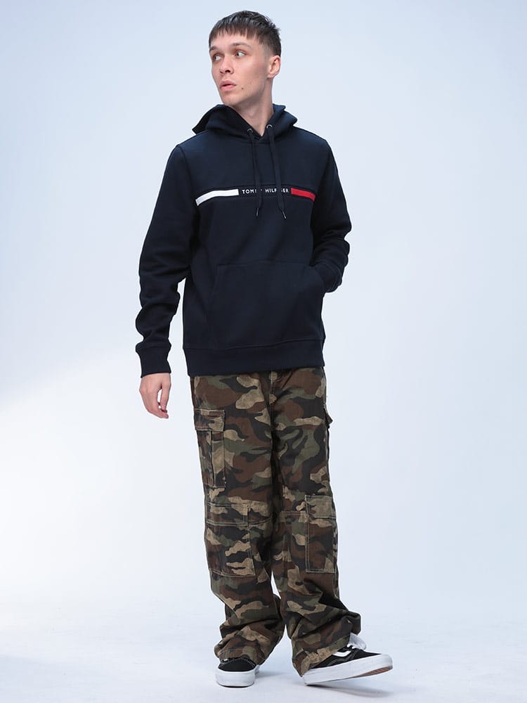 Tommy Hilfigerの定番フーディー。胸元のブランドロゴが目を引くデザインで、カジュアルなスタイルにぴったり。裏起毛で暖かく、柔らかな肌触りが特徴です。ゆったりとしたシルエットでリラックスして着用できます。普段使いはもちろん、軽い運動時にもおすすめです。