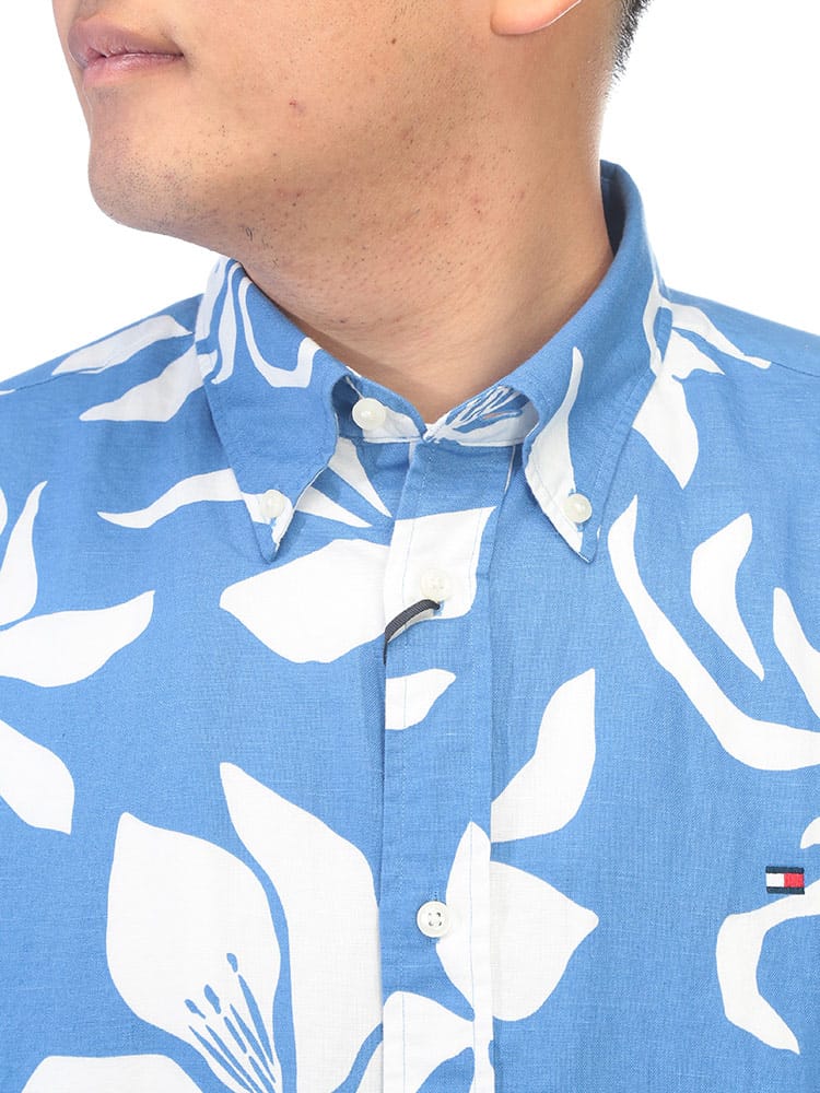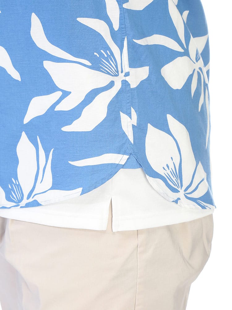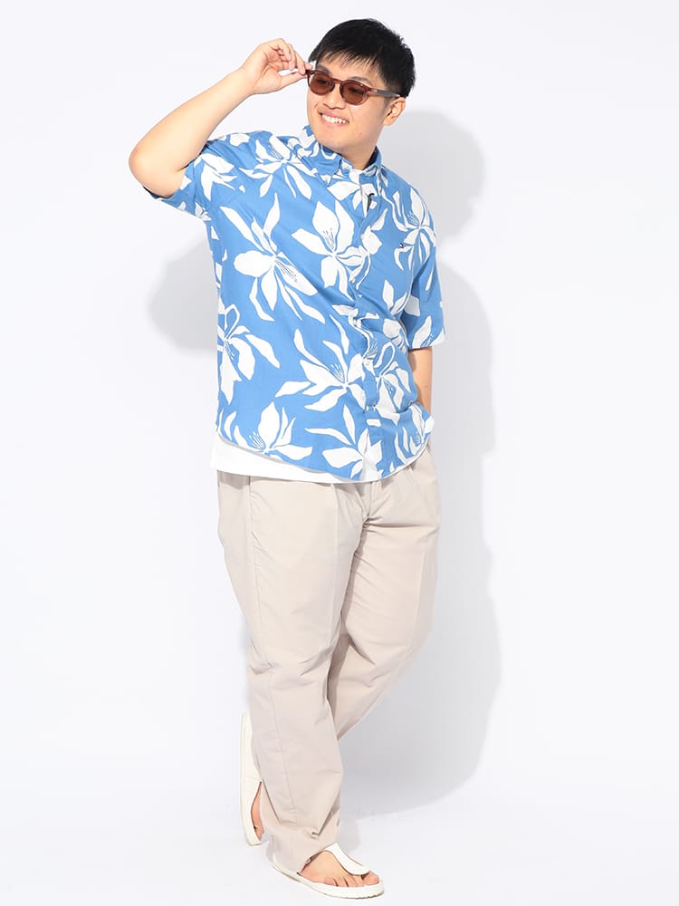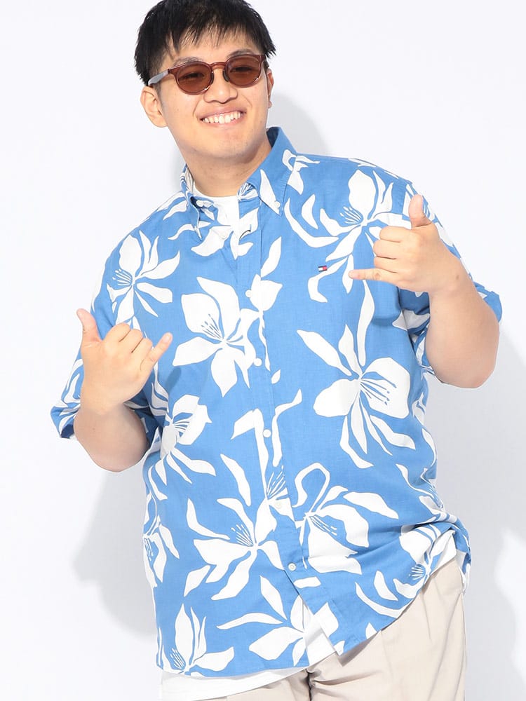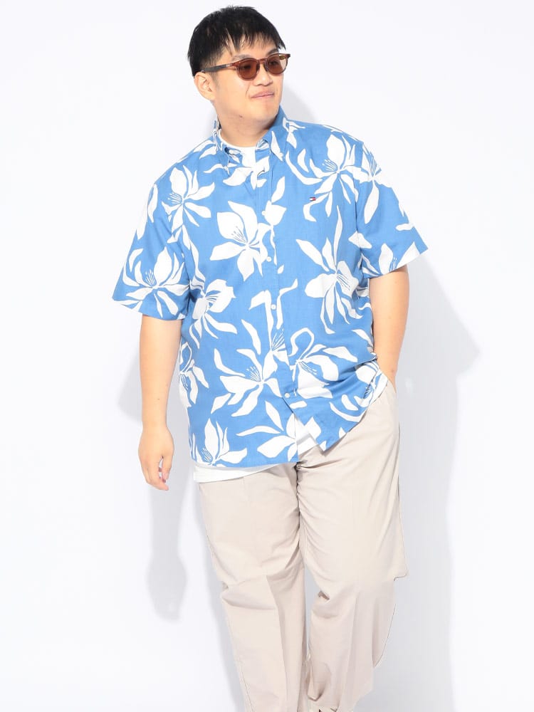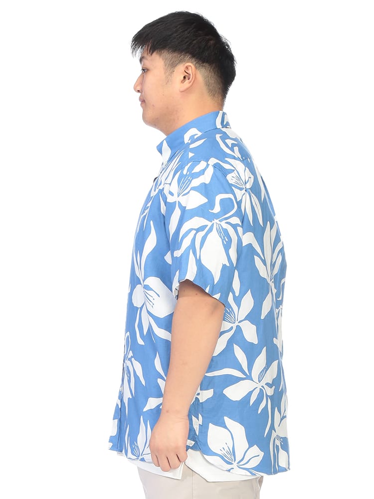リゾートムード漂う大きいサイズのボタンダウンアロハシャツが登場。洗練されたボタニカル柄を全面に配した総柄デザインが、大人の夏スタイルに華やかさと品格をプラスします。素材には清涼感溢れるリネンと肌触りの良いコットンを絶妙にブレンド。麻特有の通気性と速乾性に優れ、蒸し暑い季節もさらりと涼しく、軽やかな着心地をキープします。襟元はボタンダウン仕様にすることで、アロハシャツ特有のラフさを抑え、スマートで清潔感のある首回りを演出。ゆったりとしたサイジングが体型を自然にカバーし、バカンスからタウンユースまで幅広く活躍します。季節感のある上質な素材使いと高いデザイン性が融合した、夏を優雅に彩る主役級のシャツです。