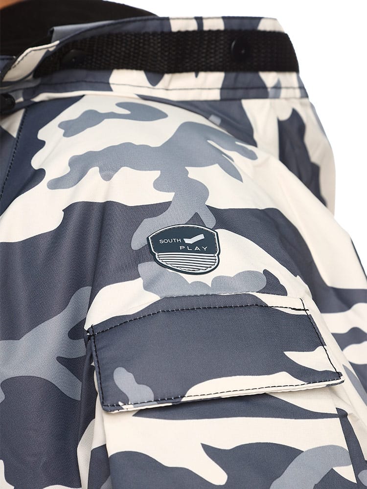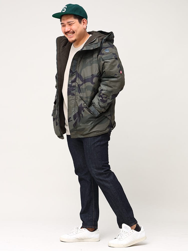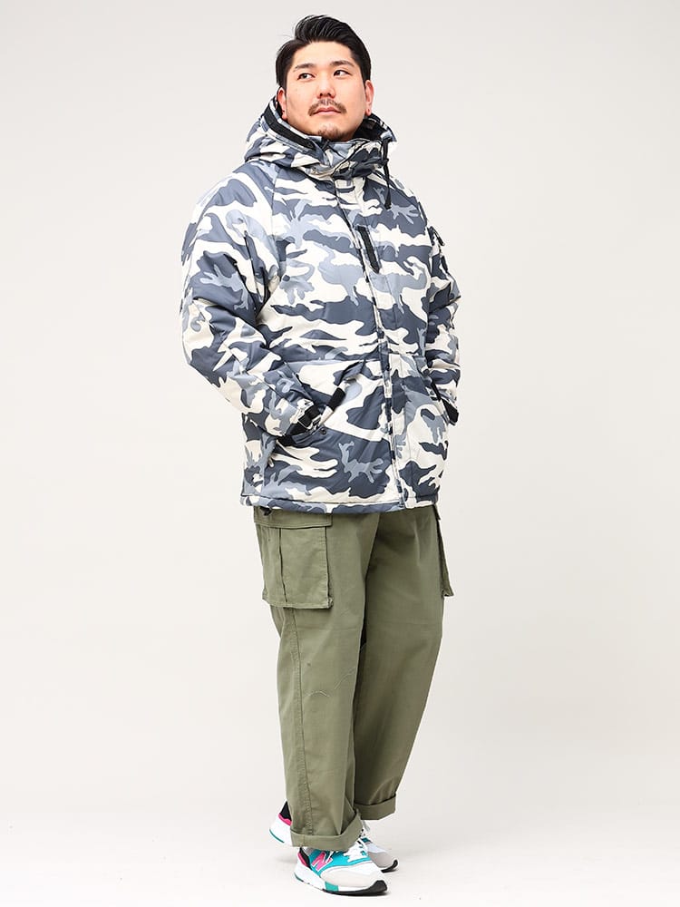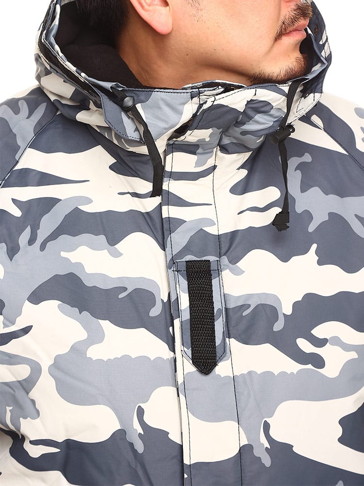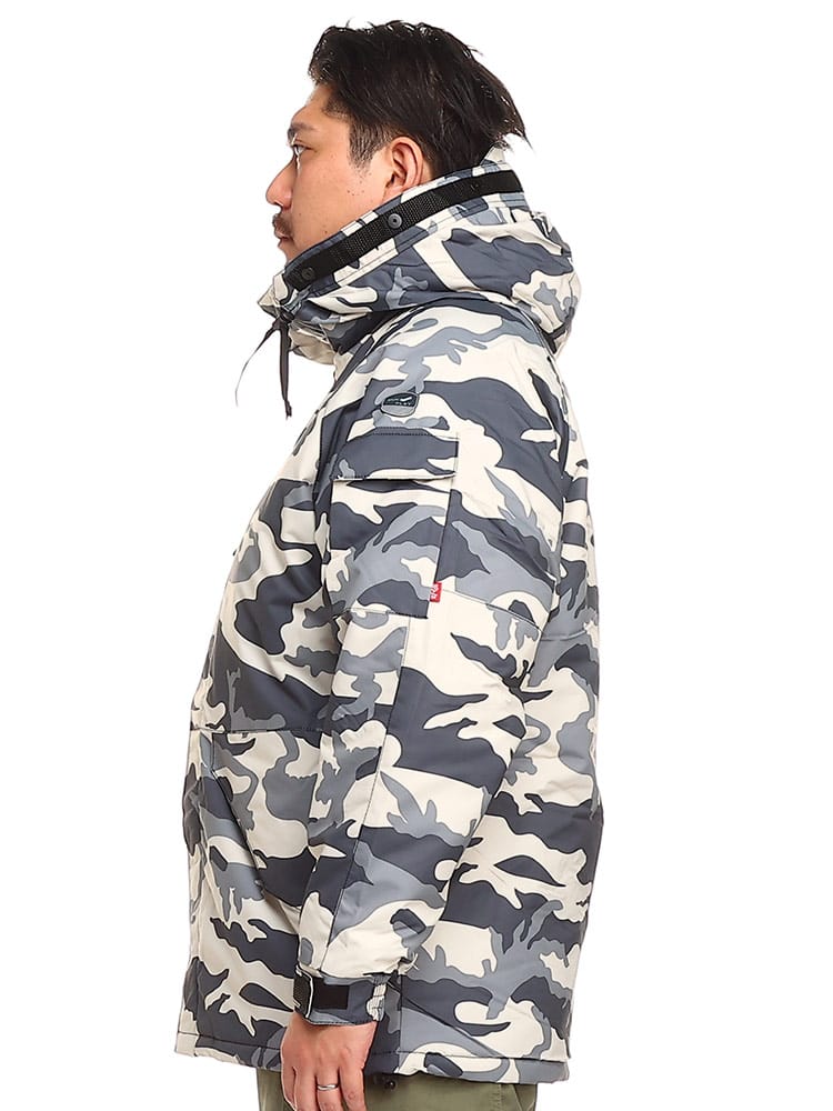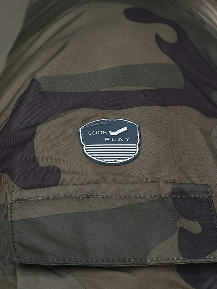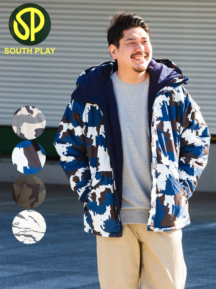 スノーボードウェアを感じさせる、SOUTH PLAYの迷彩柄 裏フリース フルジップ 中綿 ジャケットです。裏地フリースのあたたかな着心地と、袖ベルト、裾のドローコードが寒さをシャットアウト。ラグランデザインなので肩周りの窮屈さも感じにくいつくりとなっています。カラーによって見た目の違う迷彩のバリエーションが特徴的な一着。