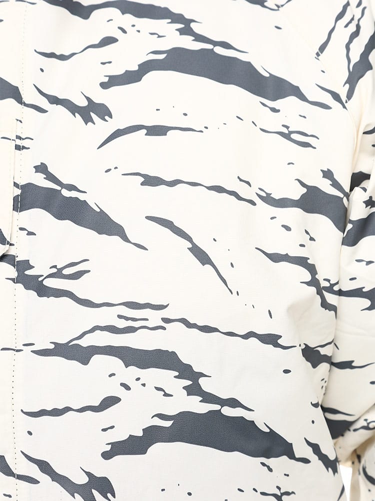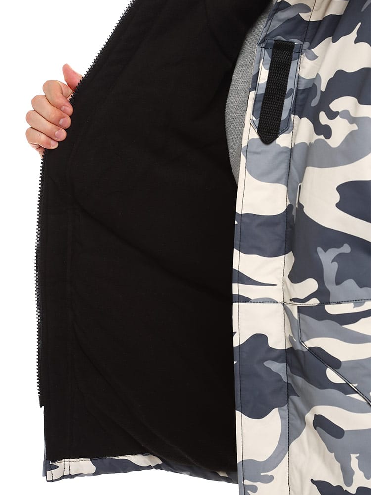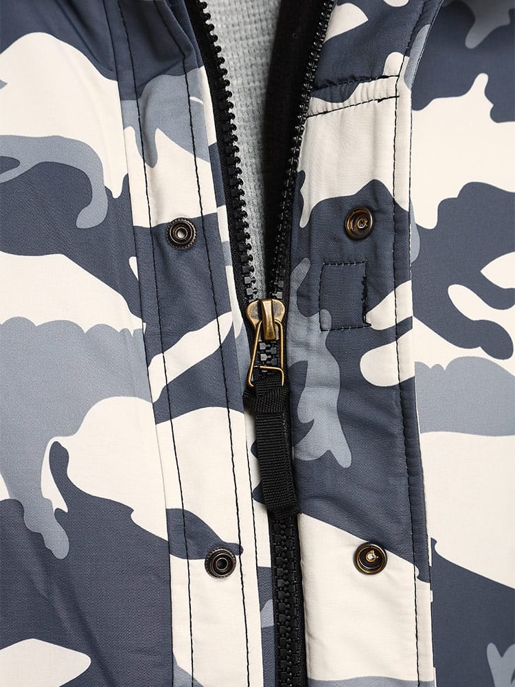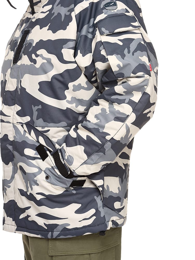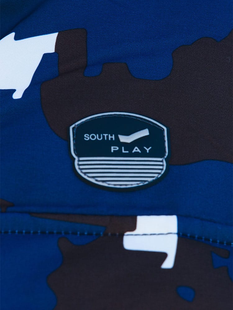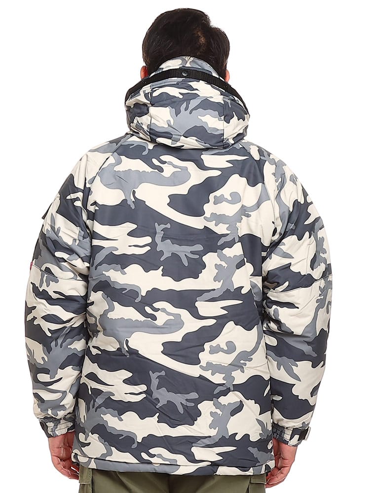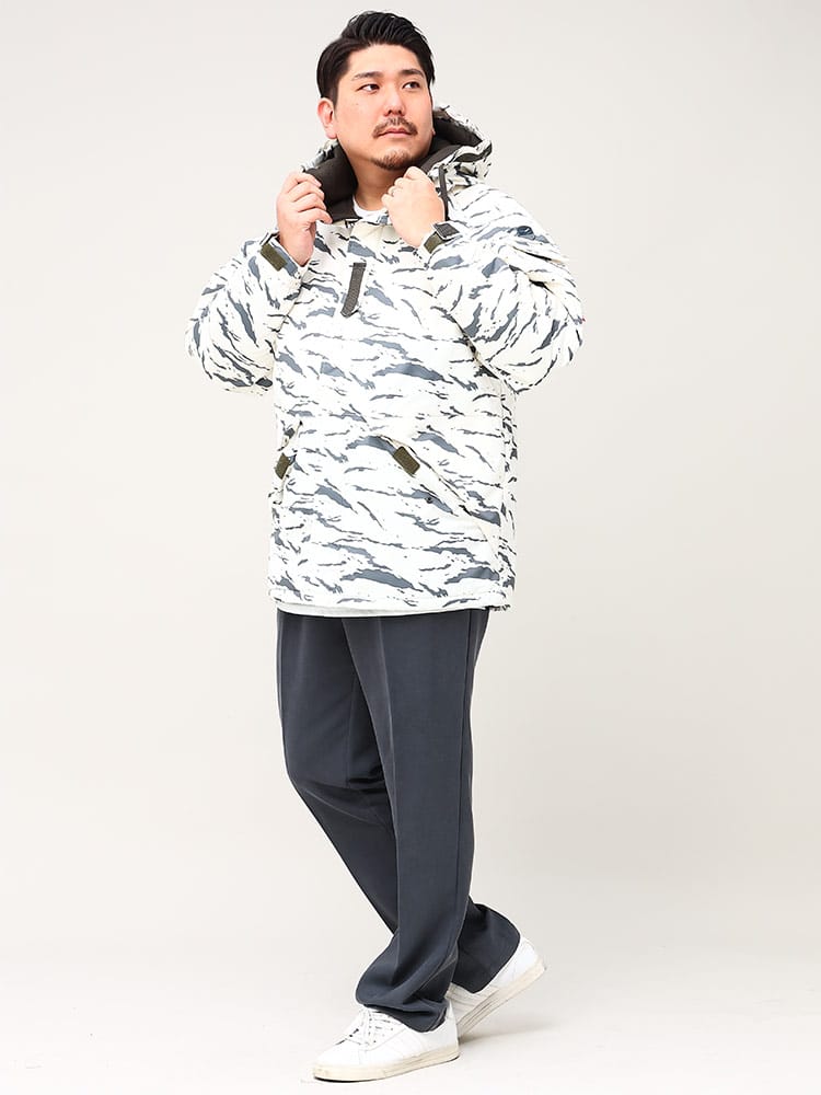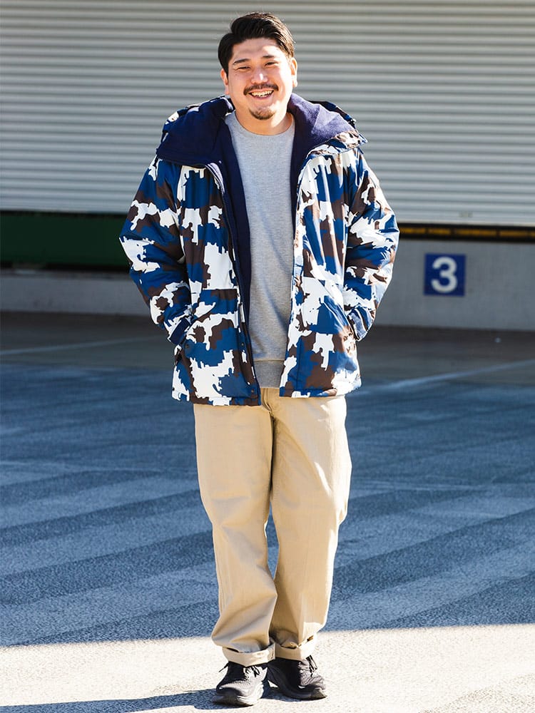 スノーボードウェアを感じさせる、SOUTH PLAYの迷彩柄 裏フリース フルジップ 中綿 ジャケットです。裏地フリースのあたたかな着心地と、袖ベルト、裾のドローコードが寒さをシャットアウト。ラグランデザインなので肩周りの窮屈さも感じにくいつくりとなっています。カラーによって見た目の違う迷彩のバリエーションが特徴的な一着。