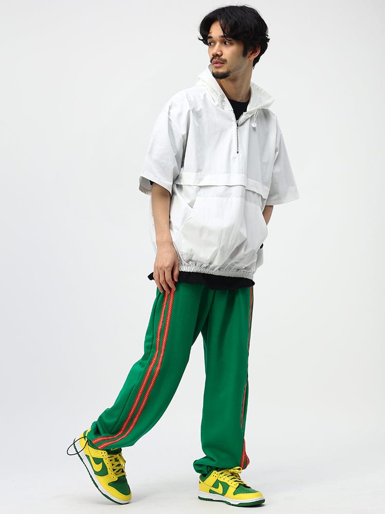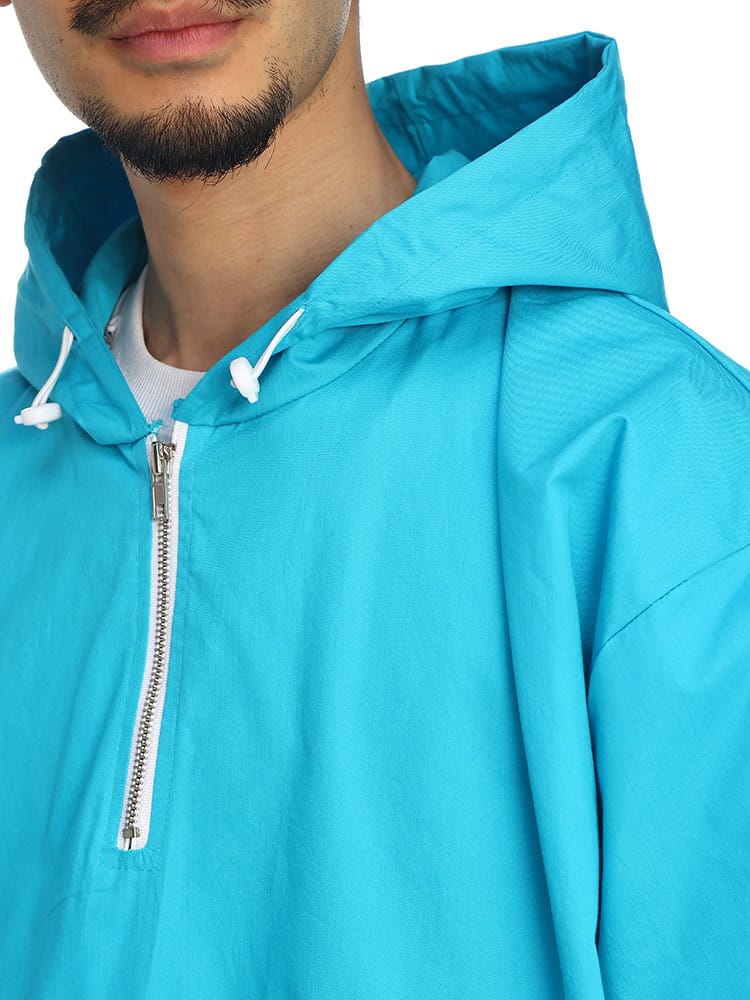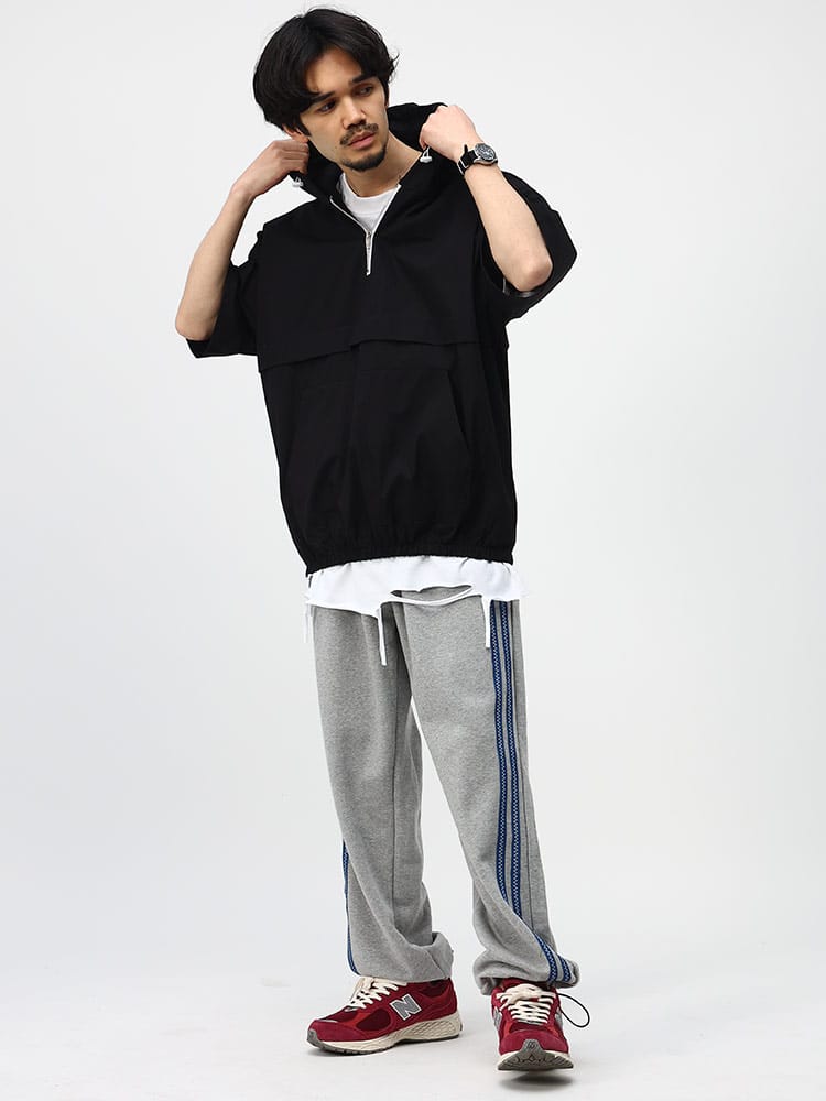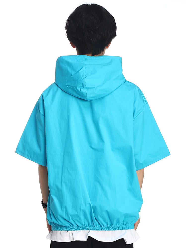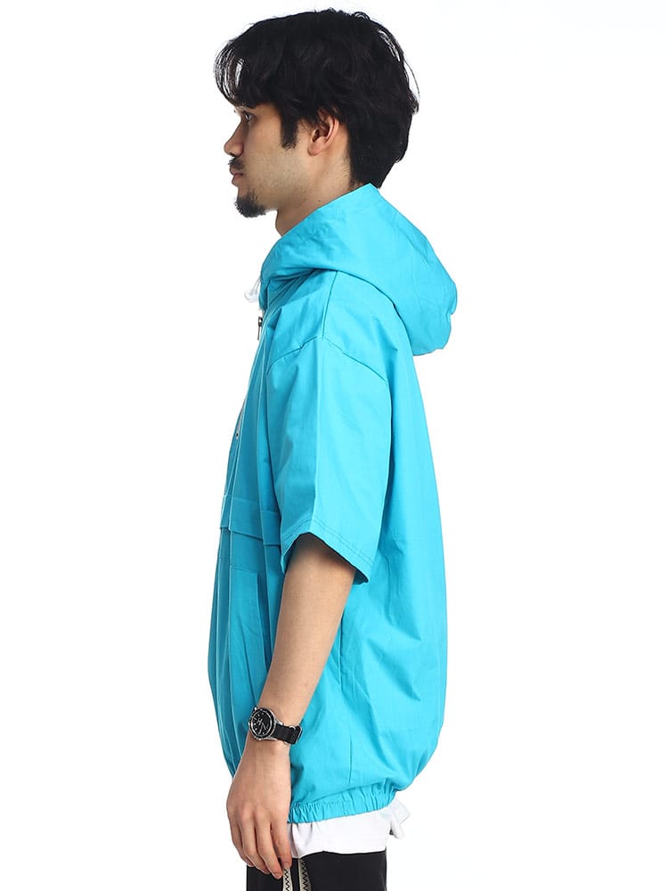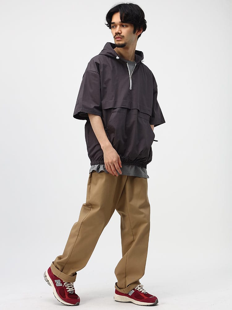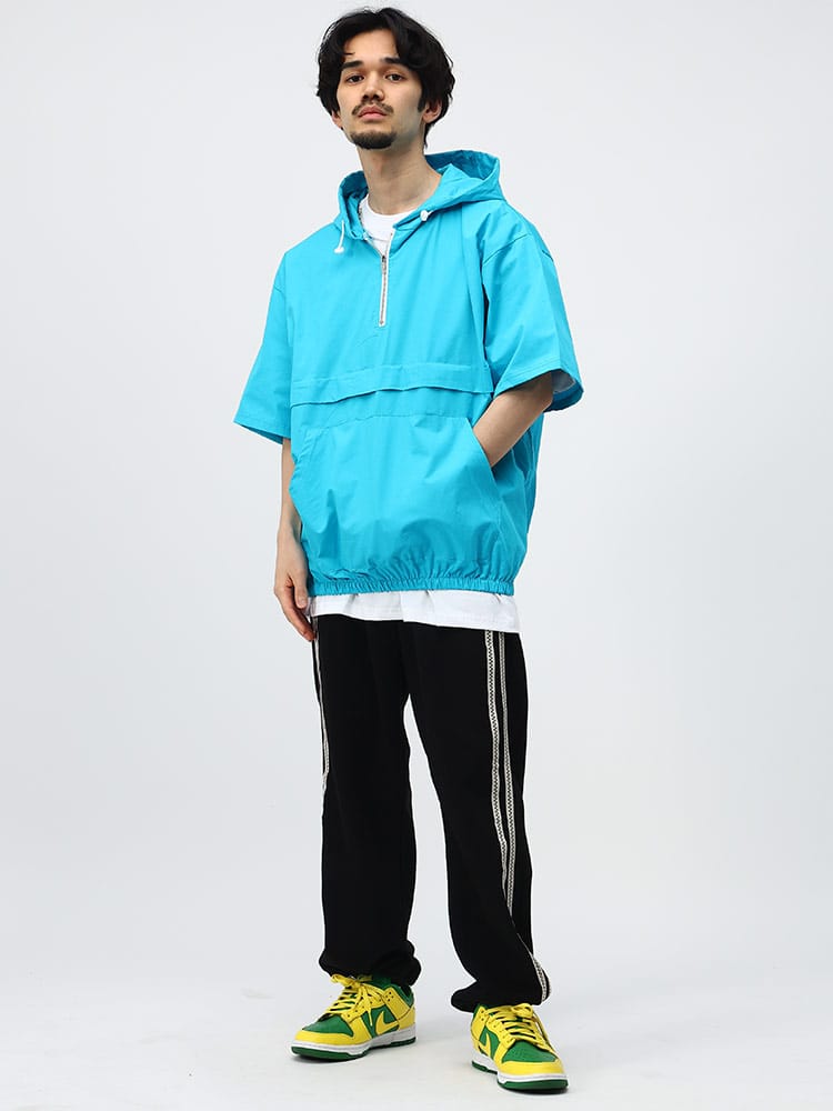 Notice Boardのハーフジップ 半袖 アノラックパーカーです。薄手ながらもハリのあるコットンを使用したカジュアルなパーカー。ウエストにはゴムが入っているので、腰周りがスマートなシルエットになるのが嬉しいポイント。