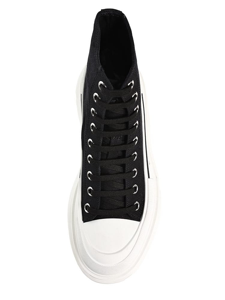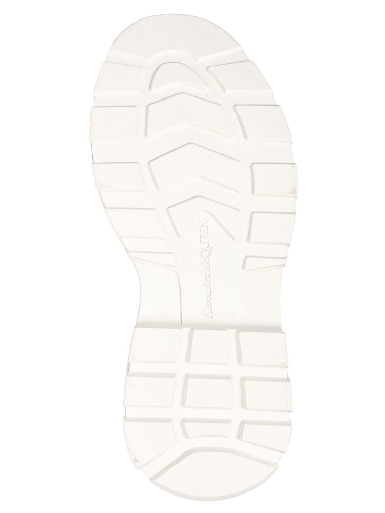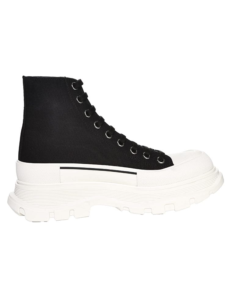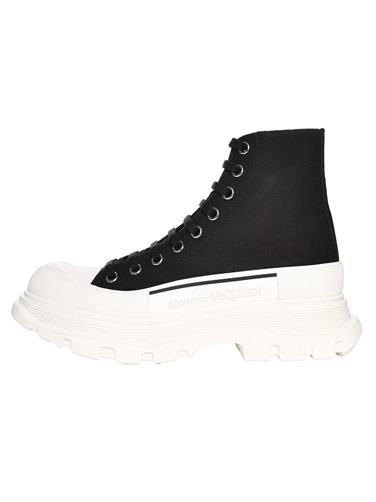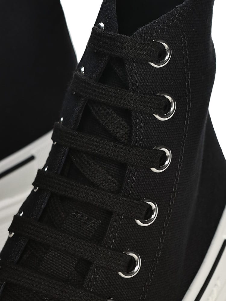 キャンバス製のレースアップブーツです。ソールは厚みのあるオーバーサイズのラバートレッドソールです。縁を囲む独特の質感のラバーに、Alexander McQueenのロゴが同色で施されています。ブーツのバックにブランドを象徴するリボンがあしらわれています。ラウンドトゥのブーツで、ラバー製のトゥキャップが付いています。