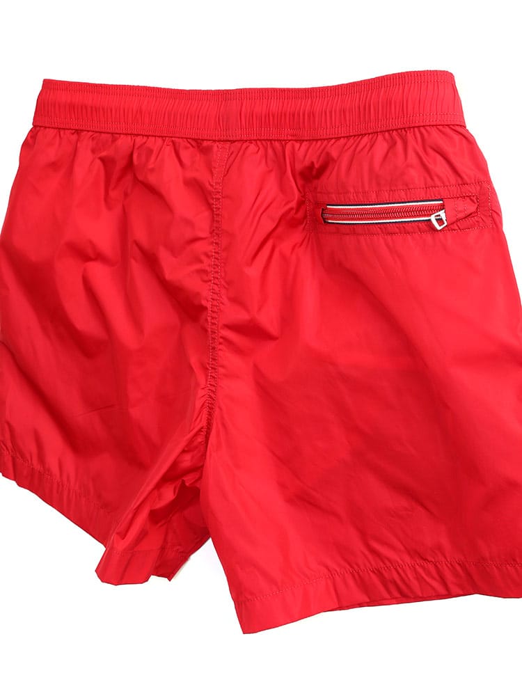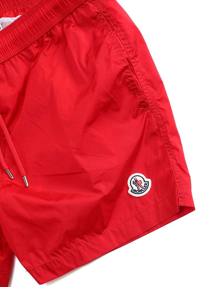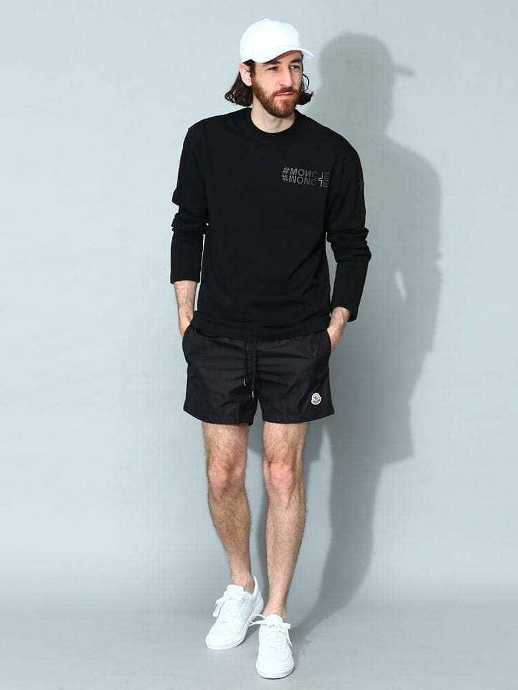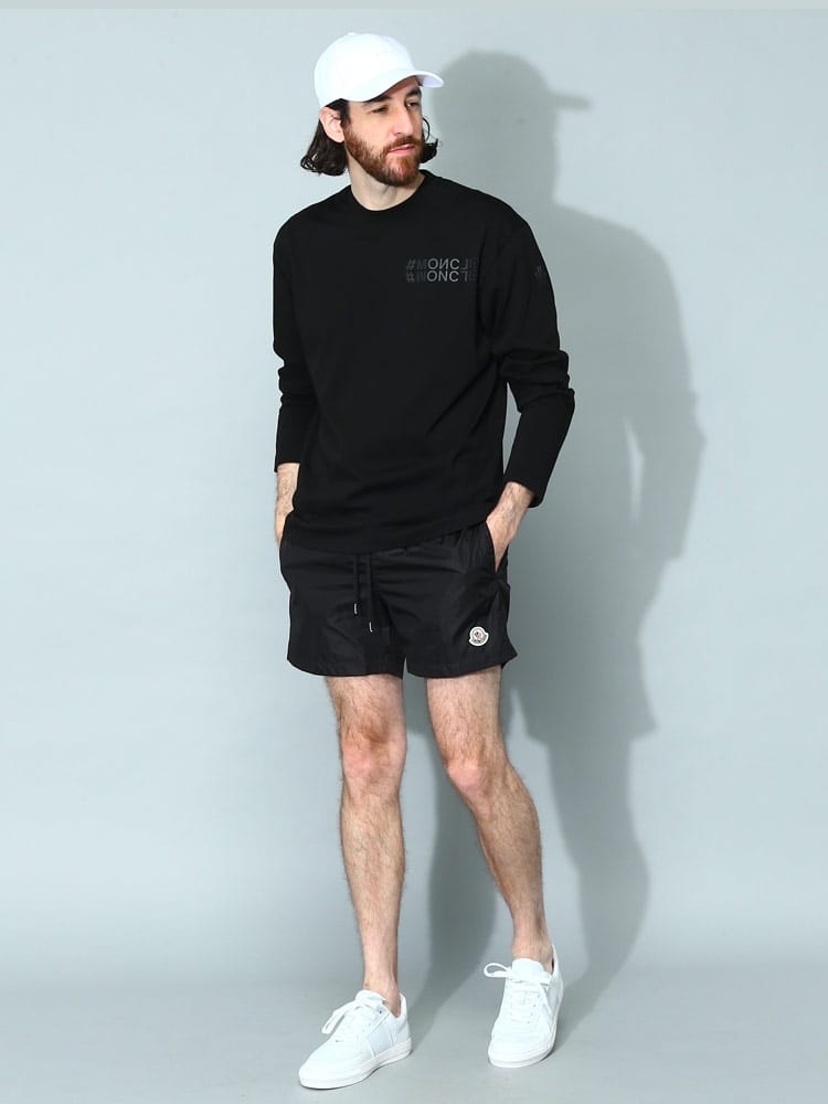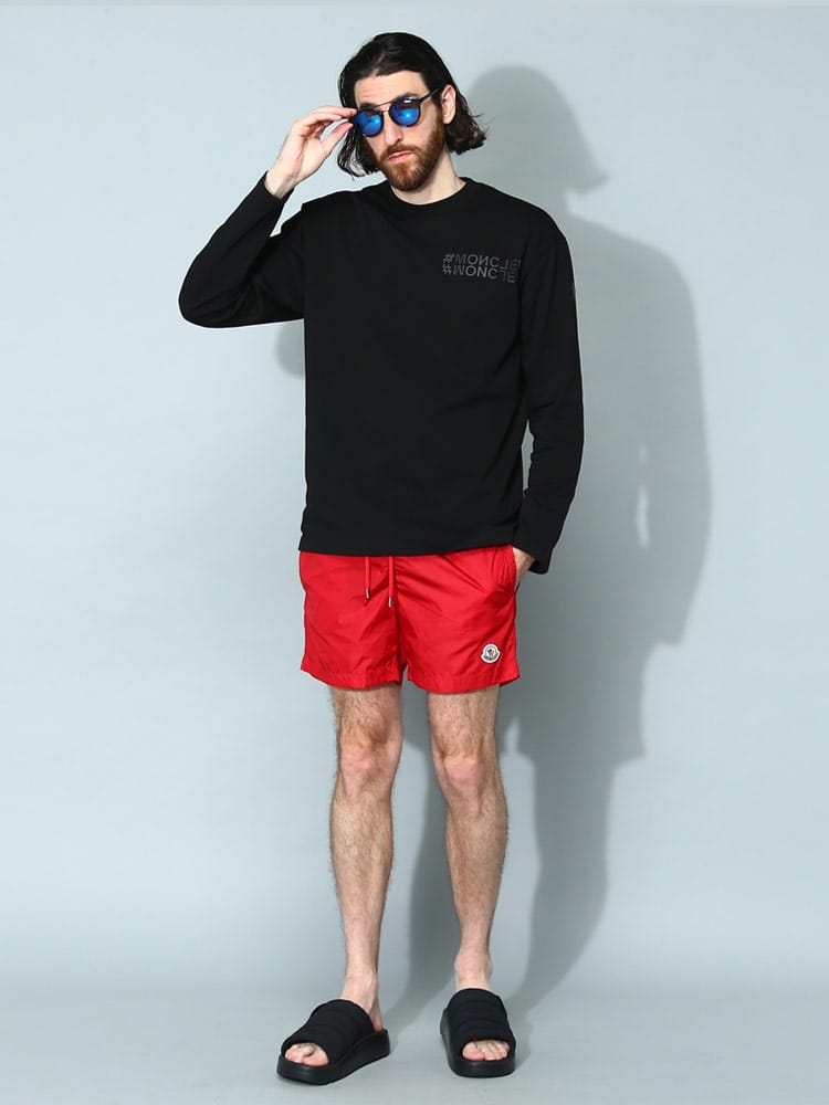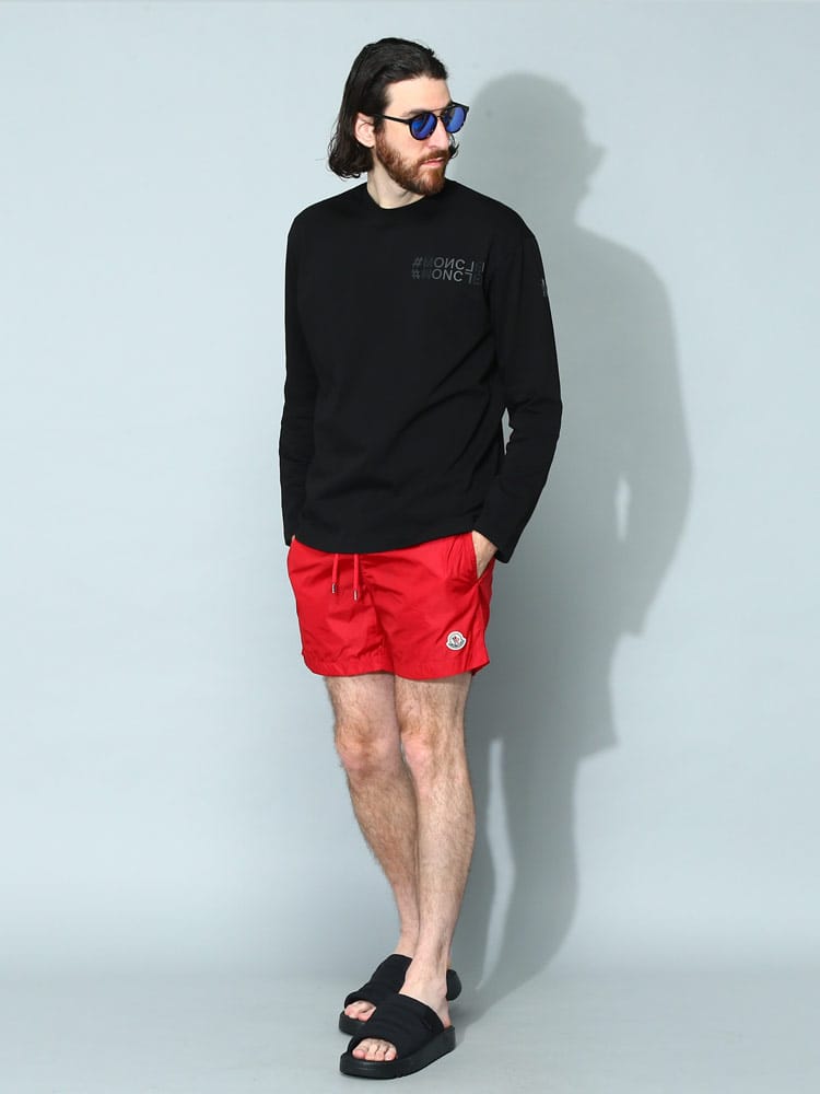 シンプルなシルエットのスウィムショーツです。フロント下にはモンクレールのロゴワッペン。バックポケットはジッパー開閉なので使い勝手のよいつくりに。ウエストゴムとドローコードで細かな調節が可能です。収納用のミニ巾着付き。