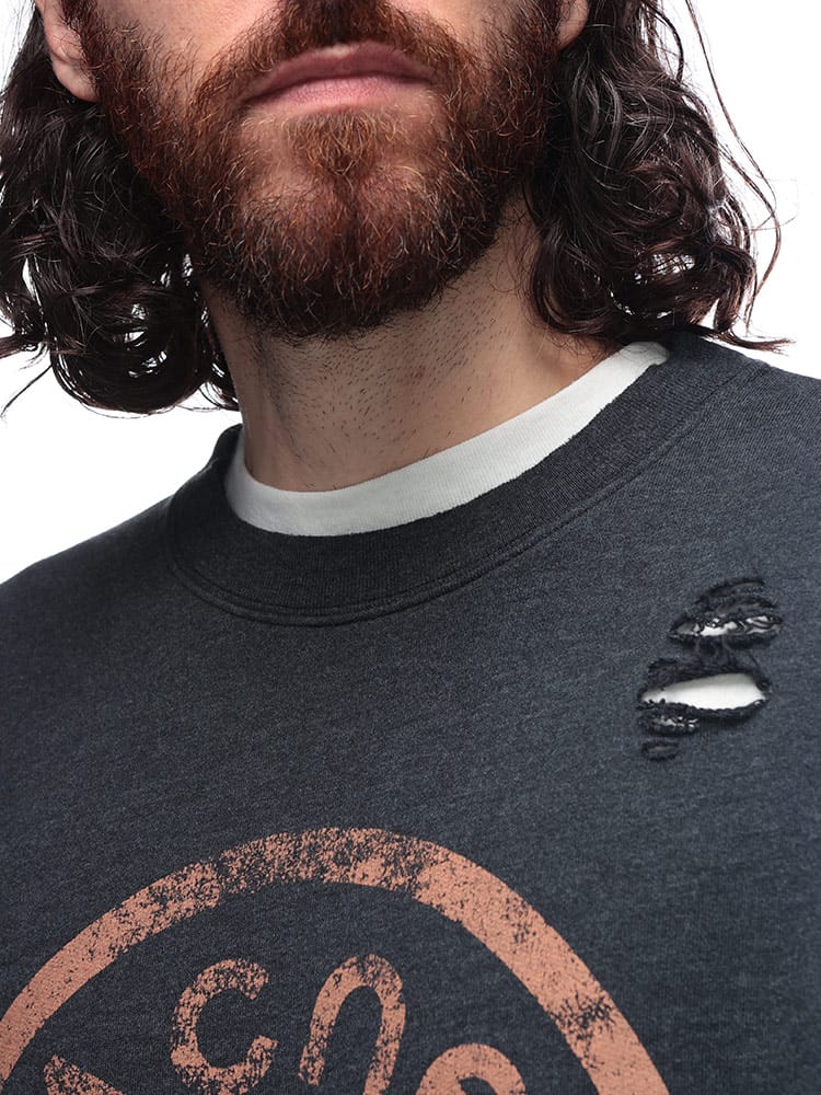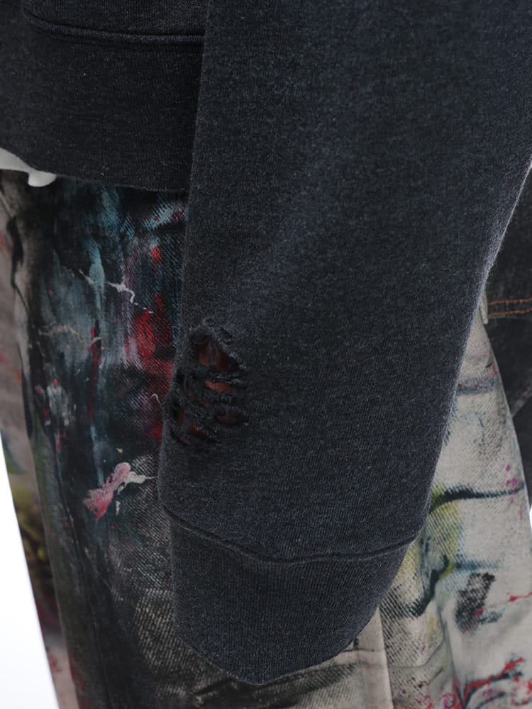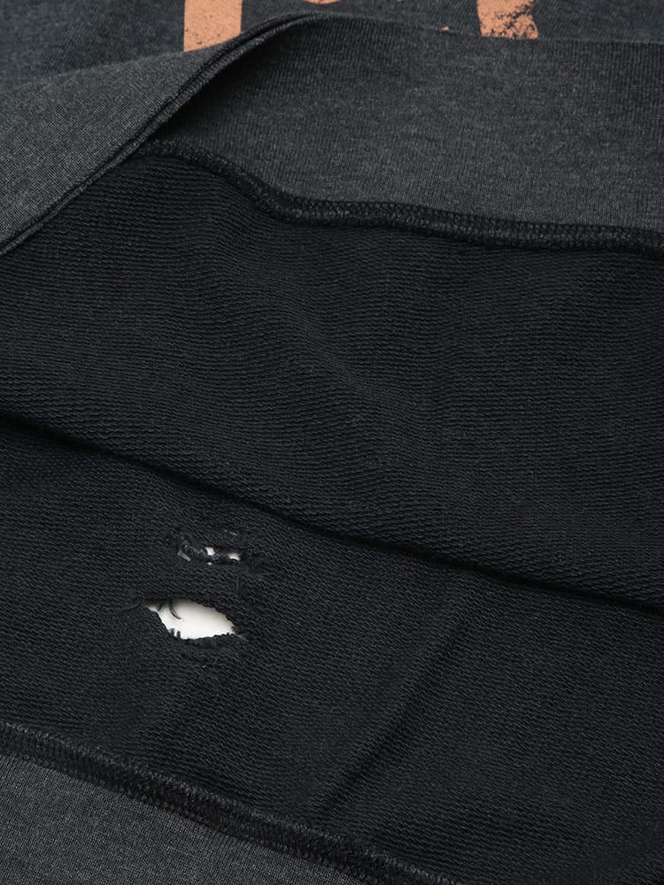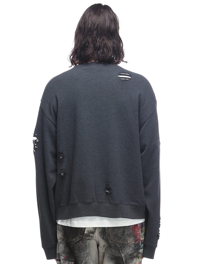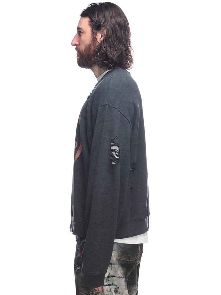 ダメージ加工プリントスウェットトレーナーは、ヴィンテージ感とモダンなデザインが融合した一着です。随所に施されたダメージ加工とユニークなプリントが、着こなしにエッジを効かせます。柔らかなスウェット素材で着心地も快適。一枚でサマになる存在感があり、カジュアルながらも個性的なスタイルを演出したい方におすすめです。