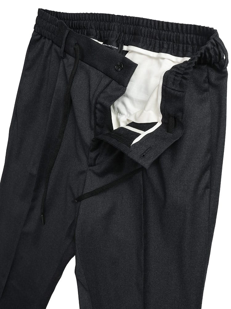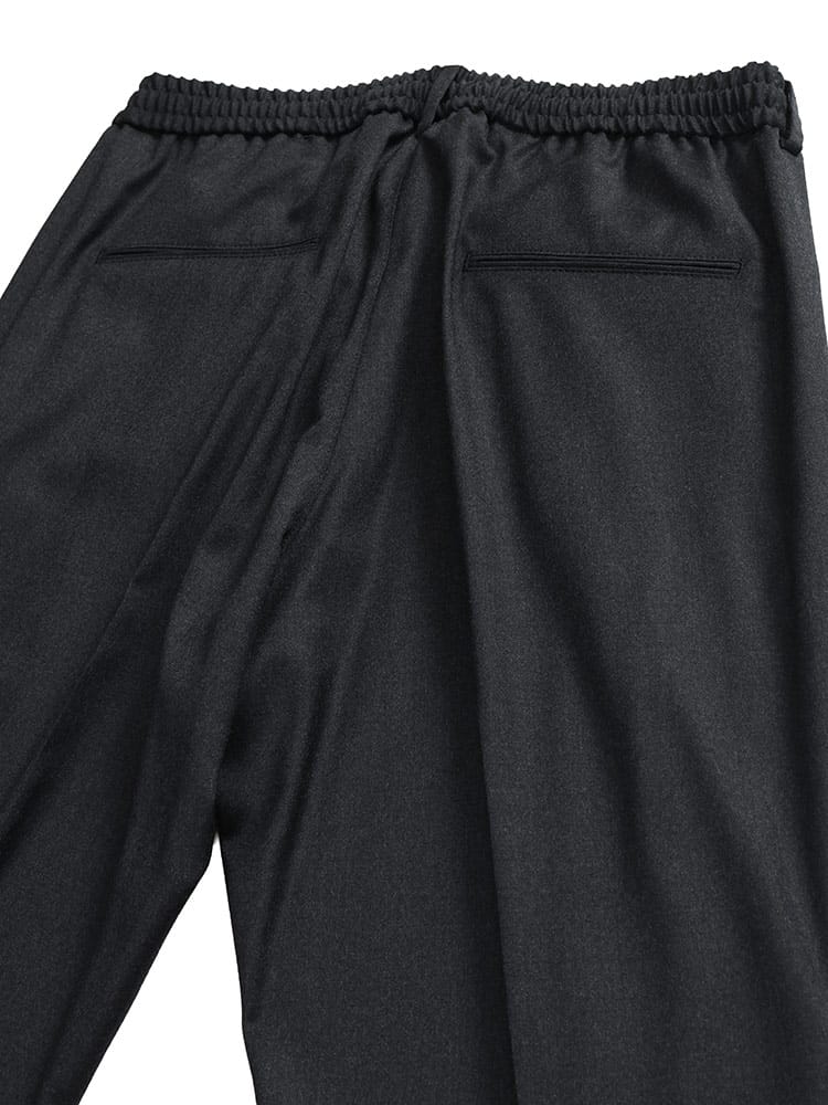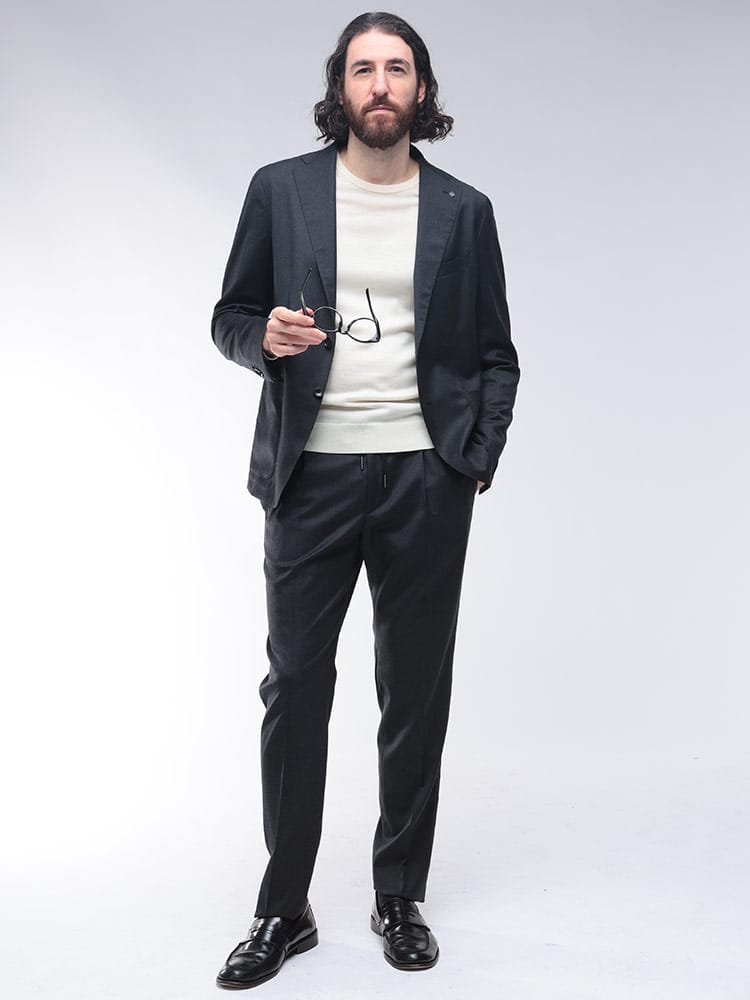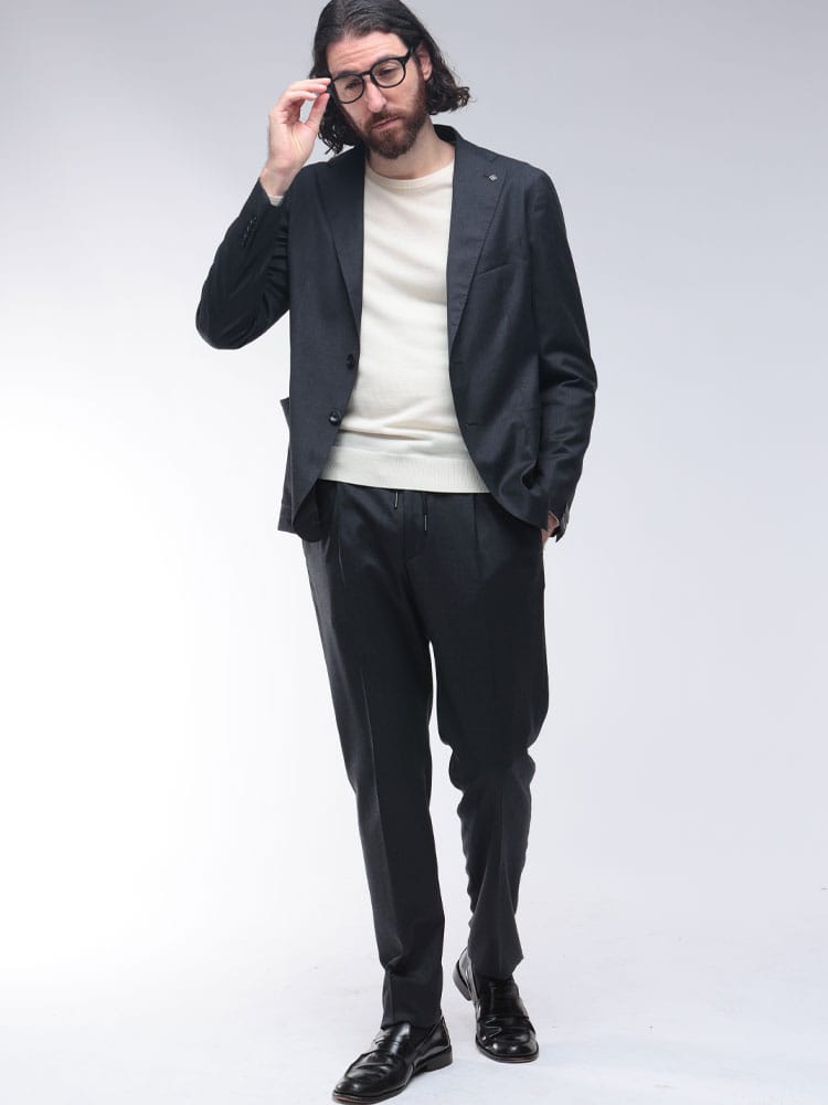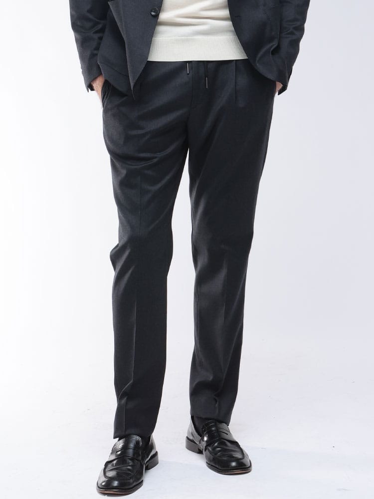 現代的なビジネススタイルに寄り添うセットアップスーツ。上質なウールにエラスタンを混紡することで、美しいシルエットはそのままに、快適なストレッチ性を実現しました。ウエストコードとウエストゴムのイージー仕様で、リラックスした穿き心地。ビジカジからフォーマルまで対応する汎用性の高さが魅力です。美しいドレープと極上の着心地を両立させた、時代を捉えた一着です。