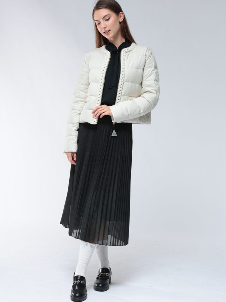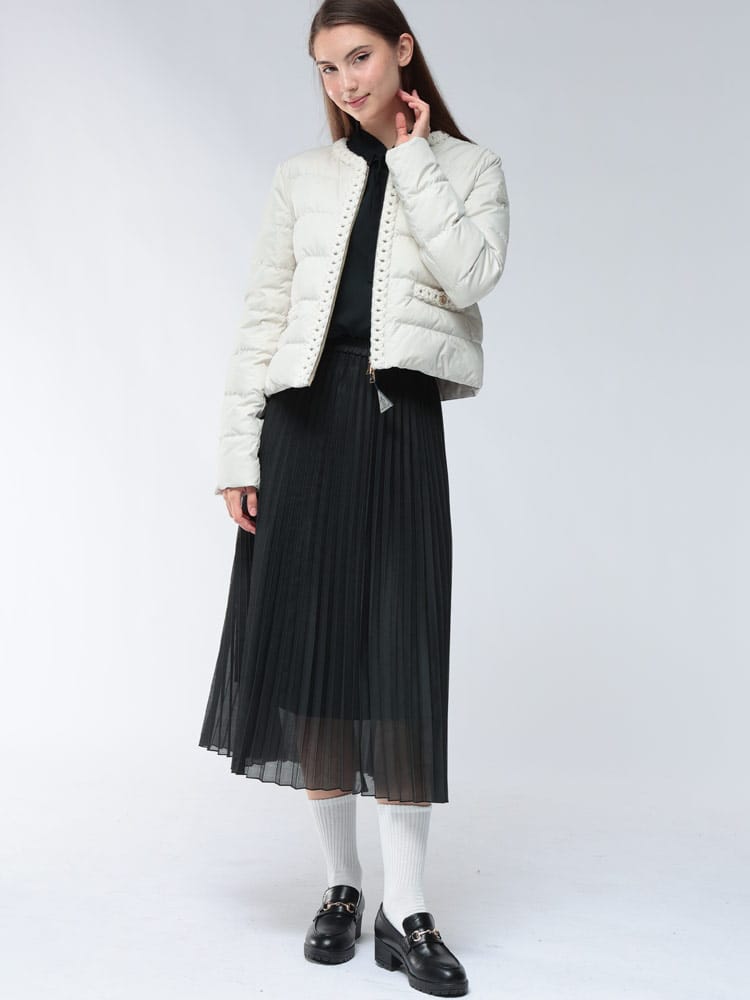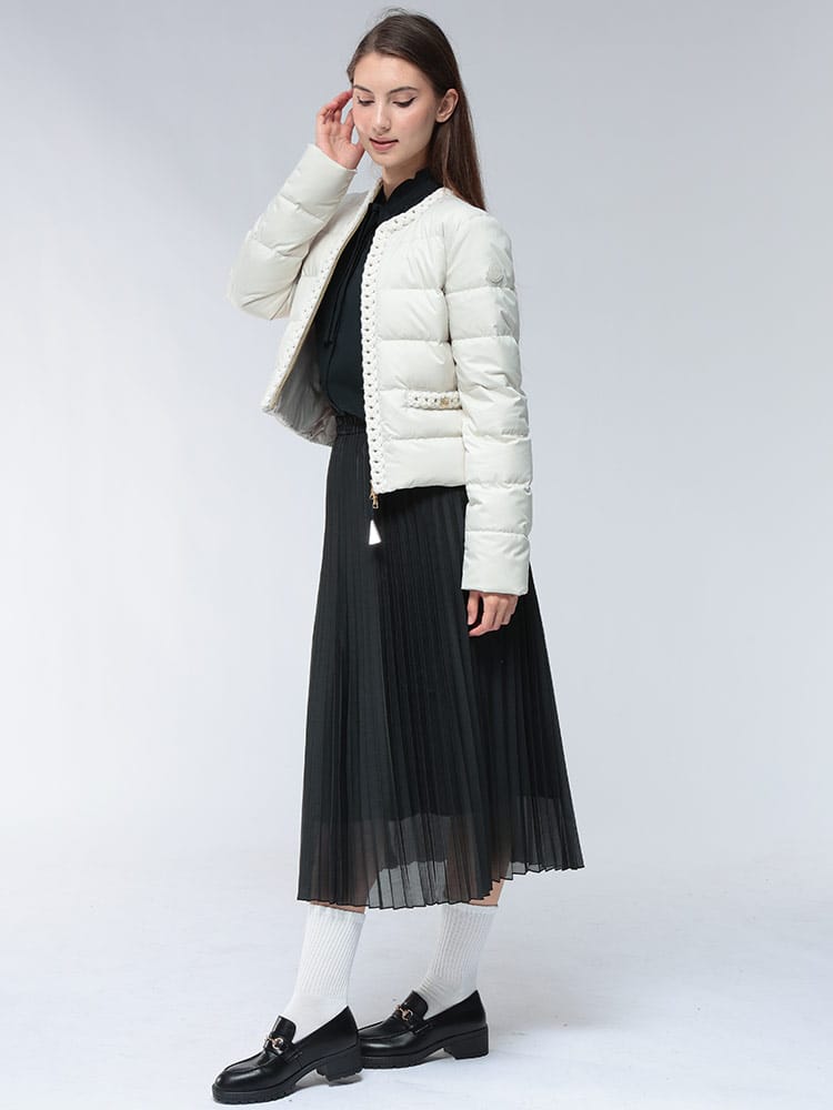 「MAUR」ショートダウンジャケットは、洗練されたノーカラーデザインが特徴で、首元をすっきりと見せ、上品な印象を与えます。上質なダウンが優れた保温性を発揮しながらも、軽量で快適な着心地を実現。カジュアルからきれいめスタイルまで、幅広いコーディネートにマッチし、大人の女性のエレガンスを引き立てます。
