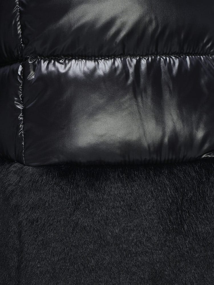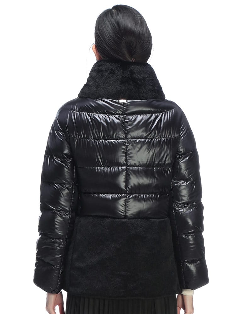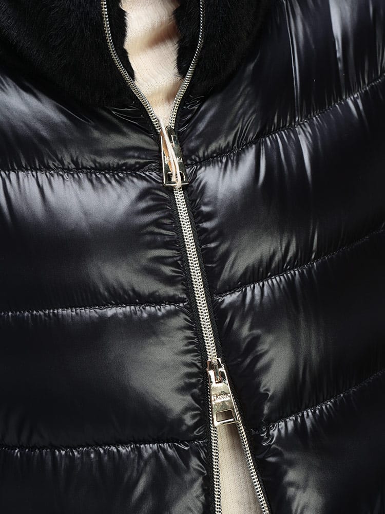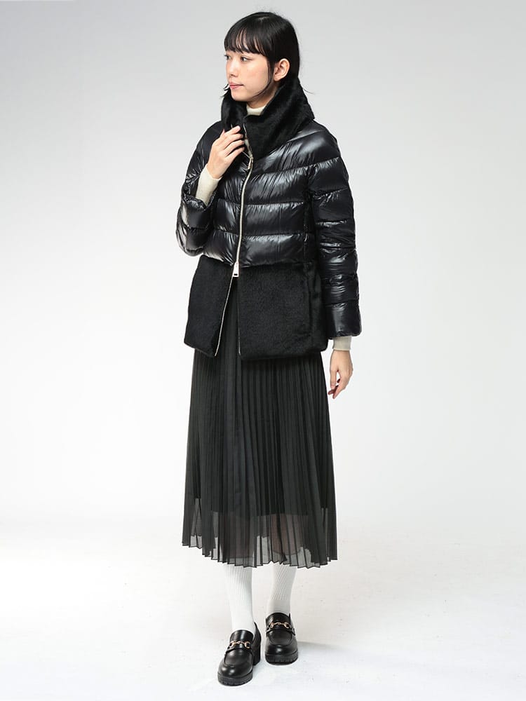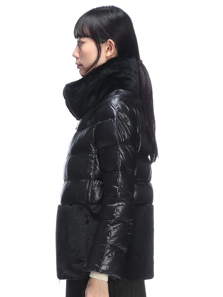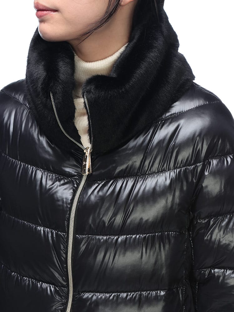 HERNOのエコファージャケットは、超軽量なウルトラライトナイロンと上質なダウンを使用し、シルクのような手触りと優れた耐水性を実現したエレガントな一着です。襟元と裾にあしらわれたヌートリア風のフェイクファーが、ダウンジャケットにリュクスな表情をプラス。ゴールドのダブルジップがアクセントとなり、カジュアルさを抑えた上品なスタイルが楽しめます。