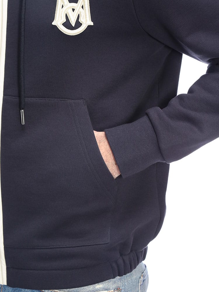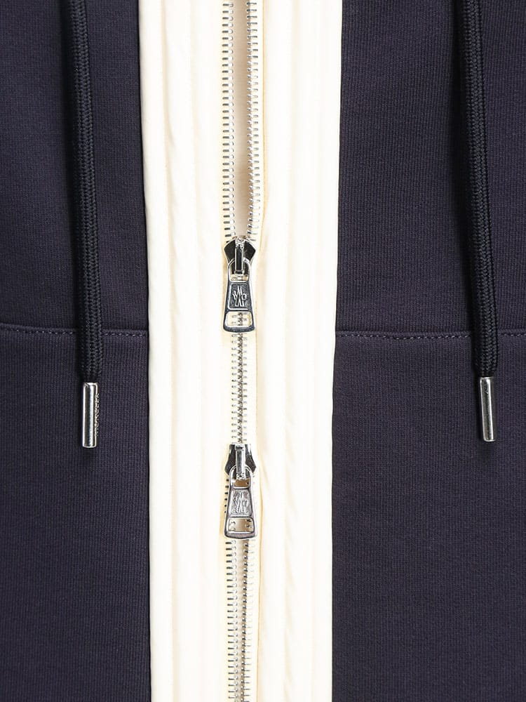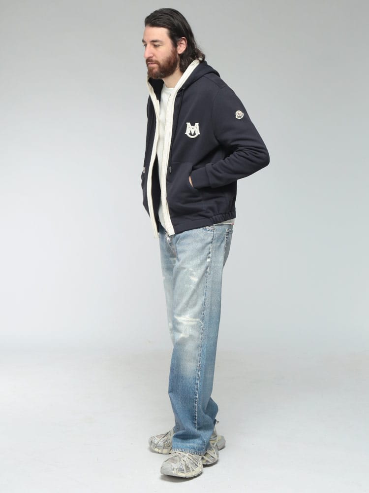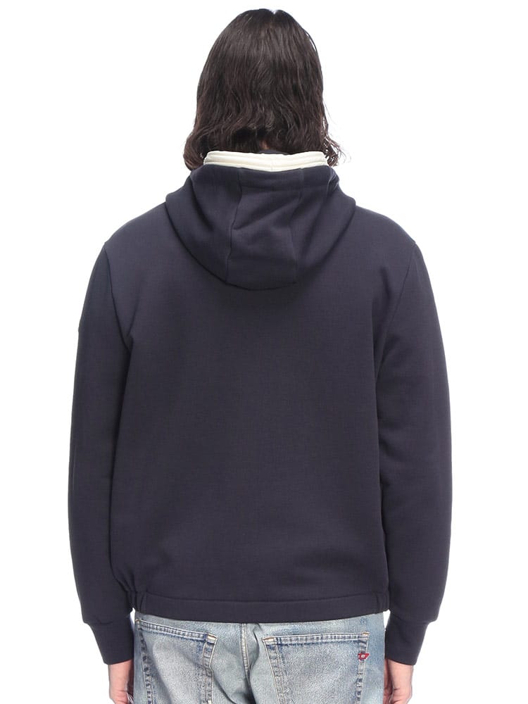 肌触りの良い上質なコットン100%のボディをベースに、異素材の別布パーツを巧みに組み合わせたハイブリッドなデザインが目を惹きます。胸元にはブランドの象徴であるロゴを配し、シンプルながらも圧倒的な存在感を放つ一着に。着こなしのニュアンスを自在に操れるダブルジップ仕様や、フィット感を高めるリブ仕上げなど、細部まで計算された機能美が光ります。春や秋のメインアウターから冬のインナー使いまで、シーズンレスに活躍する汎用性も魅力。都会的なリラックススタイルを格上げする、大人のワードローブに相応しい洗練されたフーディーです。