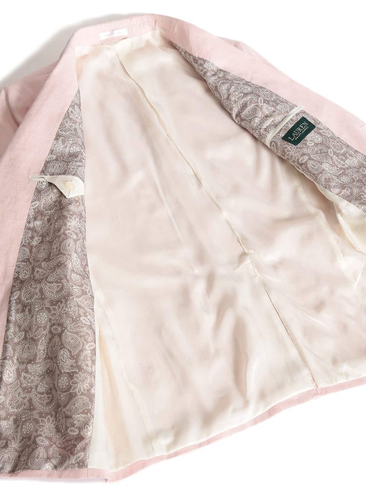 清涼感のある麻で仕上げたLAUREN RALPH LAURENのシングル 2ツ釦 ジャケット。無地のシンプルなデザインで素材の良さが際立つ逸品。洗練されたデザインだから、ビジネスシーンにはもちろん、カジュアルなボトムスとのジャケパンスタイルにも着まわしのできる便利なアイテムです。