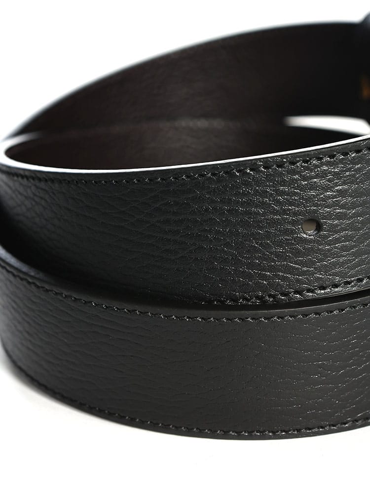 ダブルG バックルがあしらわれたテクスチャードレザーのリバーシブル レザー ベルト。このハードウェアは、グッチがグラマラスなファッションをリードした70年代のアーカイブデザインにインスピレーションを得たものです。