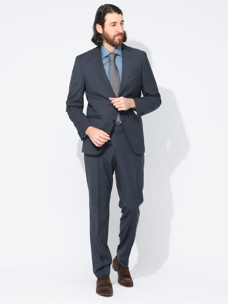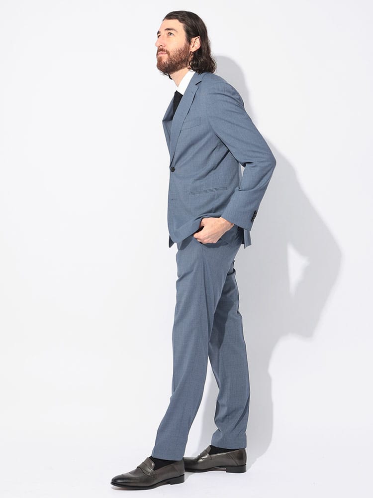 仕様 :ジャケット外側ポケット数×3つ / 内側ポケット数×2つ / シングル2つボタン / 半裏 / 額縁あり / セッパタイプ / サイドベンツ / スラックスポケット数×4つ / ジップフライ / ノータック / ストレッチ