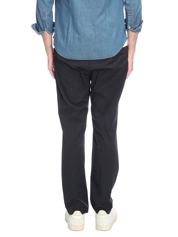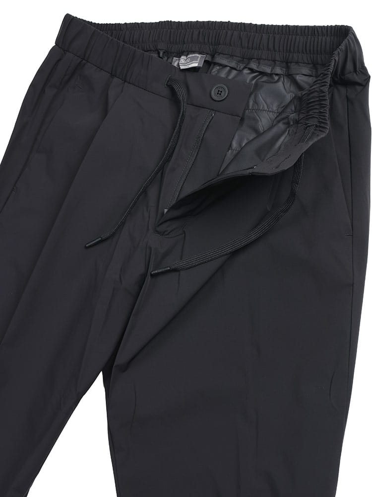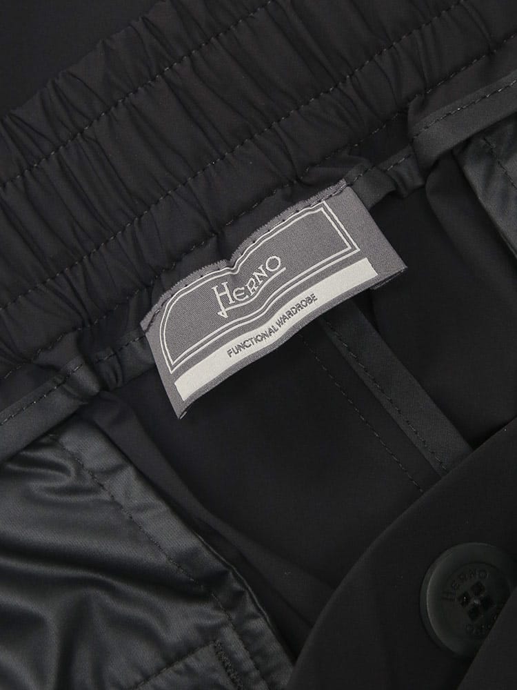 洗練された都会的なスポーツスタイルを提案するHERNO(ヘルノ)のストレッチナイロンパンツ。ポリエステルを混紡した独自の高機能ナイロン素材は、驚くほど滑らかな肌触りと優れた伸縮性を誇り、長時間の着用でもストレスフリーな履き心地をキープします。フロントに施されたワンタックが腰回りに程よいゆとりを与えつつ、裾に向かって緩やかにテーパードする美しいシルエットが、大人の品格を漂わせるスラックス顔の仕上がりに。ウエストゴム仕様による高いフィット感と、バックポケットのさりげないブランドロゴが機能美とステータスを両立させます。ビジネスカジュアルから週末のリラックススタイルまで、オンオフの境界を自由に超えて活躍する、汎用性に優れた至高のトラウザーズです。