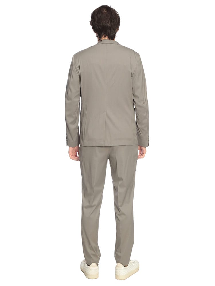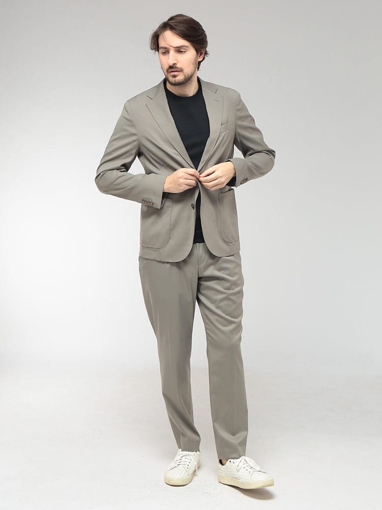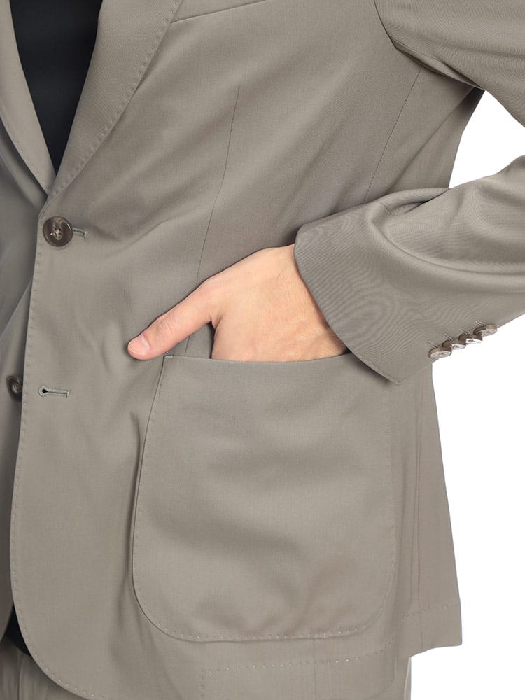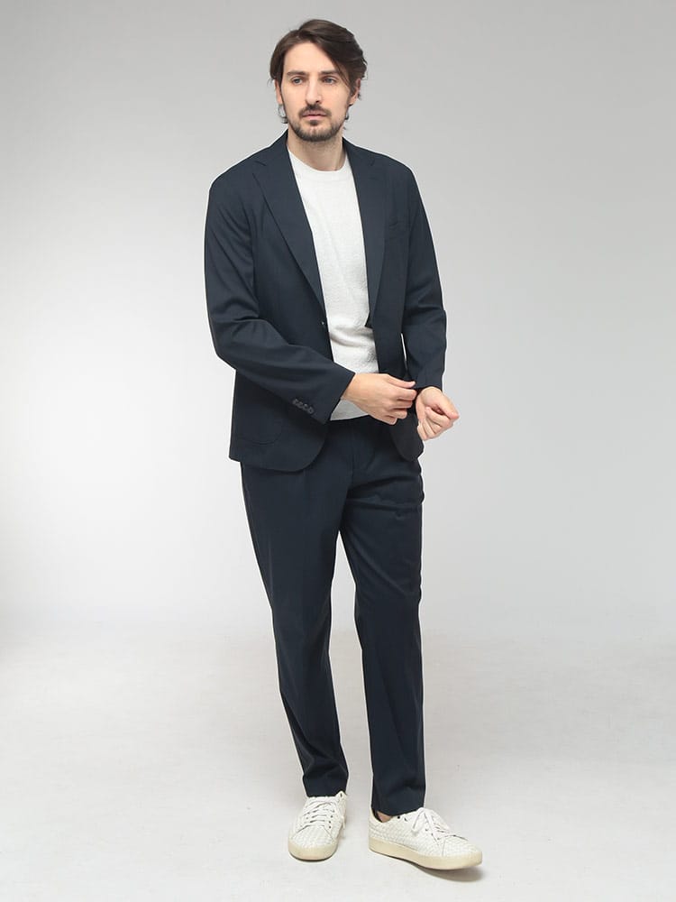 現代のビジネスシーンに革新をもたらすストレッチウールスーツが登場。上質なウールの品格ある光沢感はそのままに、驚異的な伸縮性を備えたハイテク素材が、長時間の着用でもストレスフリーな極上の着心地を実現しました。ジャケットは洗練されたシングル2つボタンのシルエットで、セッパタイプや額縁仕上げなど細部まで職人技が光る本格仕様。パンツはトレンドのワンタックを採用し、ウエストゴム仕様にすることで、フォーマルな外見とリラックスした履き心地を両立させました。計9つの豊富なポケットなど機能美も追求。出張から重要な商談、ビジカジまで、大人の余裕と自信を演出する至高のセットアップです。