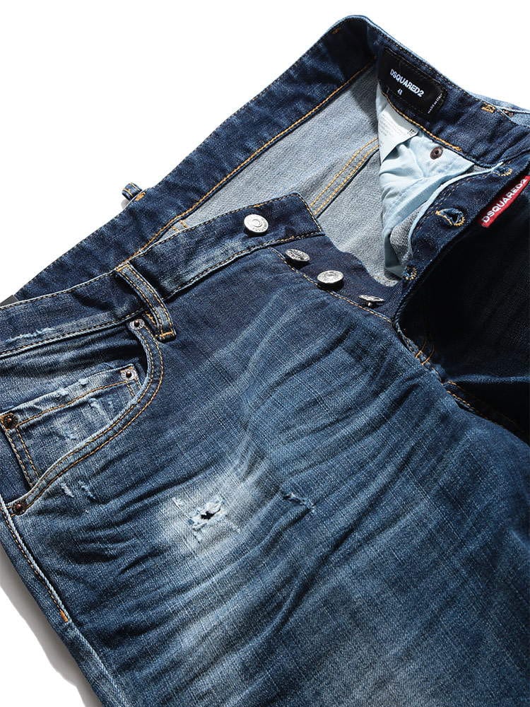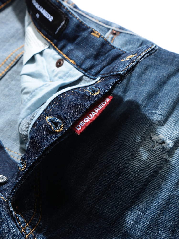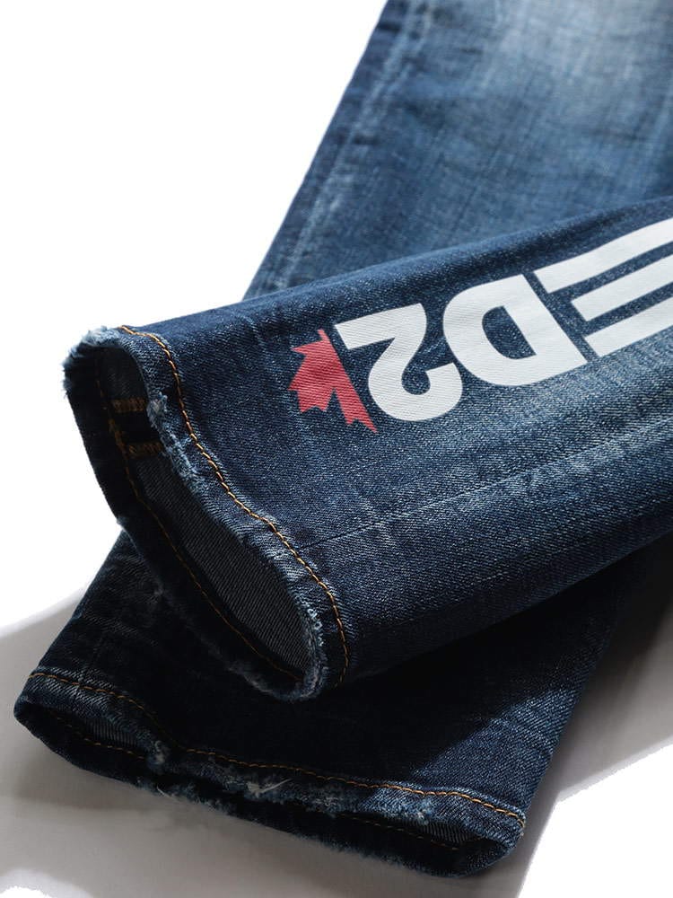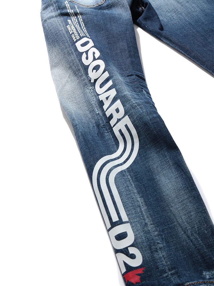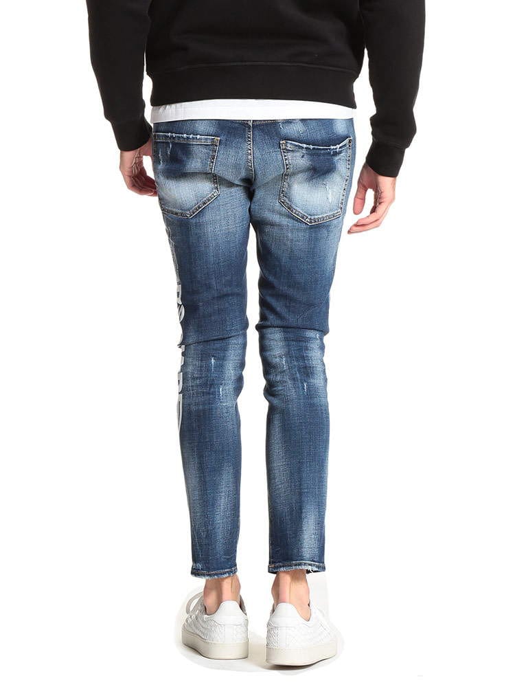 ・クールなダメージ加工と左足サイドのロゴプリントデザインのボタンフライ ジーンズ SKATER