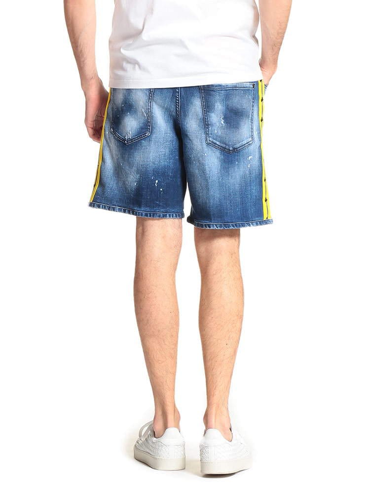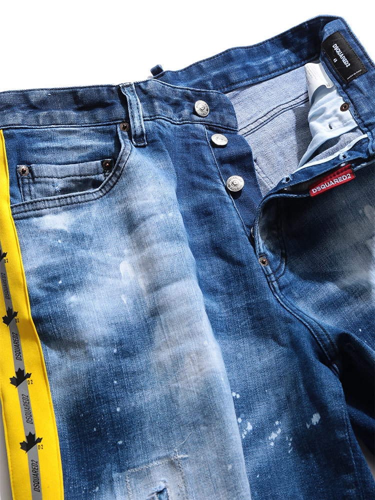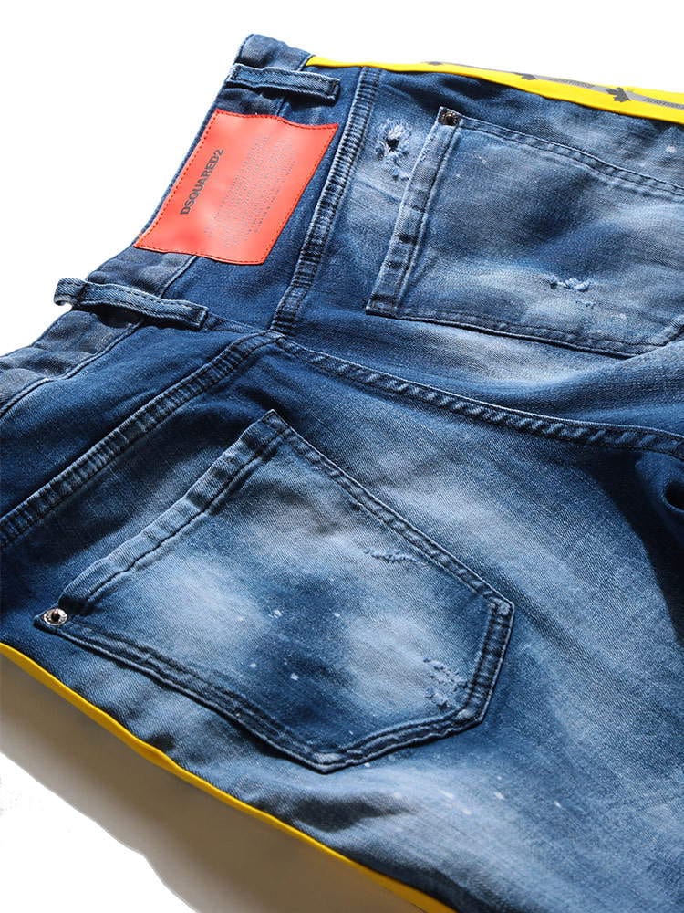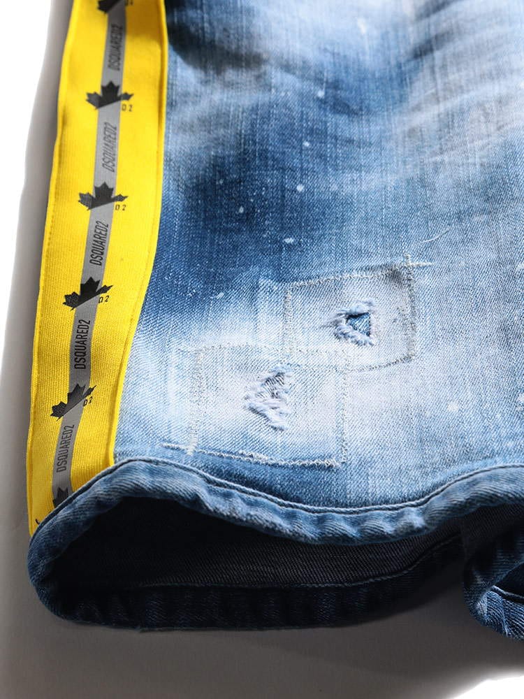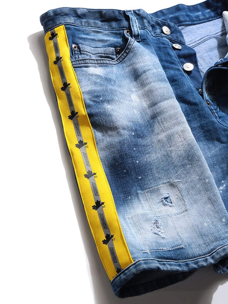 ・クールなダメージ加工とペイント、サイドテープデザインのボタンフライ デニム ショートパンツ